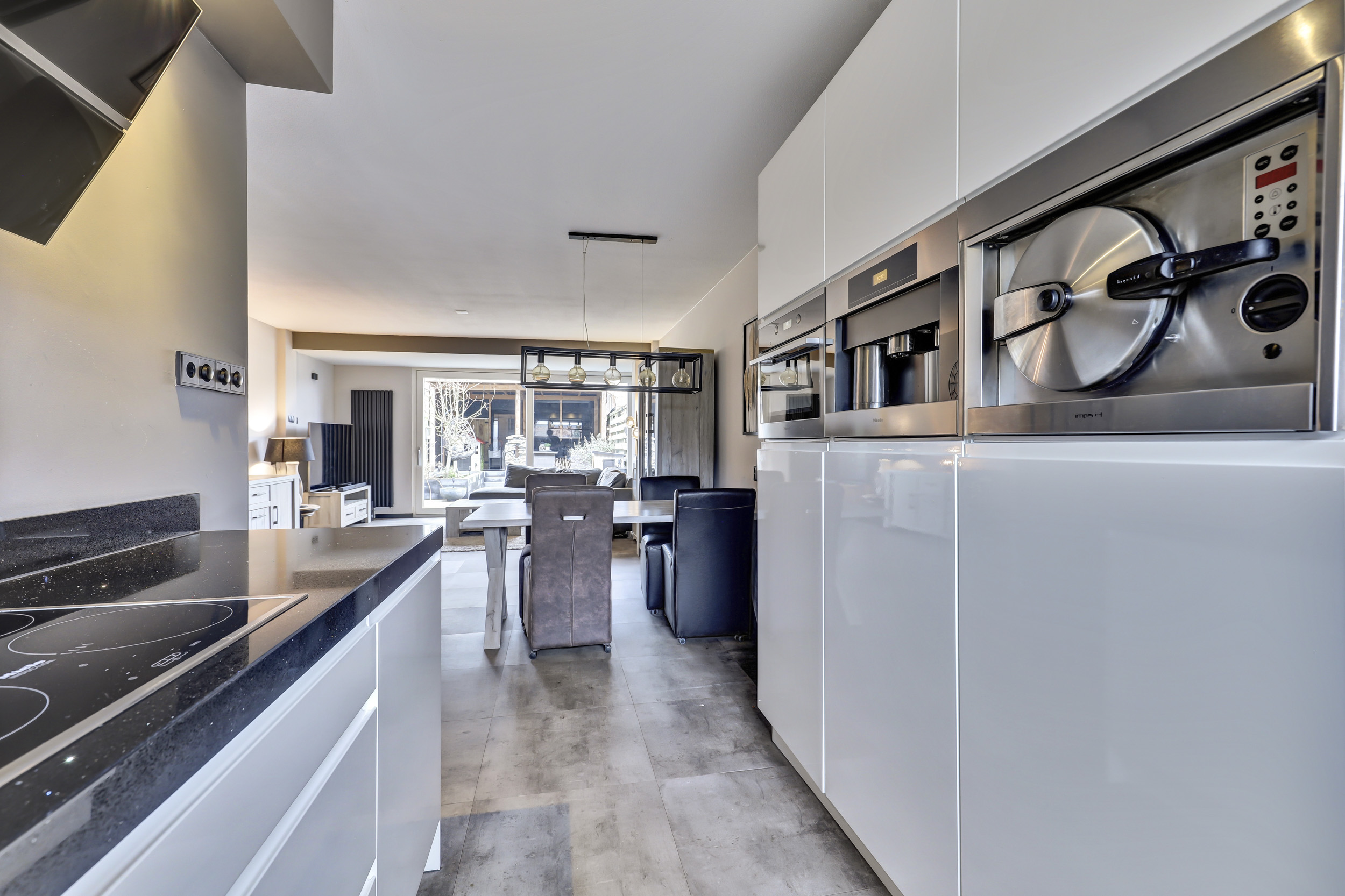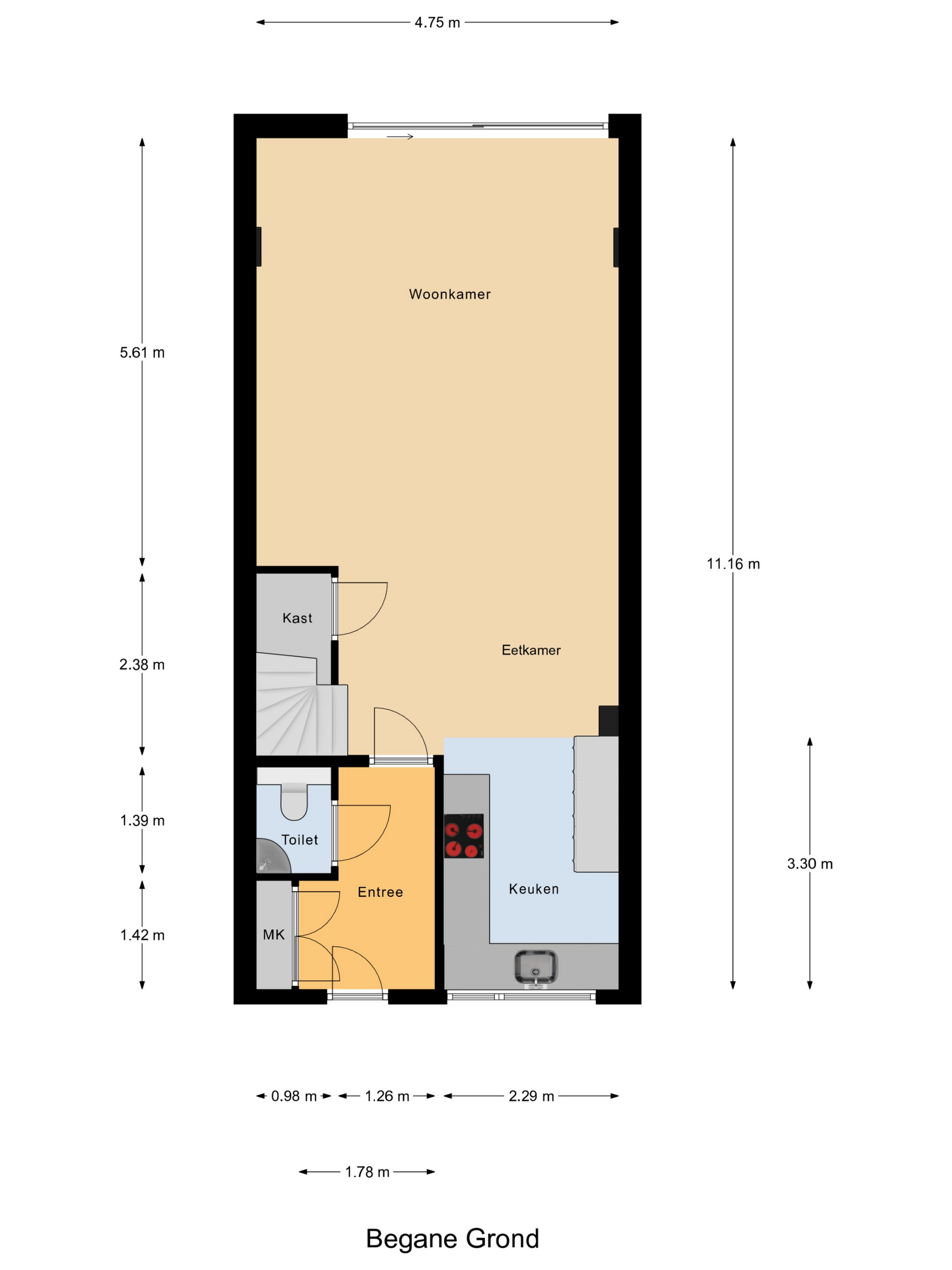 Begane grond: entree, hal met vernieuwde meterkast (2025), garderobe en toiletruimte voorzien van een vrij hangend toilet en fontein. Aan de voorzijde van het woonhuis een open keuken (2021) welke is voorzien van een combi-magentron, stoomoven, koffiemachine, koelkast en vriezer, quooker, vaatwasser, keramische kookplaat en afzuigkap.