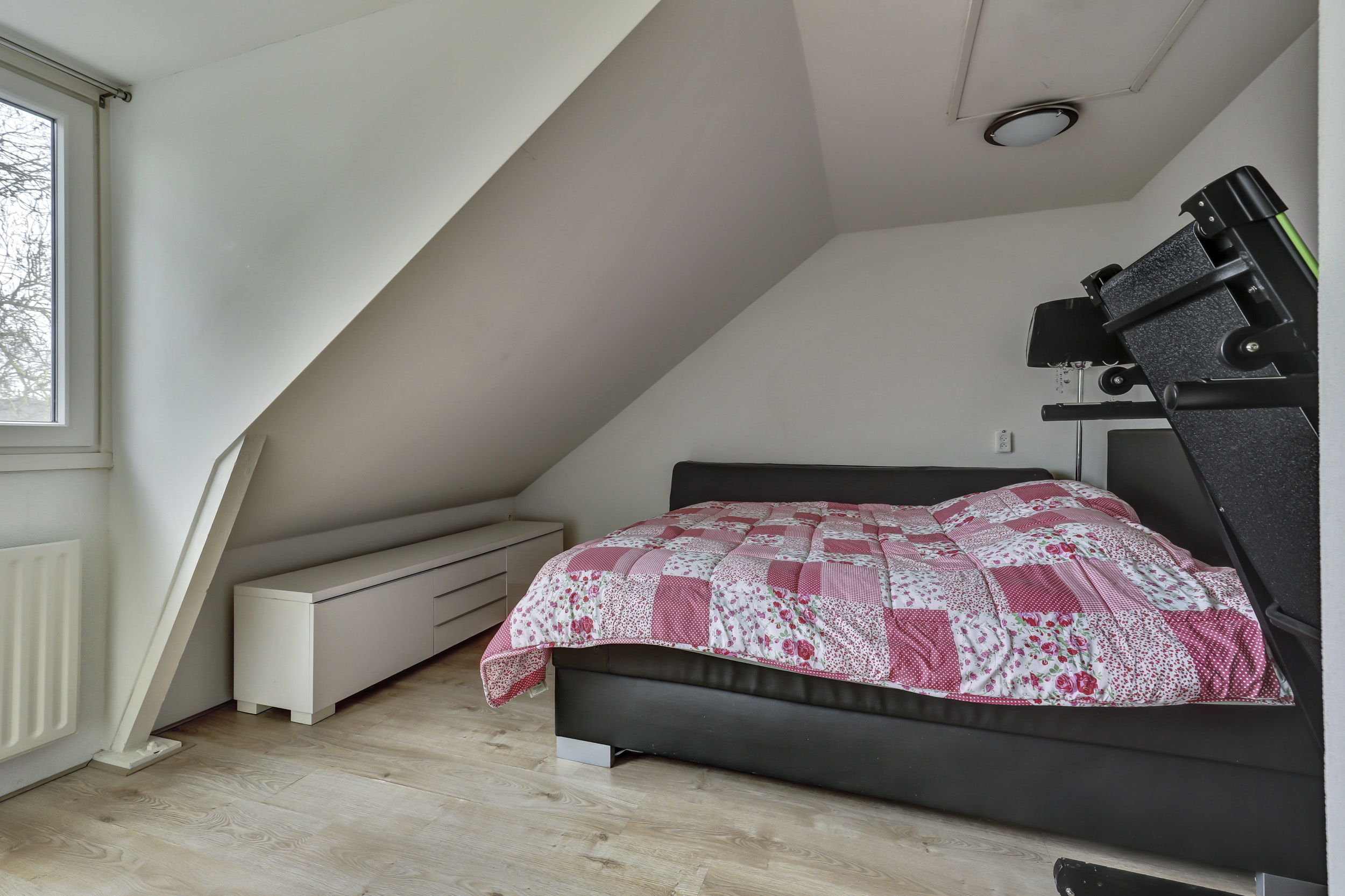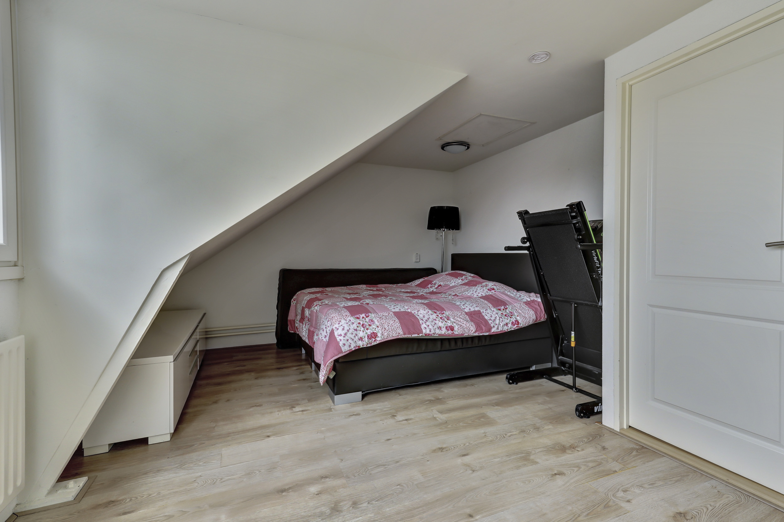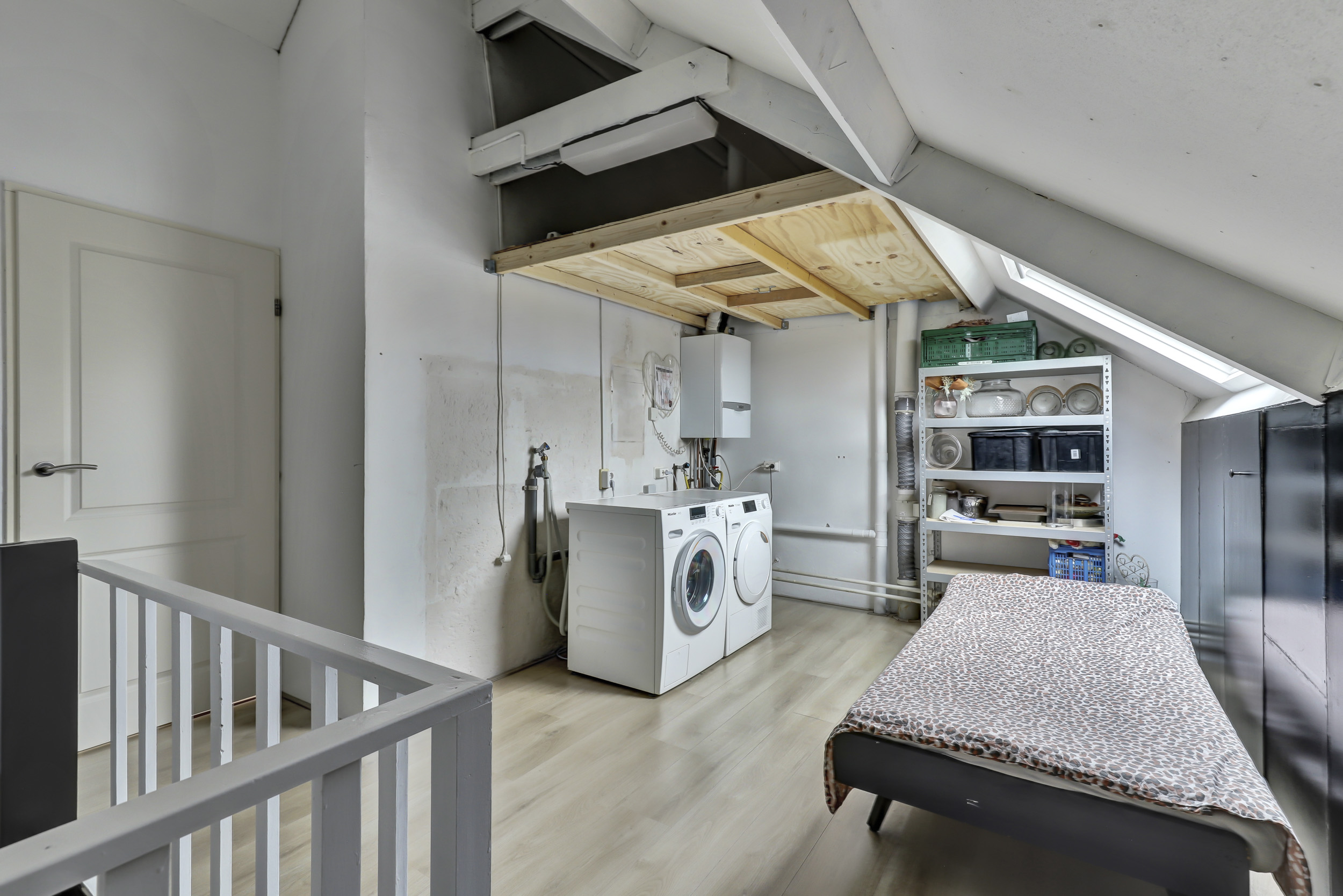 Tweede verdieping: ruime overloop met c.v.-opstelling (Vaillant combi-ketel, 2015, eigendom). Tevens een dakvenster voor voldoende daglichttoetreding. Veel bergruimte achter de knieschotten. Ruime derde slaapkamer met een dakkapel. Bovendien is er op de tweede verdieping airconditioning aanwezig.