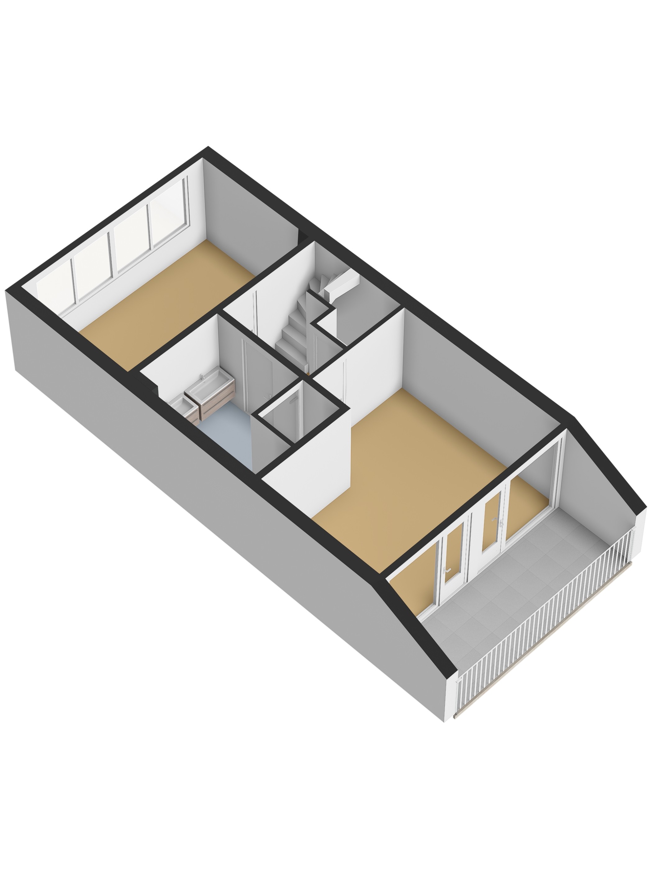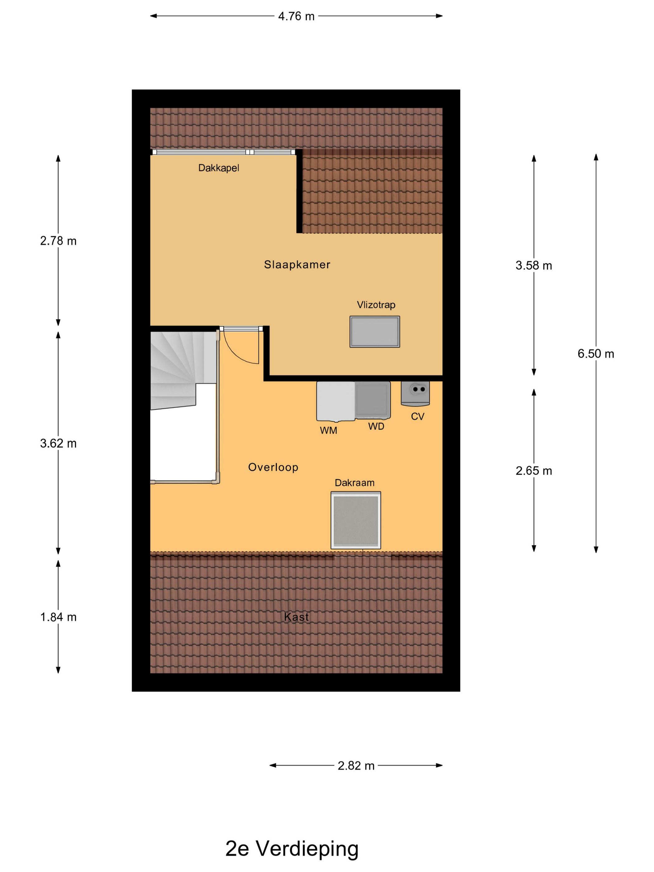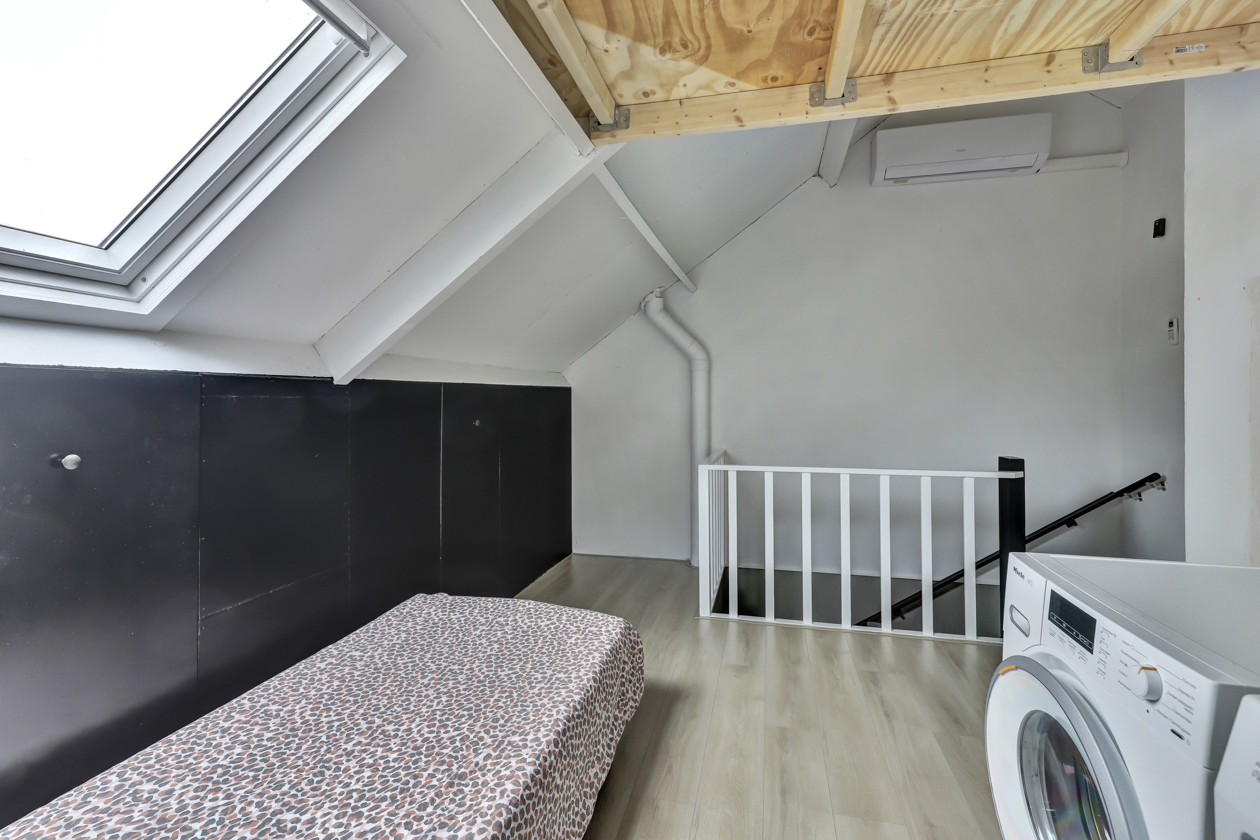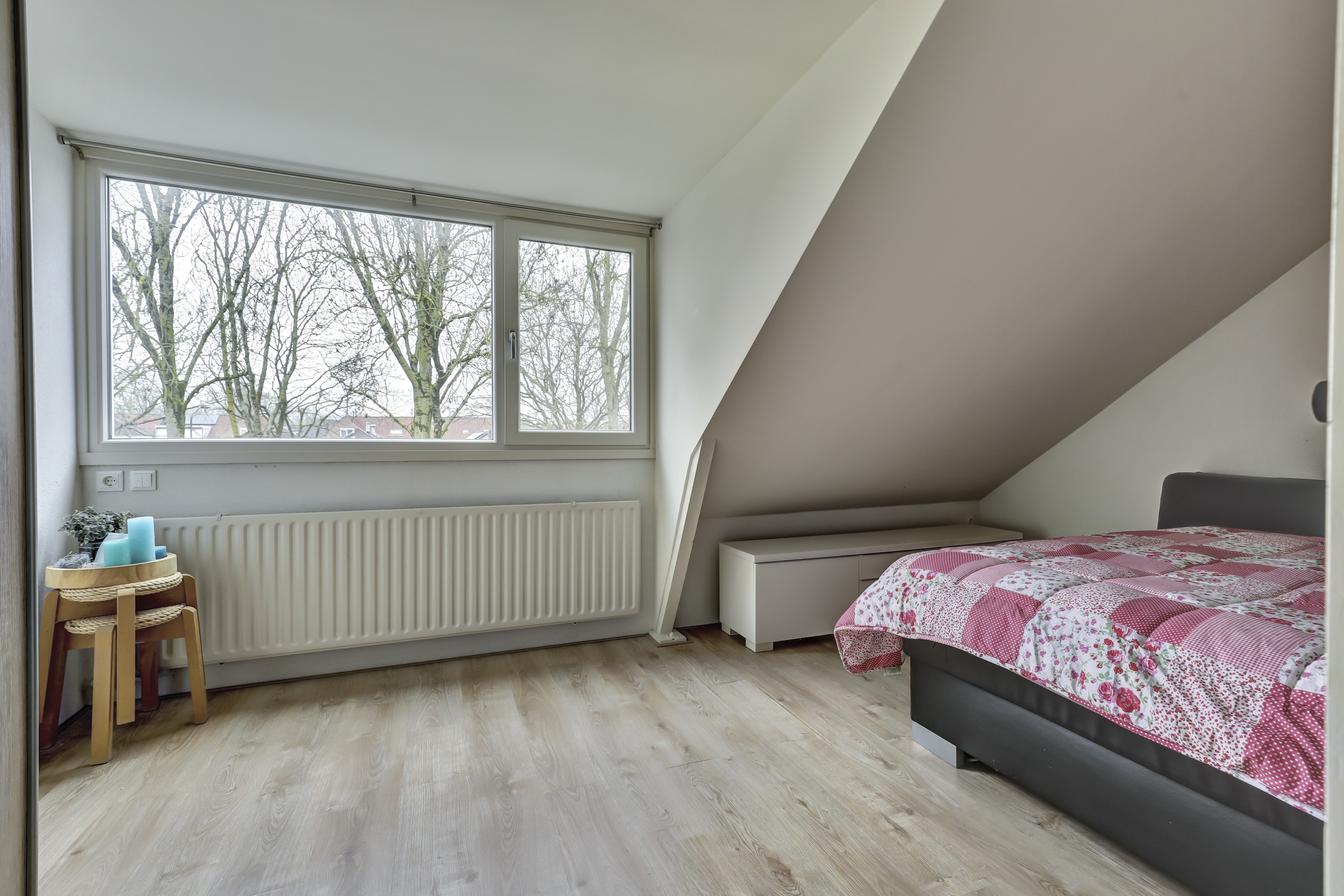 Tweede verdieping: ruime overloop met c.v.-opstelling (Vaillant combi-ketel, 2015, eigendom). Tevens een dakvenster voor voldoende daglichttoetreding. Veel bergruimte achter de knieschotten. Ruime derde slaapkamer met een dakkapel. Bovendien is er op de tweede verdieping airconditioning aanwezig.