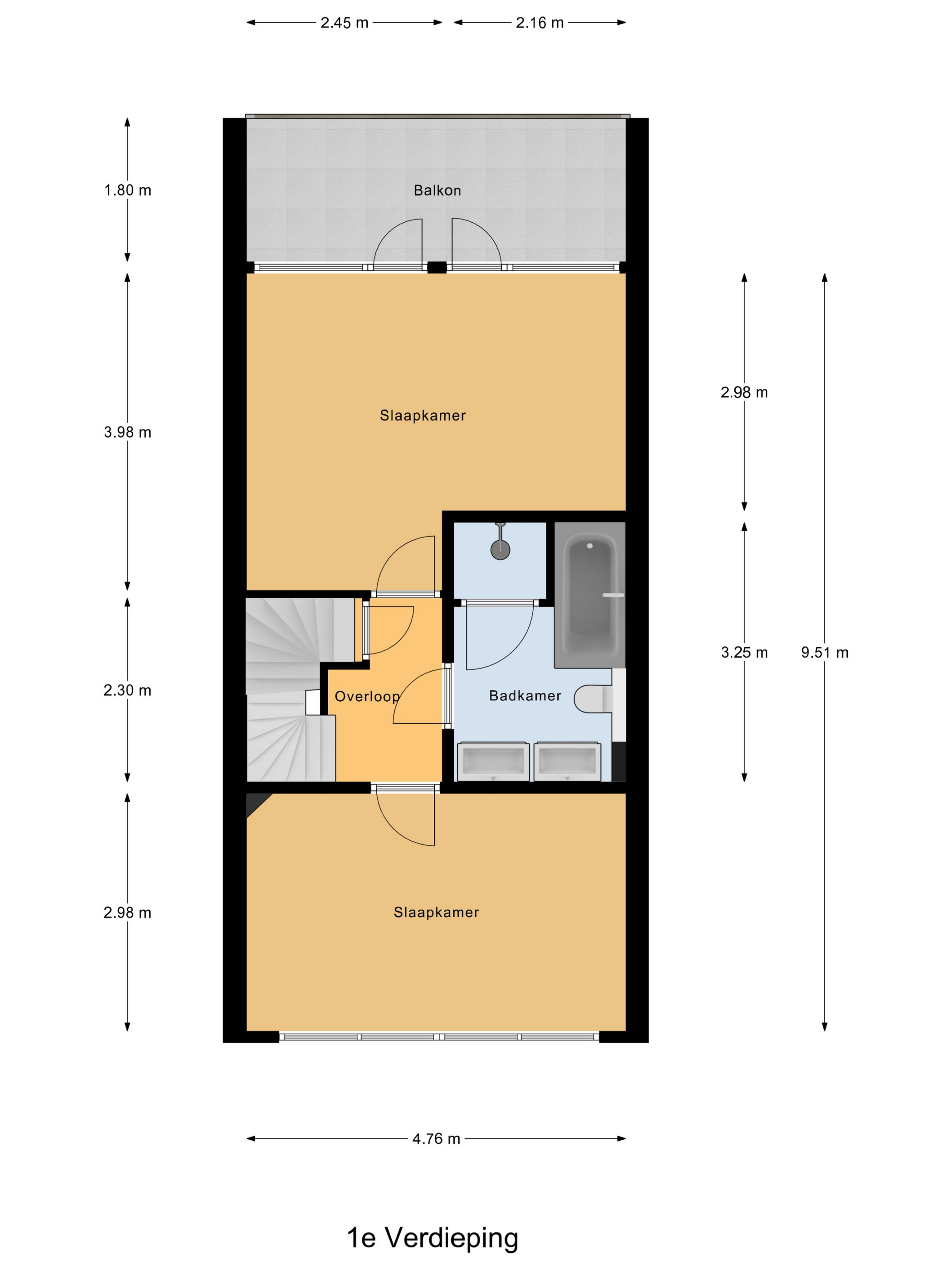 Eerste verdieping: overloop, 2 ruime slaapkamers en een badkamer. De slaapkamer aan de achterzijde van de woning beschikt over een groot balkon over de gehele breedte van het woonhuis. De moderne badkamer is voorzien van een inloopdouche, een dubbel wastafelmeubel (2021), ligbad en een vrij hangend toilet. Tevens elektrische vloerverwarming.