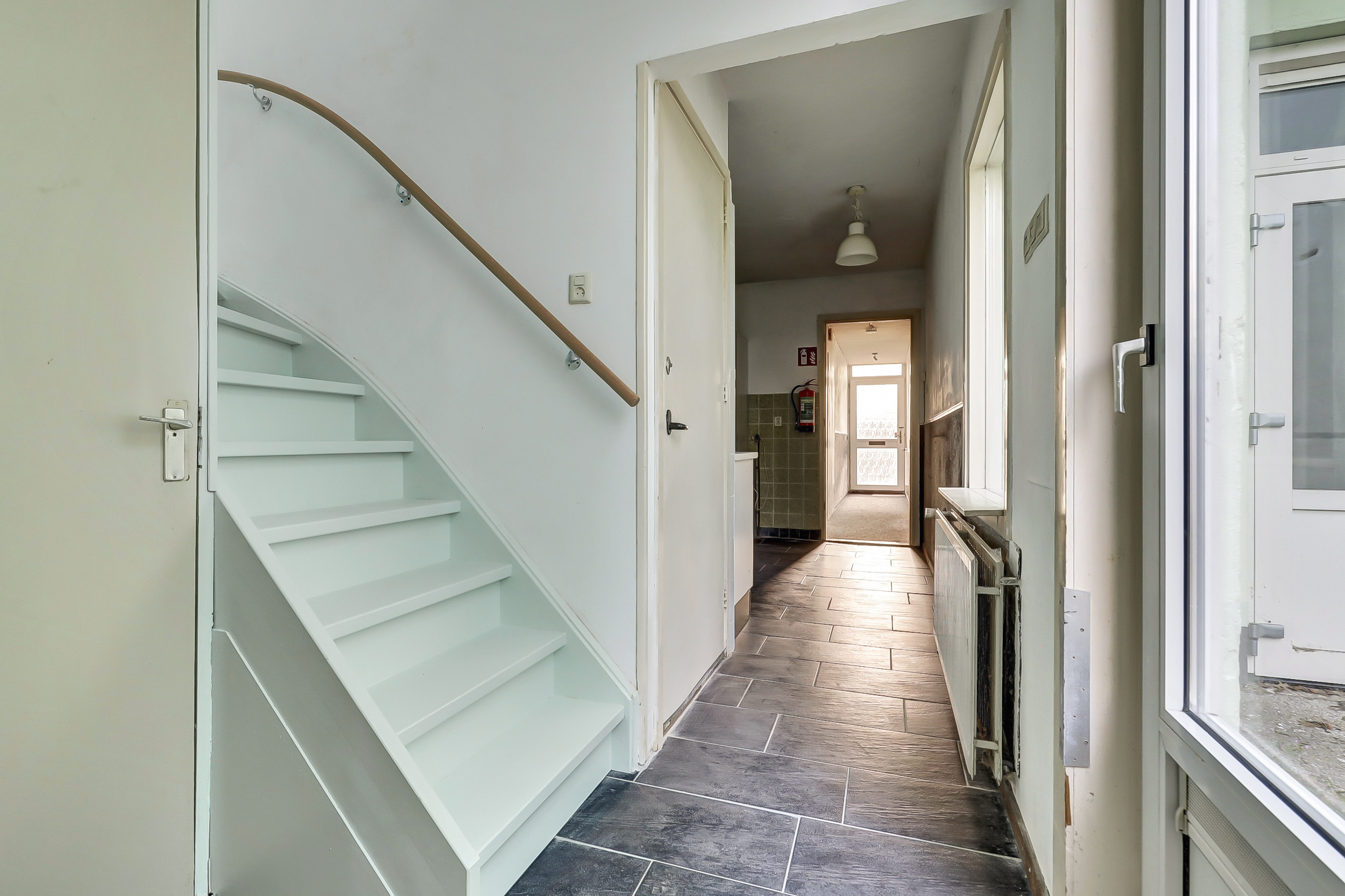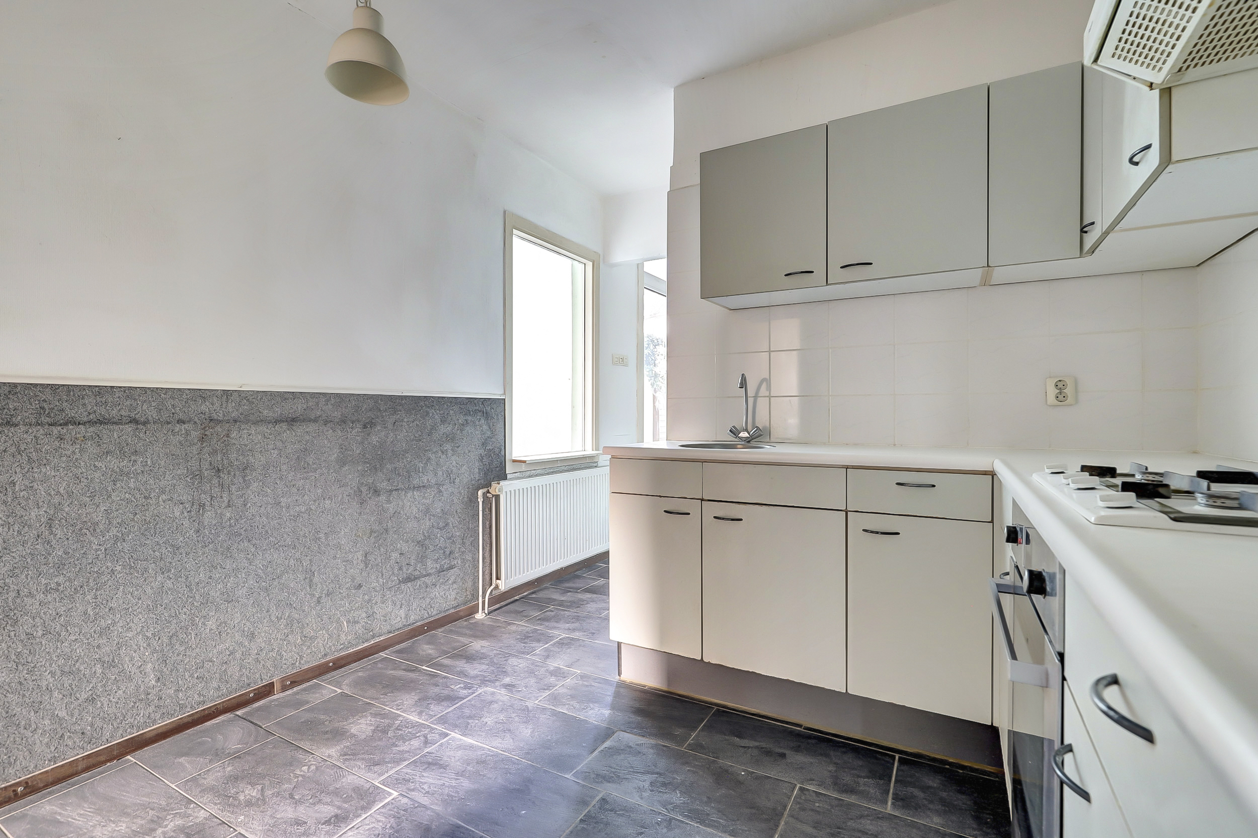Je komt binnen in de hal die direct toegang geeft tot het toilet met fontein, de meterkast en de woonkamer. Aan de voorzijde opent de woonkamer zich met een karakteristieke erker, hoge raampartijen met praktische rolluiken. Hier valt het daglicht royaal binnen en ervaar je direct de sfeer van het bouwjaar.