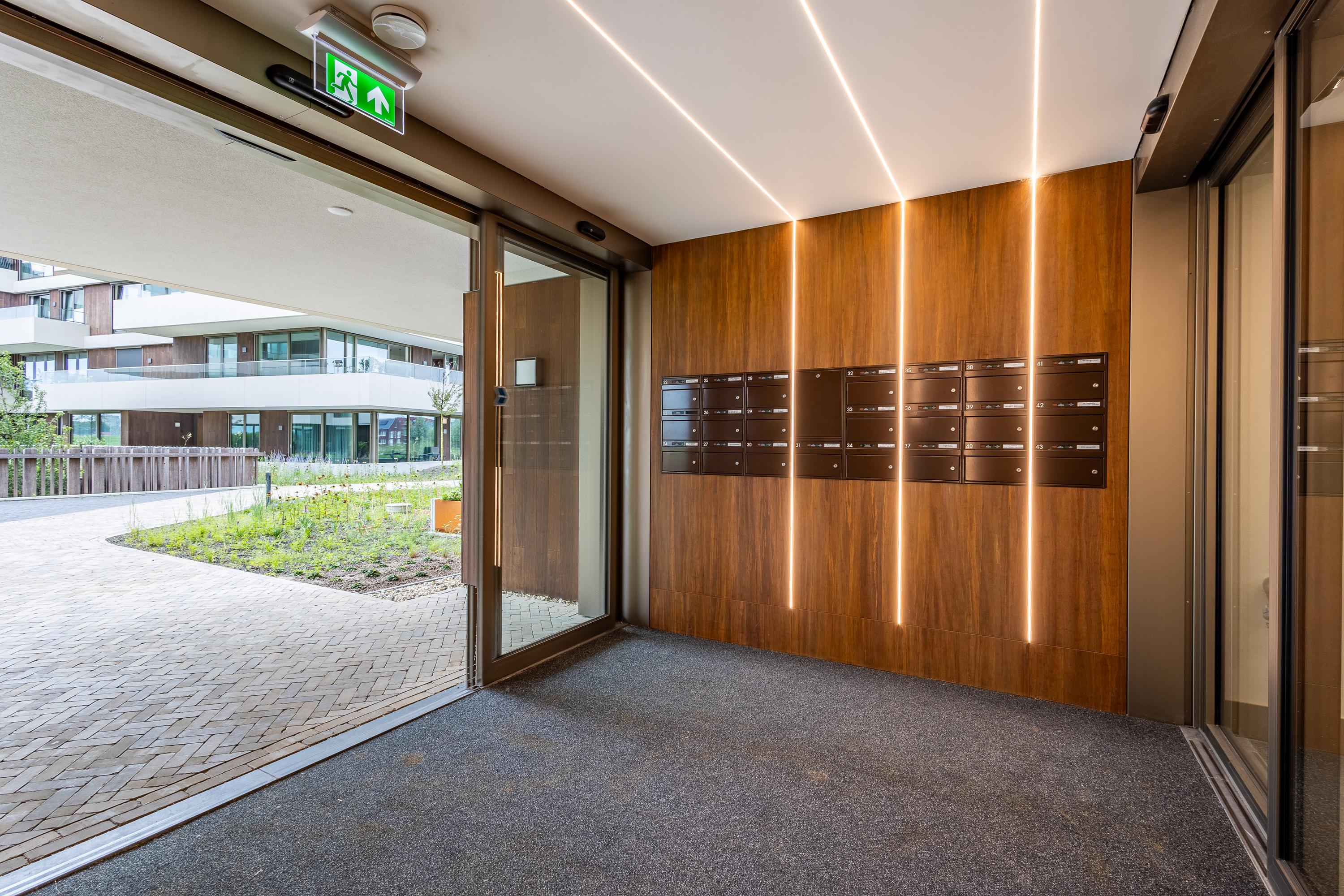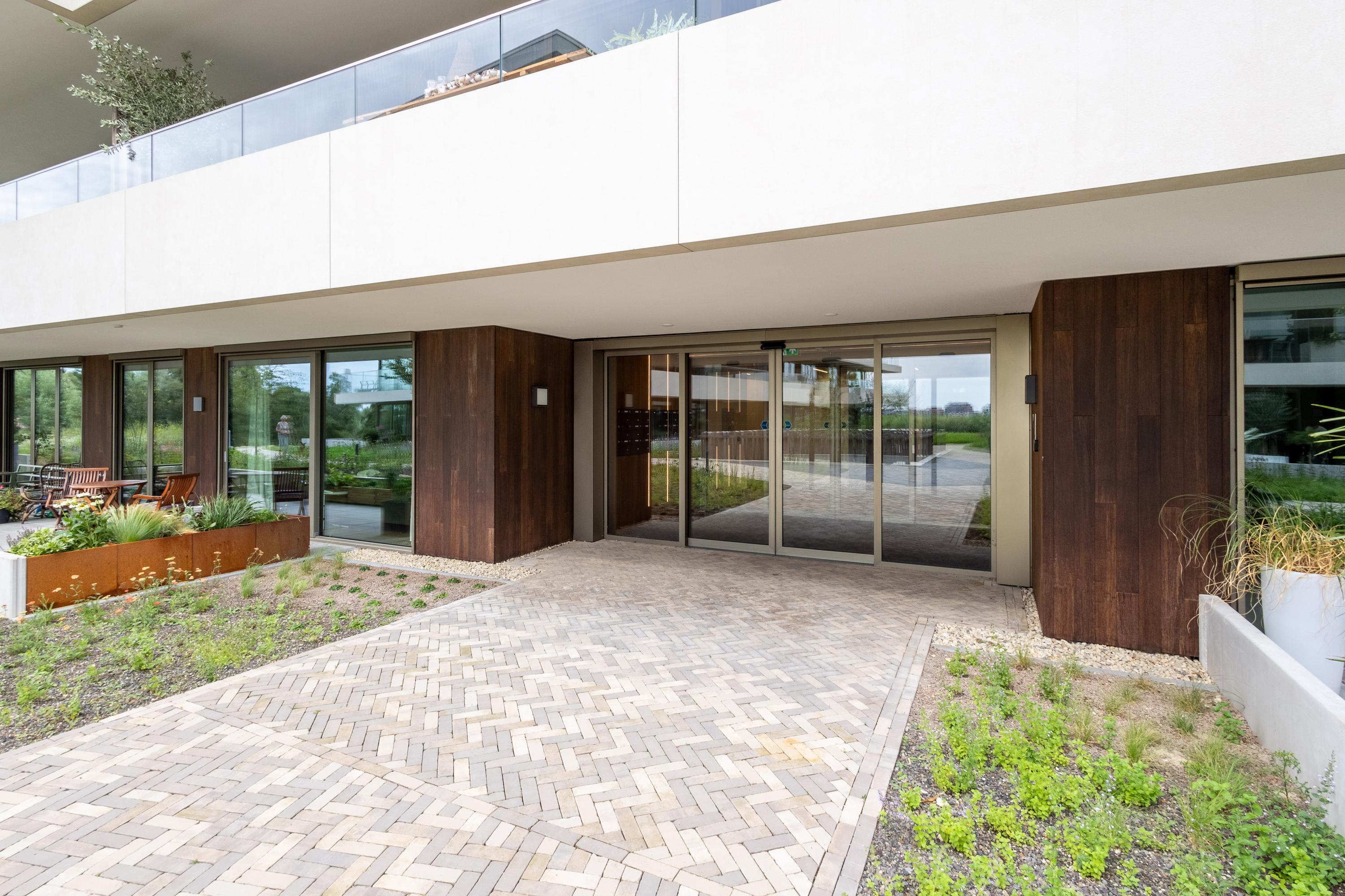 De entree van het complex Robie House is ruim opgezet en heeft een luxe uitstraling. Vanuit de parkeergarage (begane grond) kun je als bewoner de lift of trap nemen naar de 5e verdieping. De dubbele lift beperkt het wachten tot een minimum. Bezoekers hebben de mogelijkheid om te parkeren in de parkeergarage op de bezoekers plaatsen. Altijd voldoende plaats voor uw bezoek. Vanuit de parkeergarage kunnen bezoekers via de trap naar de daktuin waar de entree van het Robie House zich bevindt. Zowel de parkeergarage als de entree van het Robie House zijn voorzien van een intercomsysteem met videofunctie.
