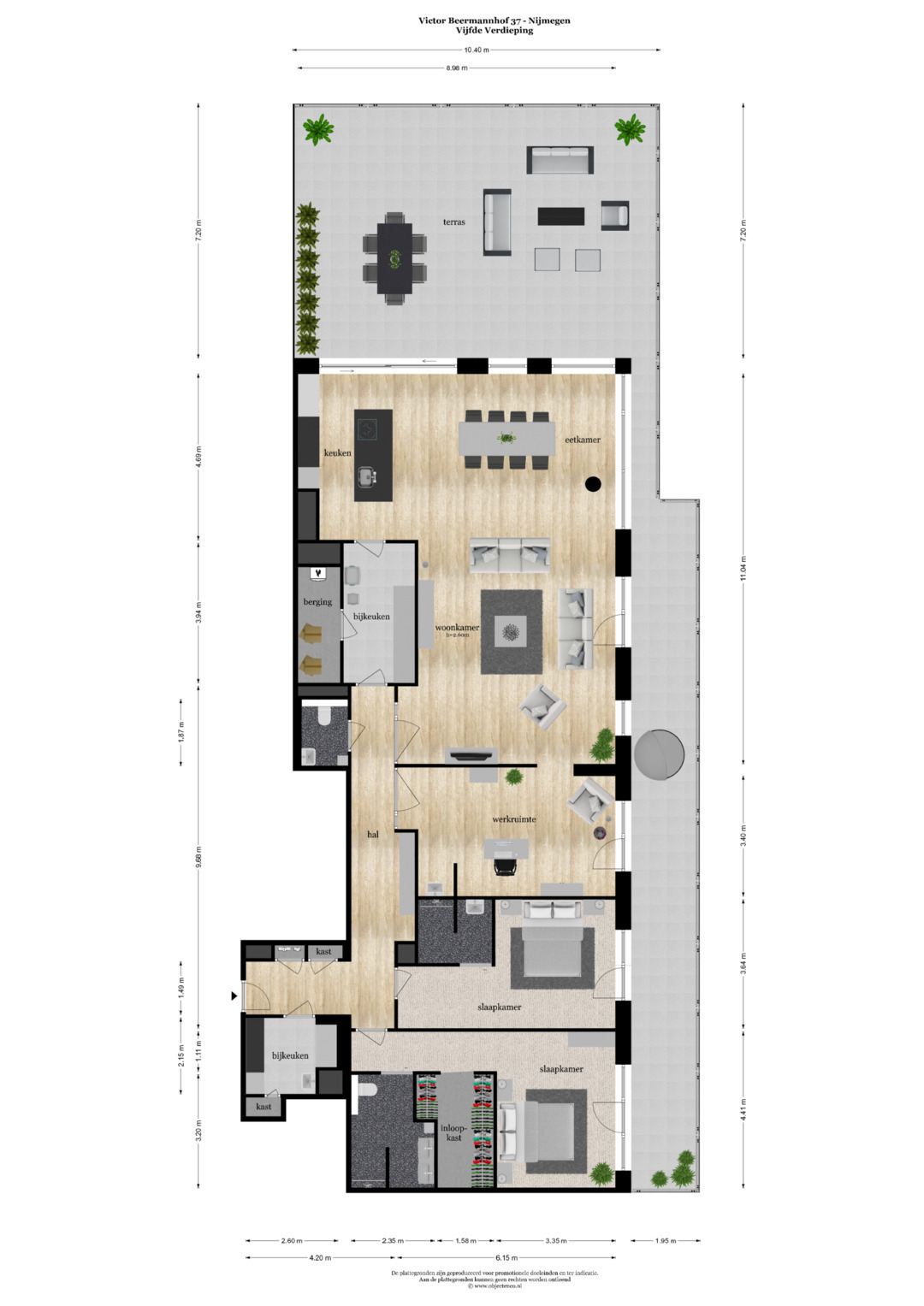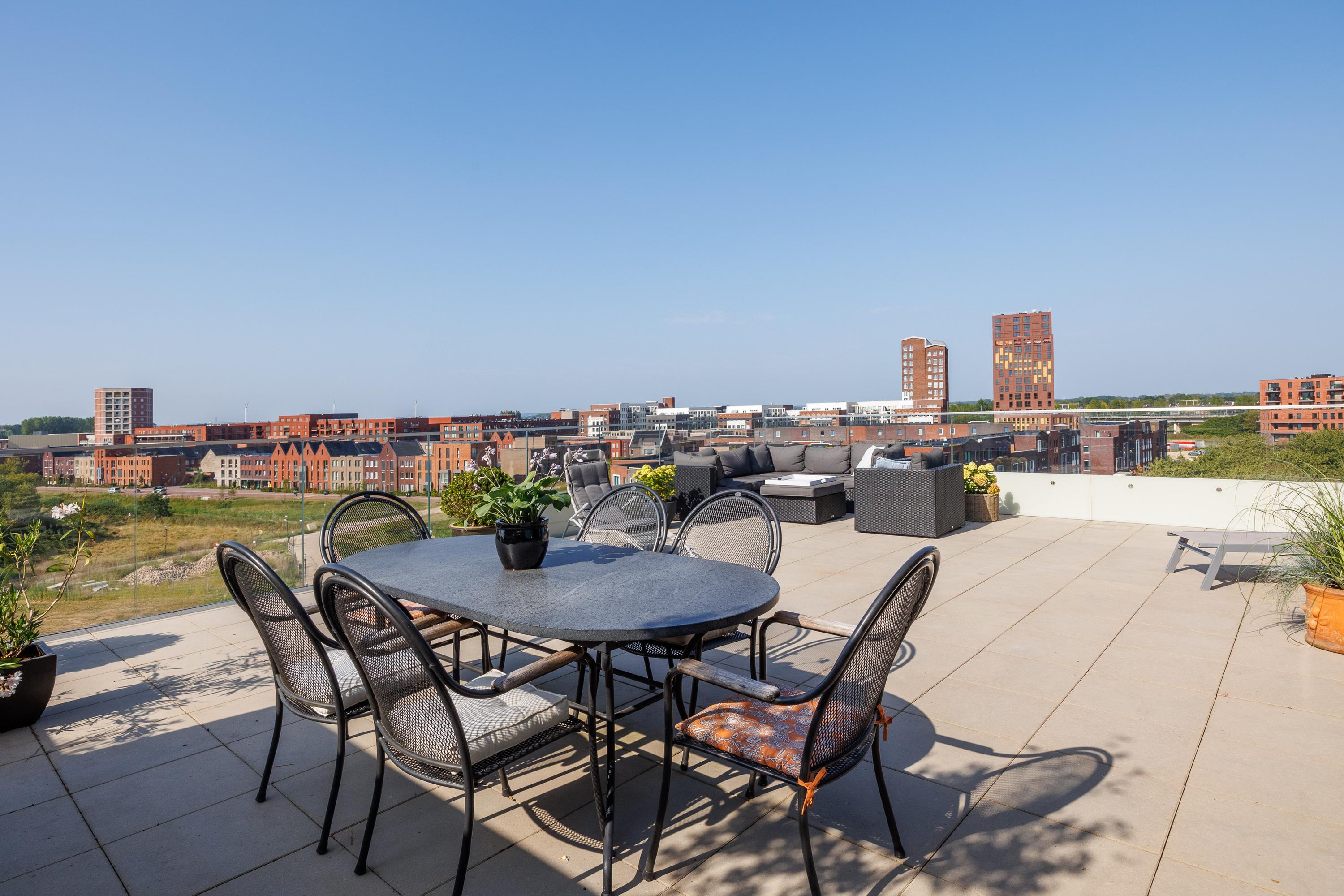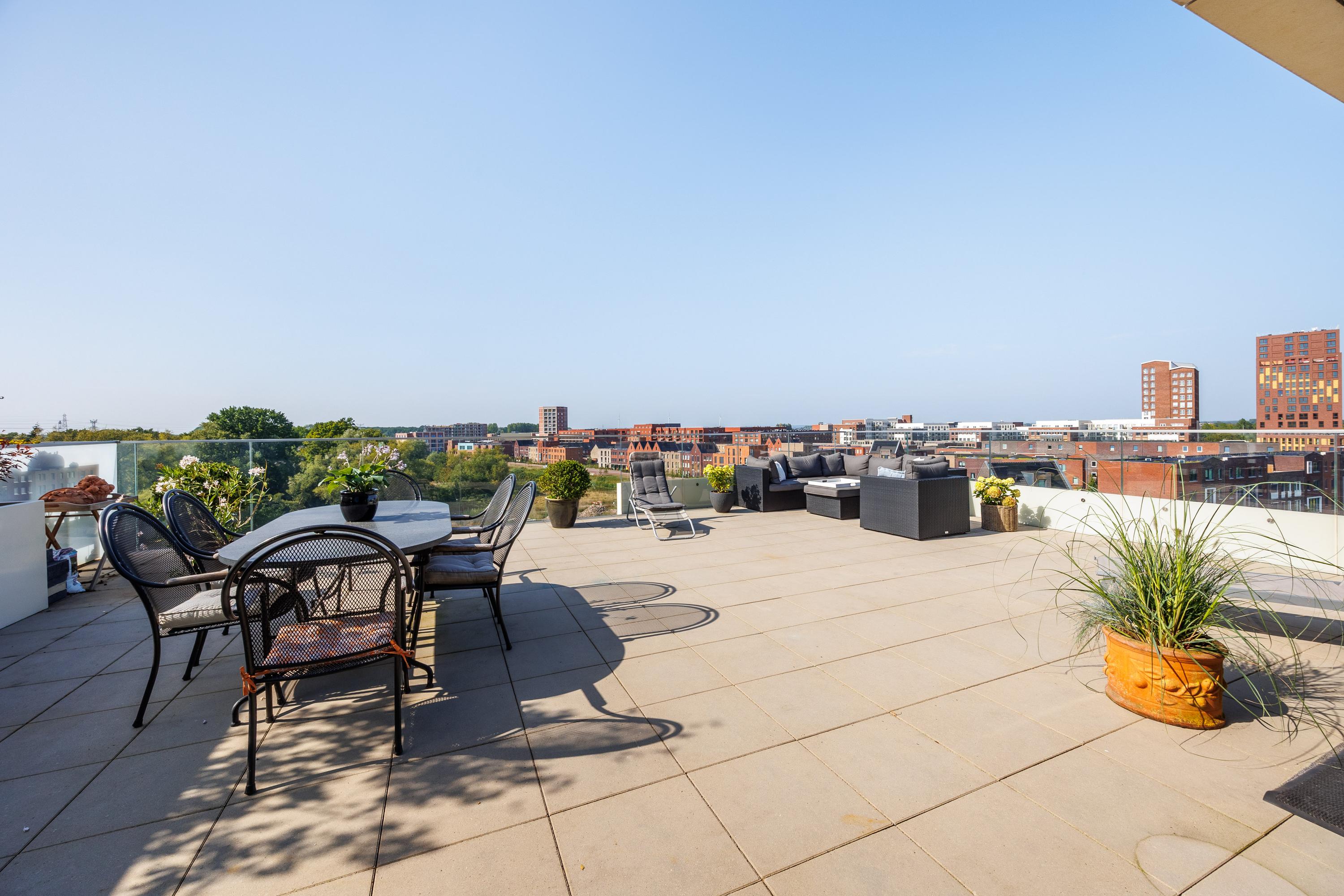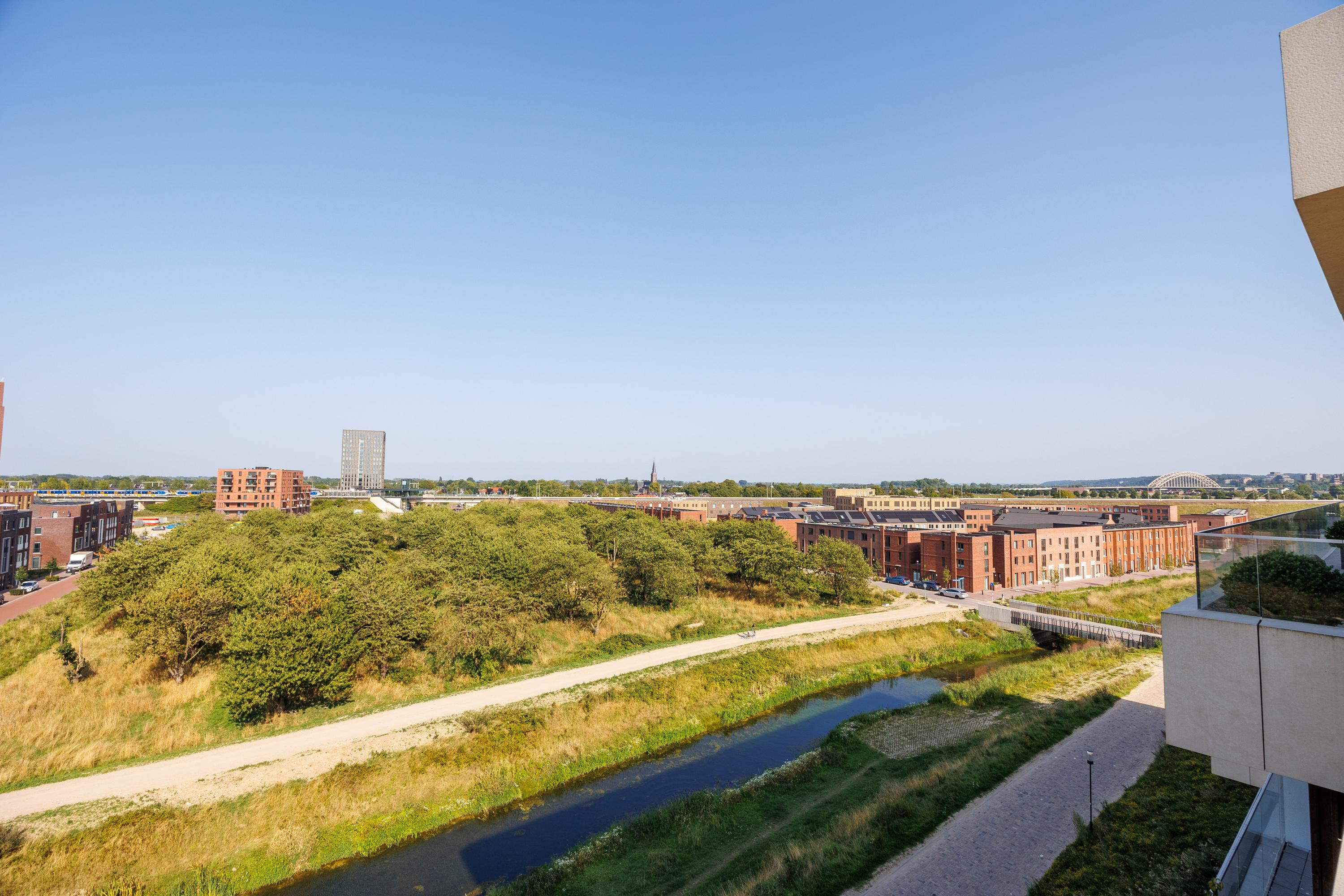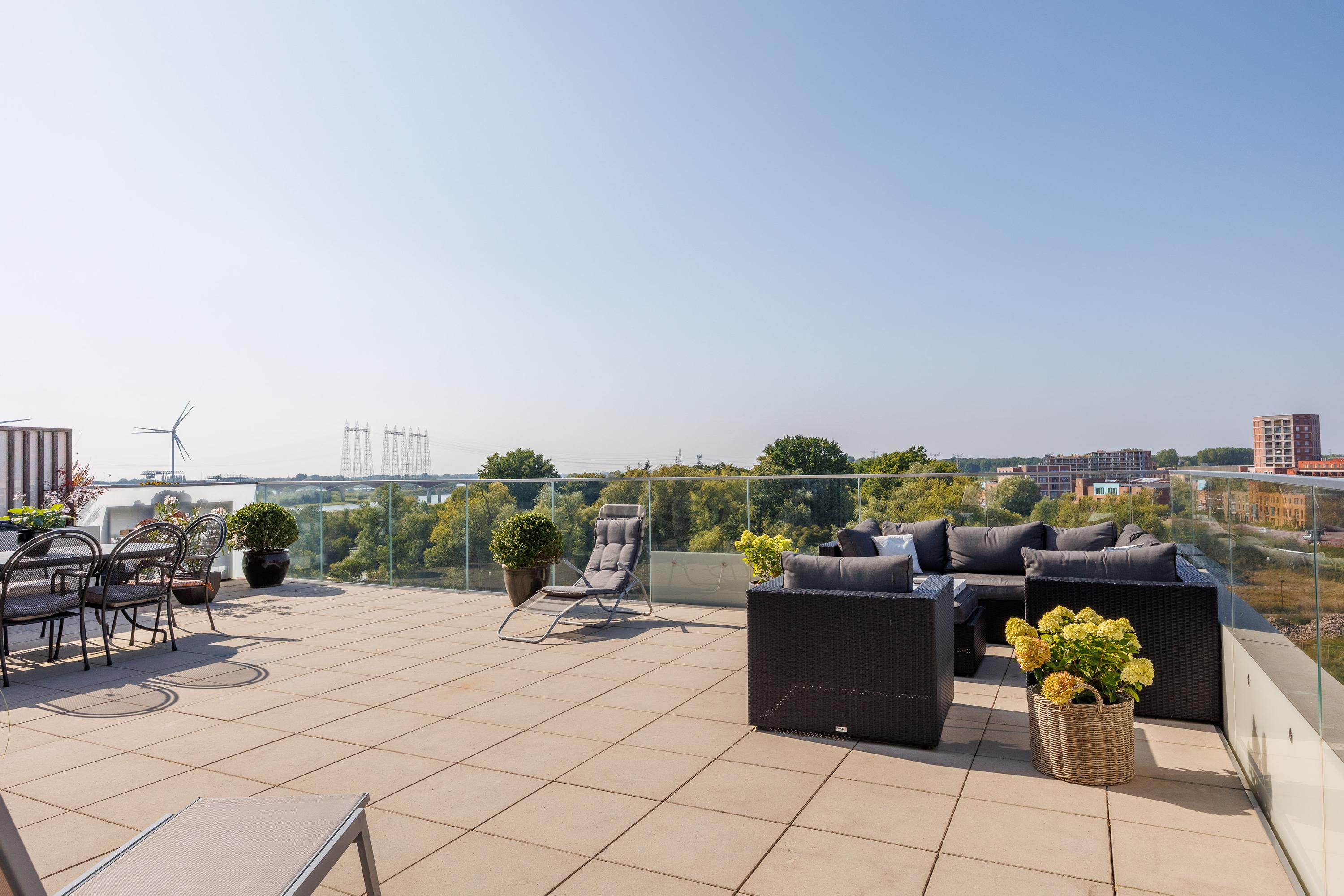 Het penthouse is hoogwaardig afgewerkt, en in overleg op korte termijn beschikbaar. Gelegen op de 5e verdieping van het Robie House, biedt dit penthouse de beste zonligging van het complex. Niet alleen de hele dag zon, maar ook de hele dag schaduw. Iets om serieus bij stil te staan in deze tijd. Alle ramen hebben weliswaar blinds, maar die zijn niet echt nodig om de zon buiten te houden. In de morgen geniet je van de zonsopgang tot ongeveer 11 uur op het zijterras, en al vanaf 11 uur heb je ook al volop zon op het grote terras op het noordwesten. Vanaf het grote terras heb je weids uitzicht op de Spiegelwaal en Fort Beneden Lent. Vanaf het zijterras kijk je uit over de Kersenboomgaard tot aan station Lent, met z’n prachtige bloesem in april.