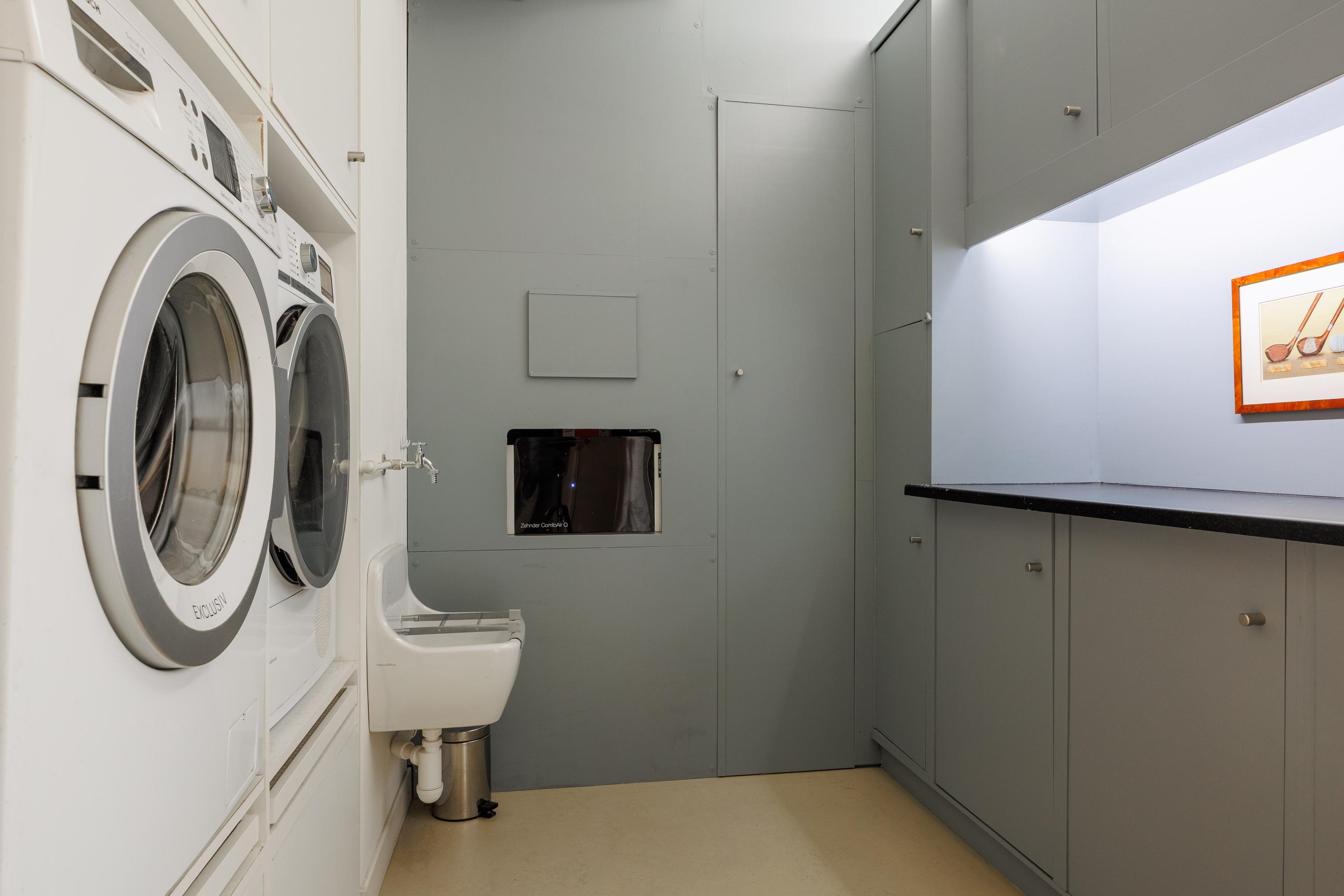 Entree, ruime hal met garderobe nis volledig afgewerkt, ruim separaat toilet, twee bergingen met technische installaties en dubbele meterkast met afleverset voor de stadsverwarming en waterontharder. Grote technische ruimte volledig ingericht als waskamer, met inbouwkast voor wasmachine, droger en een uitstortgootsteen. Verlichting per ruimte ingeregeld met Hue systeem.