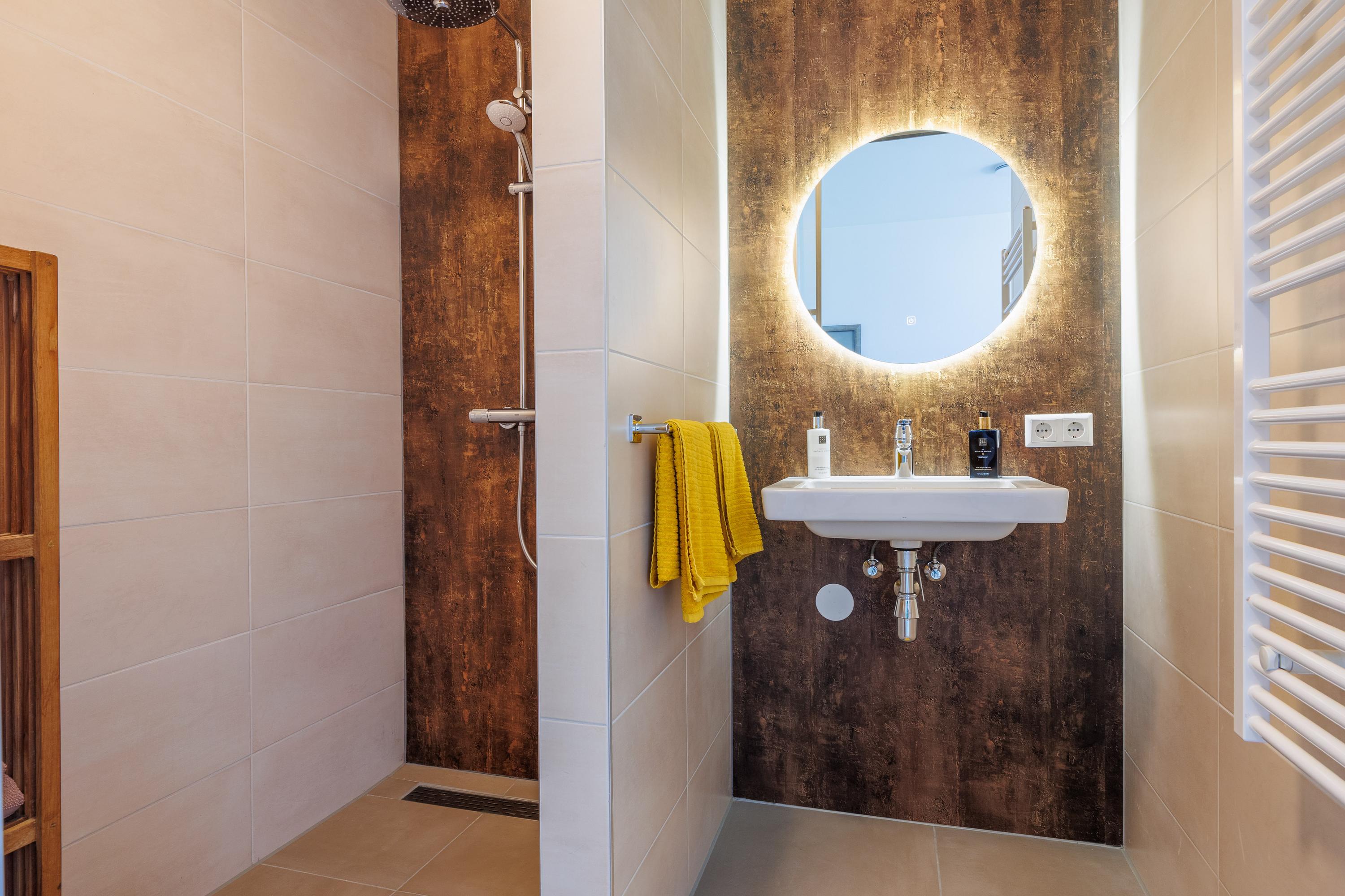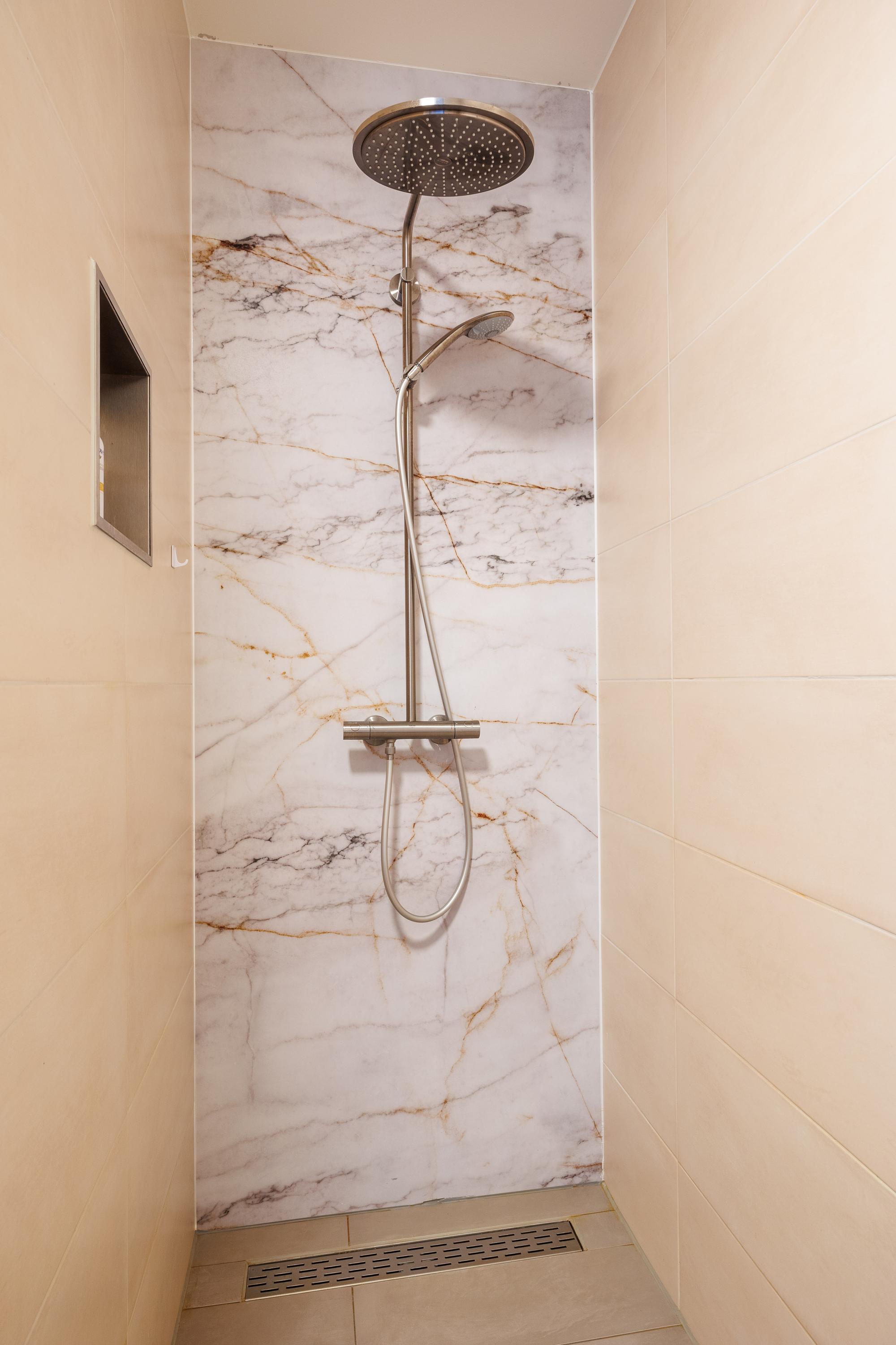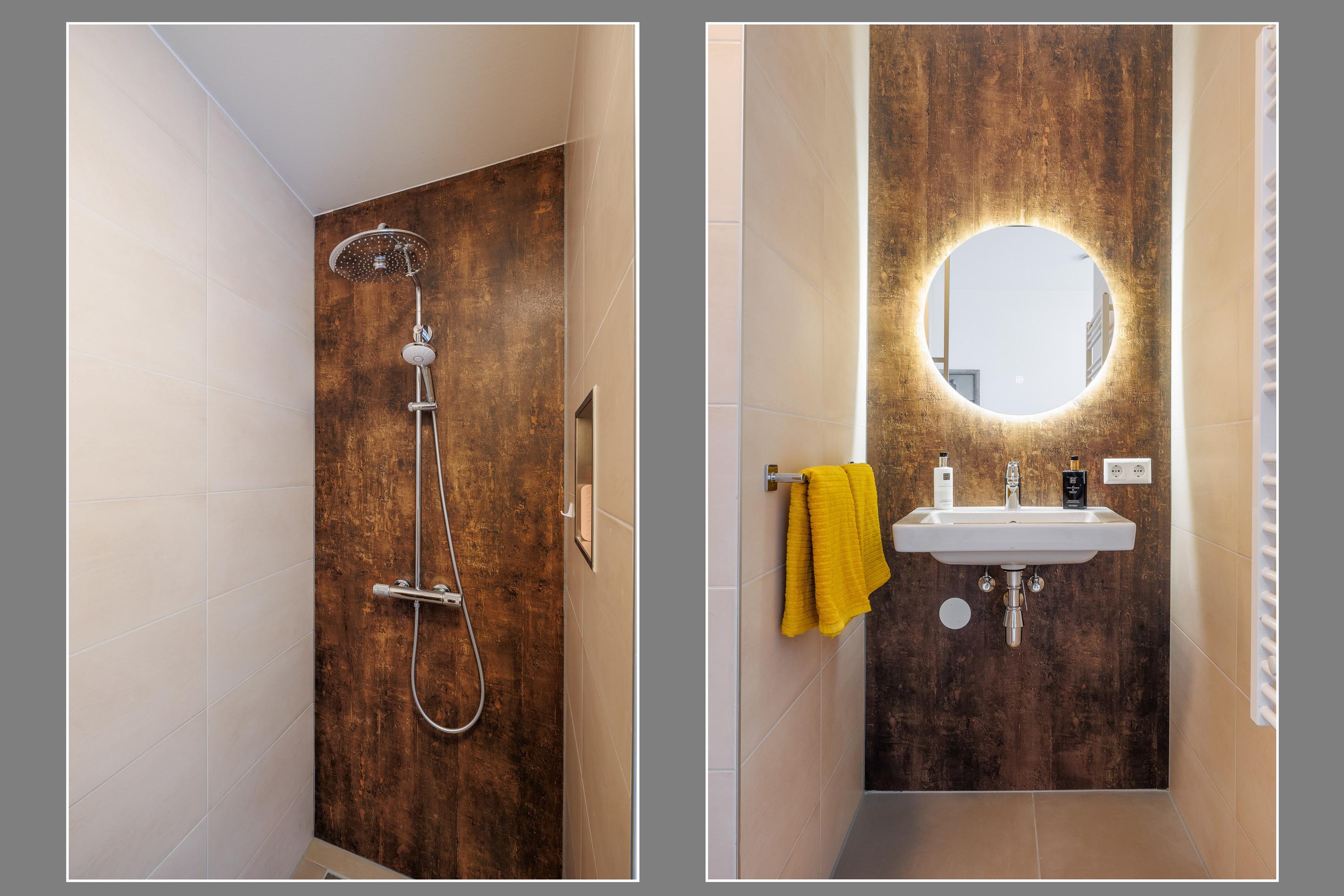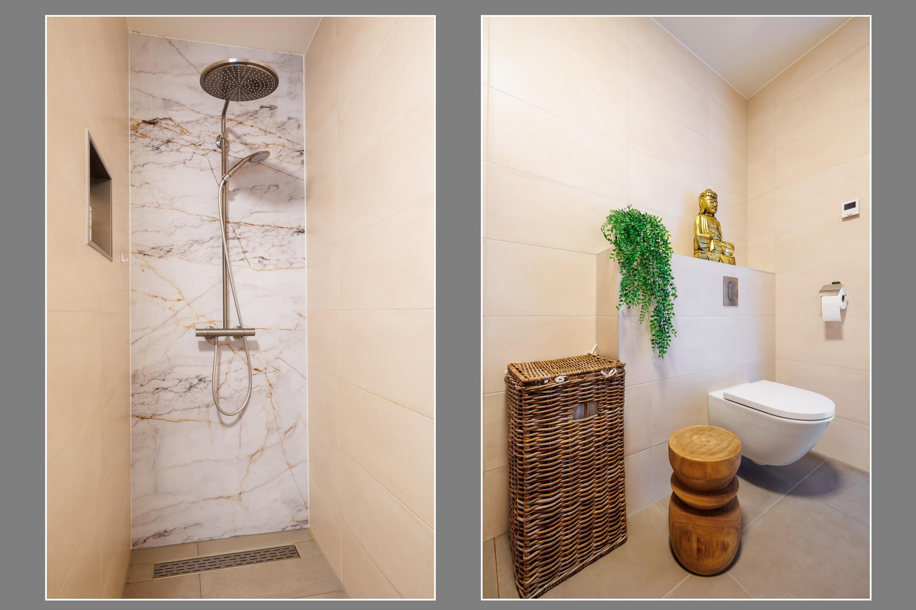 Badkamers: badkamer 1 is gelegen aan de hoofdslaapkamer en is van alle gemakken voorzien, te weten een vrij hangend toilet, een ruime inloopdouche met regendouche, een dubbele wastafel met 4 onderladen, een spiegel met verlichting, een handdoekenkast en een designradiator. Badkamer 2 is gelegen aan slaapkamer 2 en voorzien van een inloopdouche met regendouche, wastafel met verlichting en een designradiator.