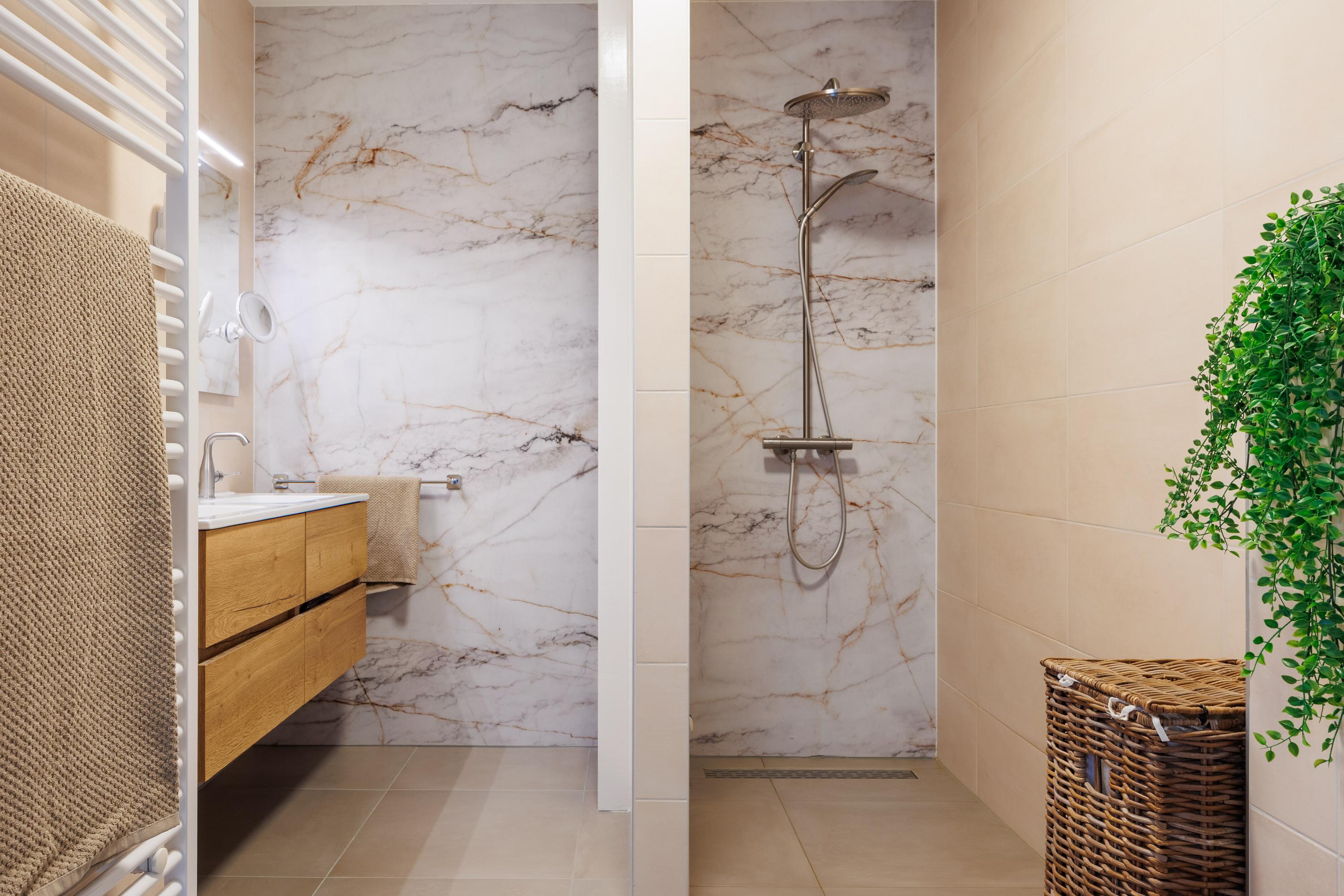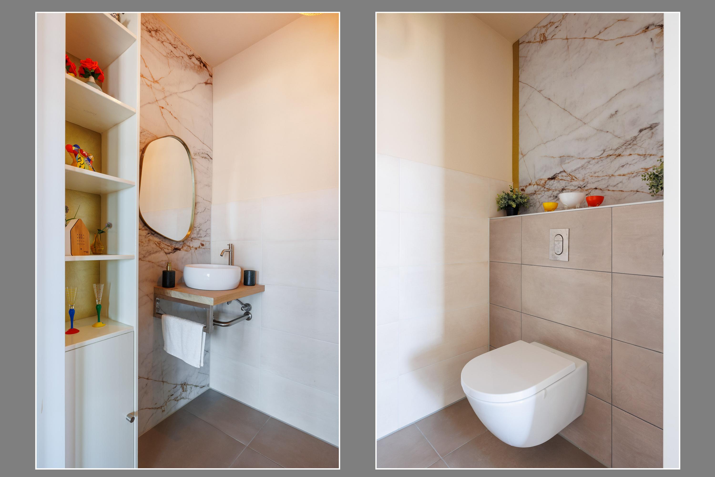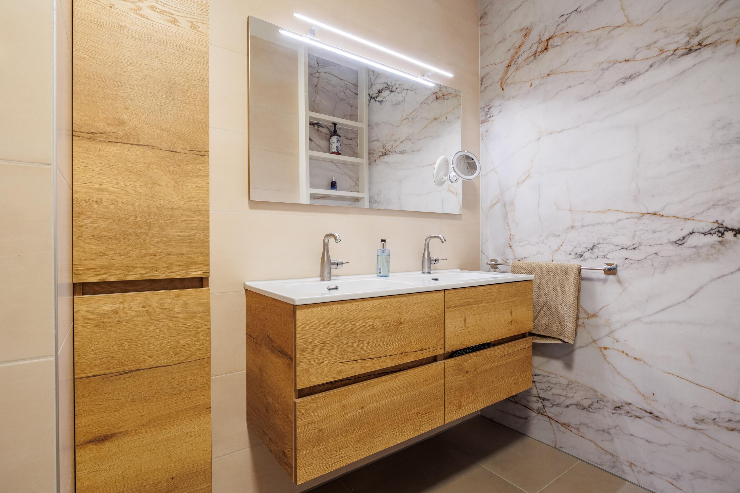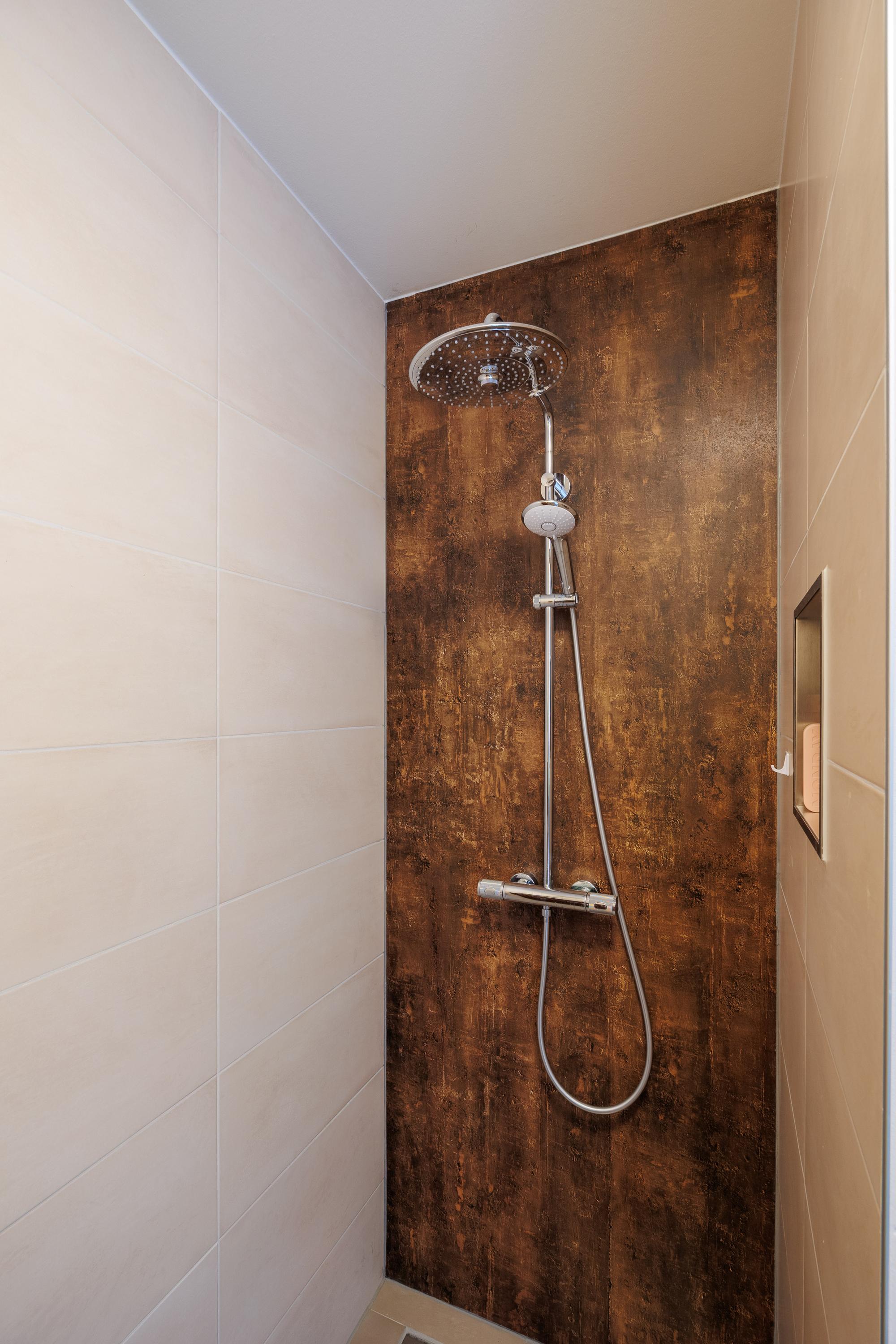 Badkamers: badkamer 1 is gelegen aan de hoofdslaapkamer en is van alle gemakken voorzien, te weten een vrij hangend toilet, een ruime inloopdouche met regendouche, een dubbele wastafel met 4 onderladen, een spiegel met verlichting, een handdoekenkast en een designradiator. Badkamer 2 is gelegen aan slaapkamer 2 en voorzien van een inloopdouche met regendouche, wastafel met verlichting en een designradiator.