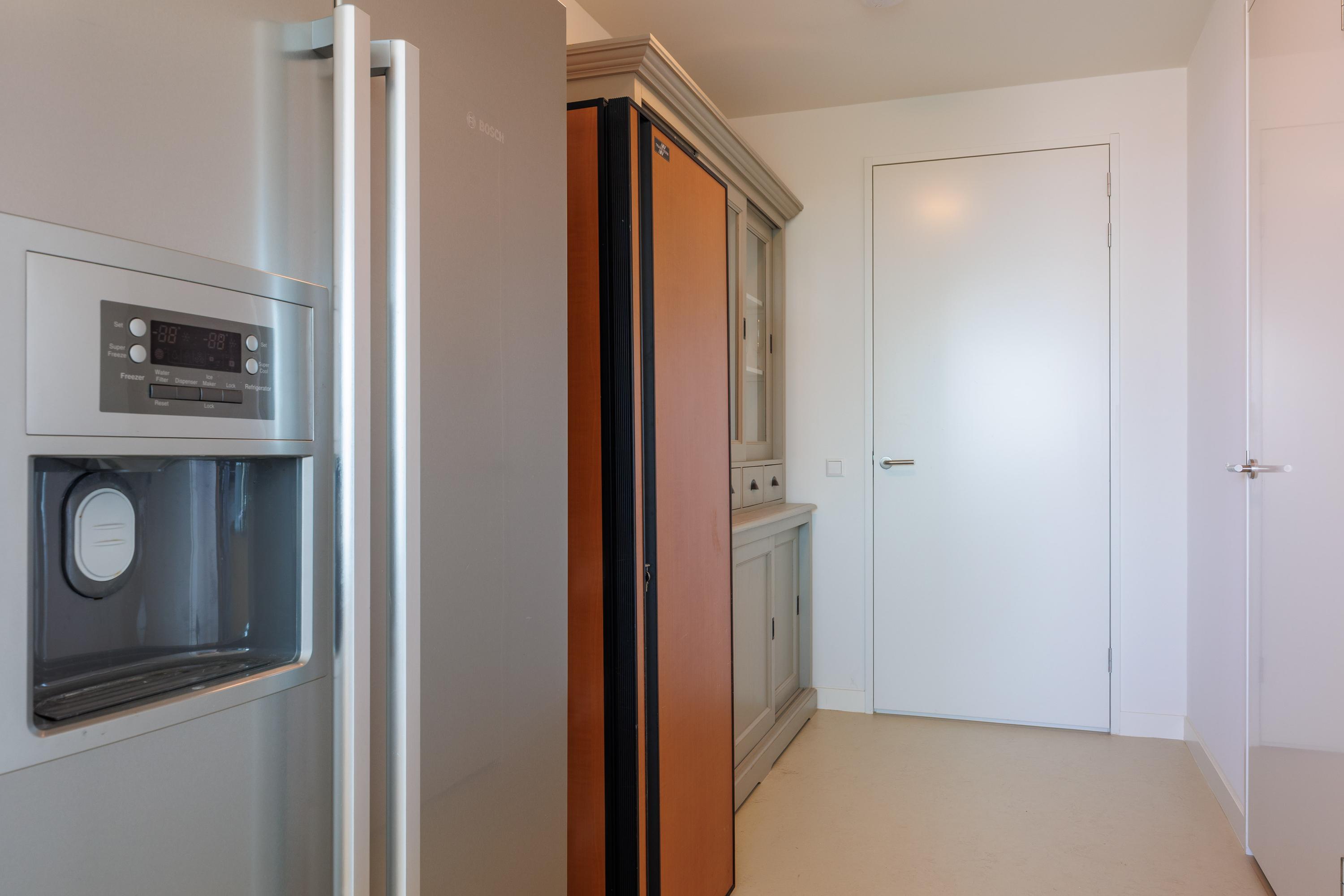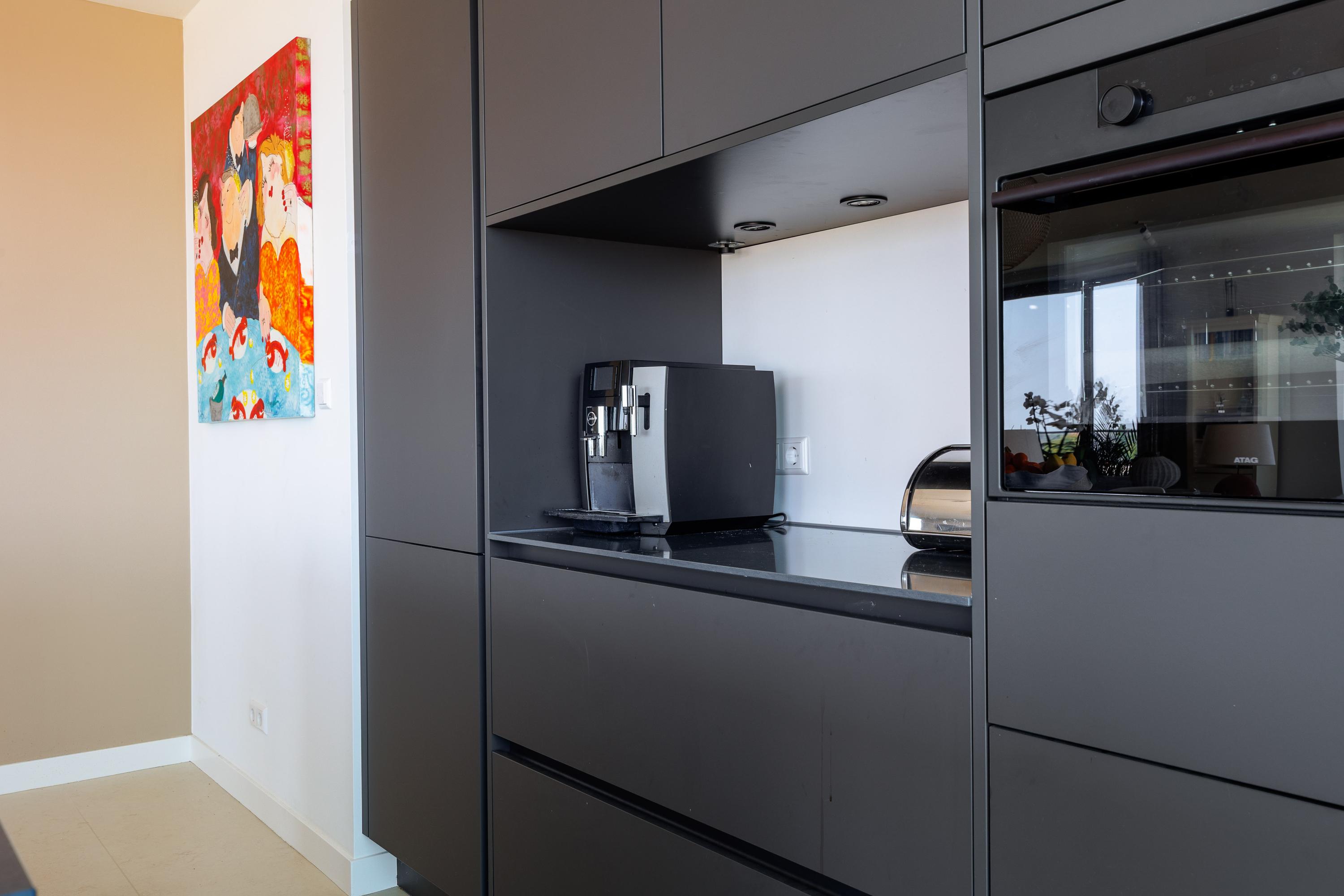 Woonkamer: bij binnenkomst in de royale woonkamer word je verrast door de grote raampartijen en het prachtige uitzicht. Door de vele ramen van vloer tot plafond is er veel licht in huis. Via de brede schuifpui in woonkamer/keuken stap je het zeer royale terras op welke uitzicht biedt over de Waal richting de Oversteek. Vanaf het zijterras is de oude Waalbrug zichtbaar. De open keuken met kook-/ en spoeleiland is voorzien van alle inbouwapparatuur van (veelal) Atag te weten een inductiekookplaat met geïntegreerde afzuiging (BORA), kraan van het merk Quooker, oven en 2e oven met magnetronfunctie, koel/vriescombinatie en een vaatwasser. Het keukeneiland biedt mogelijkheid om aan te eten of op een gezellige avond aan te borrelen. De direct aangrenzende berging aan de keuken met wateraansluiting biedt extra mogelijkheden voor een extra koelkast, klimaatkast of opbergruimte. De indeling van de woonkamer/keuken biedt vele mogelijkheden om een ruime eethoek en zithoek volledig naar eigen wens in te richten.