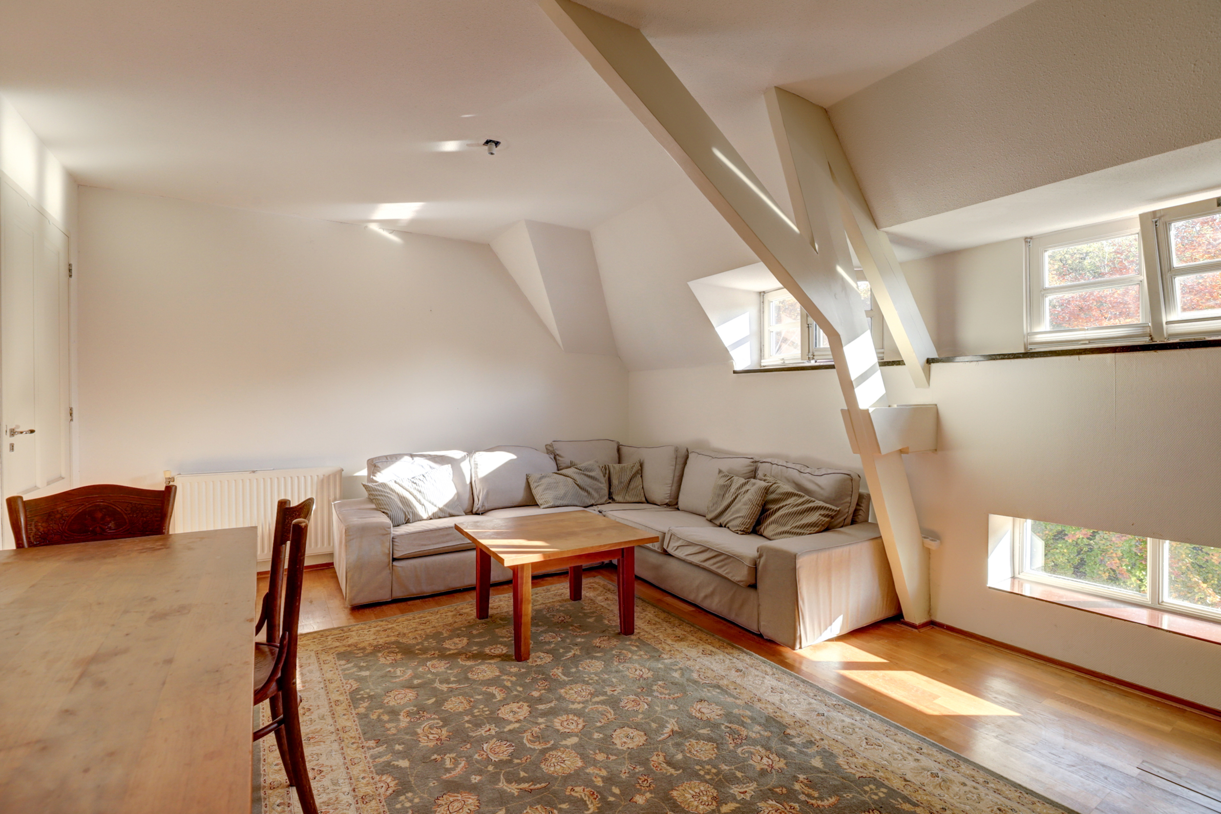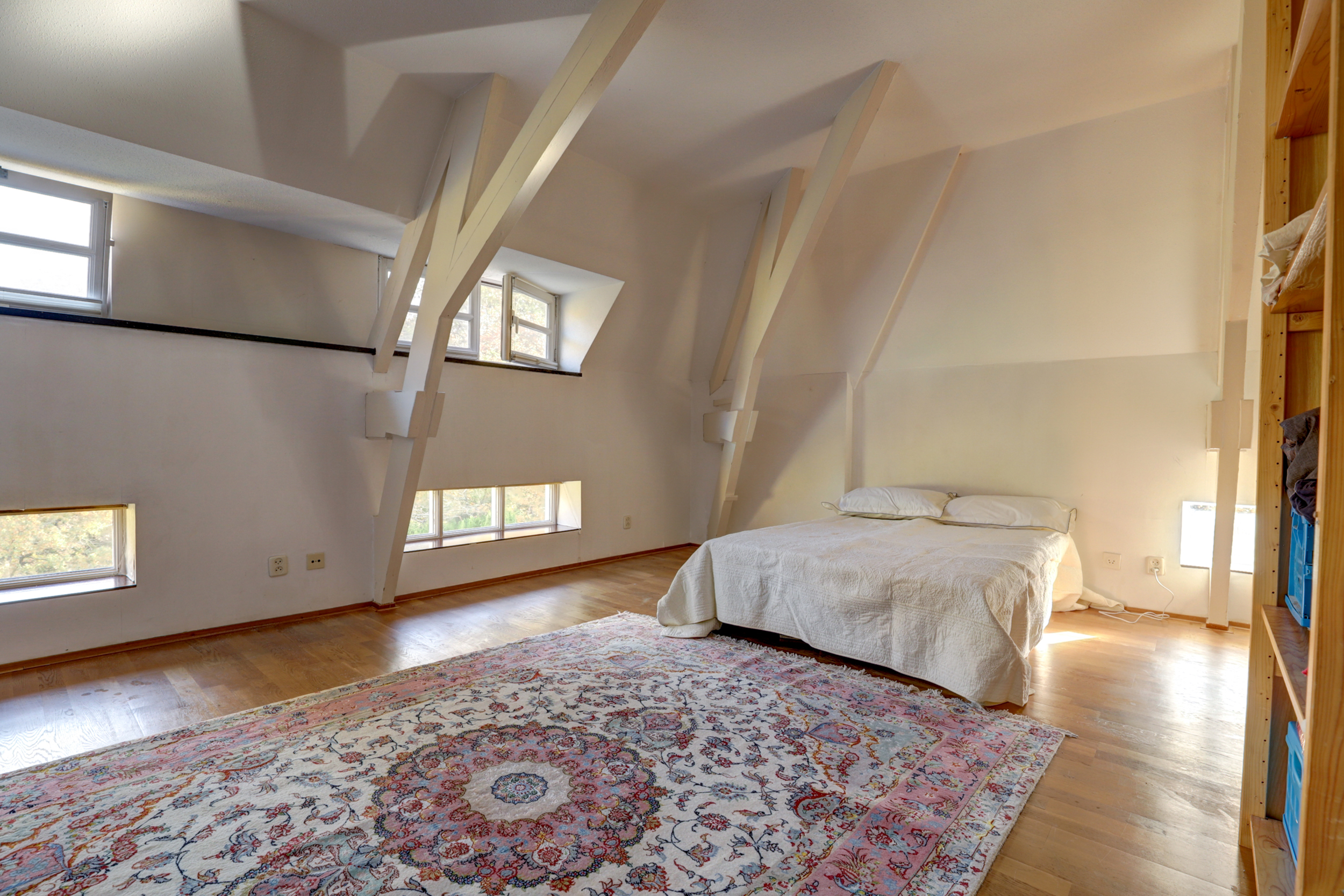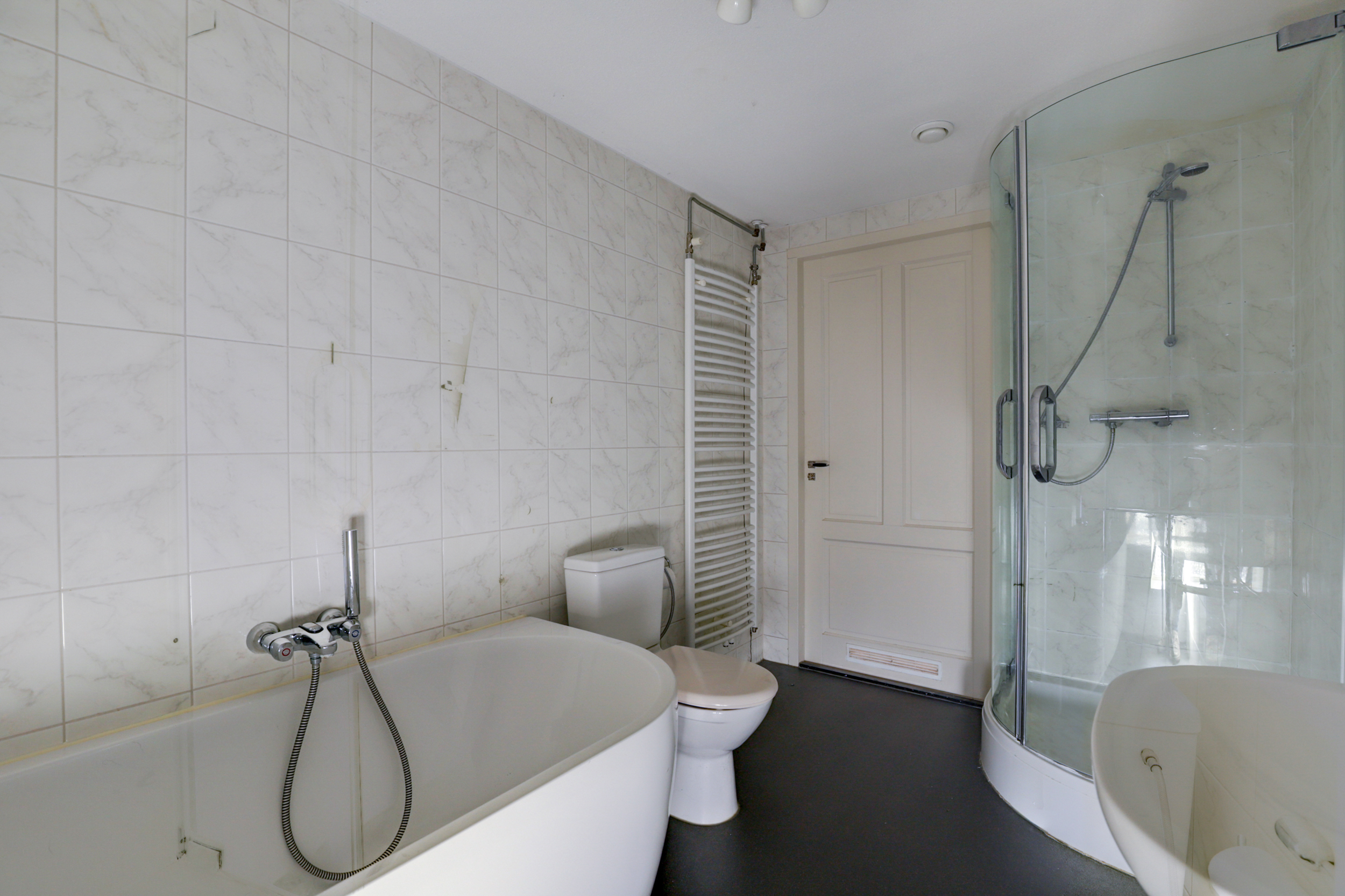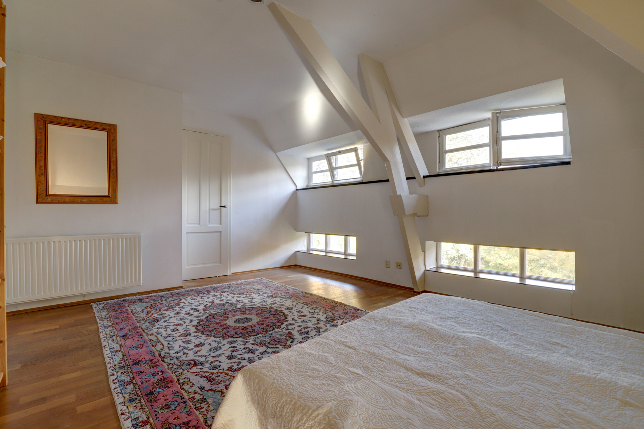 Op de tweede woonlaag bevinden zich twee slaapkamers, waarbij de hoge plafonds en de karakteristieke houten balken, welke in het zicht zijn gelaten en zorgen voor een sfeervolle uitstraling. De slaapkamer aan de voorzijde beschikt over een inloopkast, terwijl de slaapkamer aan de achterzijde is voorzien van een eigen douche met wastafel. De badkamer is uitgerust met een toilet, douche, ligbad en wastafel. Daarnaast is er een praktische aparte ruimte met aansluitingen voor de wasmachine en droger en de opstelplaats voor de cv-installatie. De tweede verdieping is natuurlijk bereikbaar via de vaste trap in het appartement, maar beschikt daarnaast ook over een eigen ingang, welke bereikbaar is via het gezamenlijke trappenhuis van de villa. Dit zorg voor extra flexibiliteit en mogelijkheden.