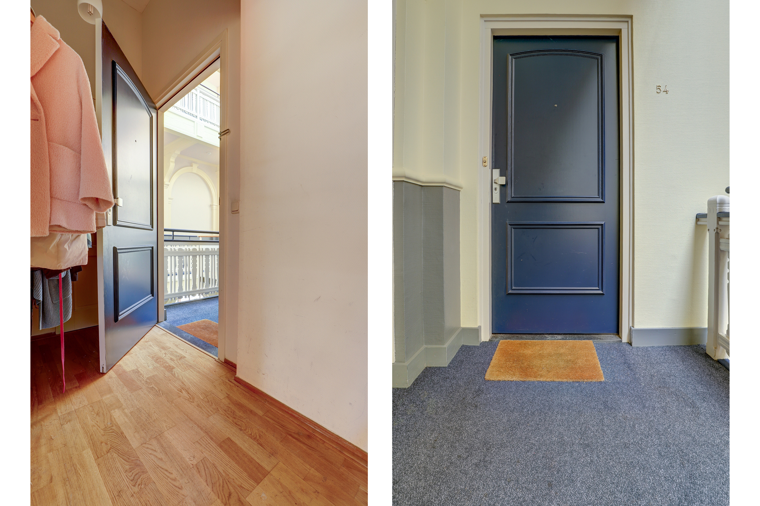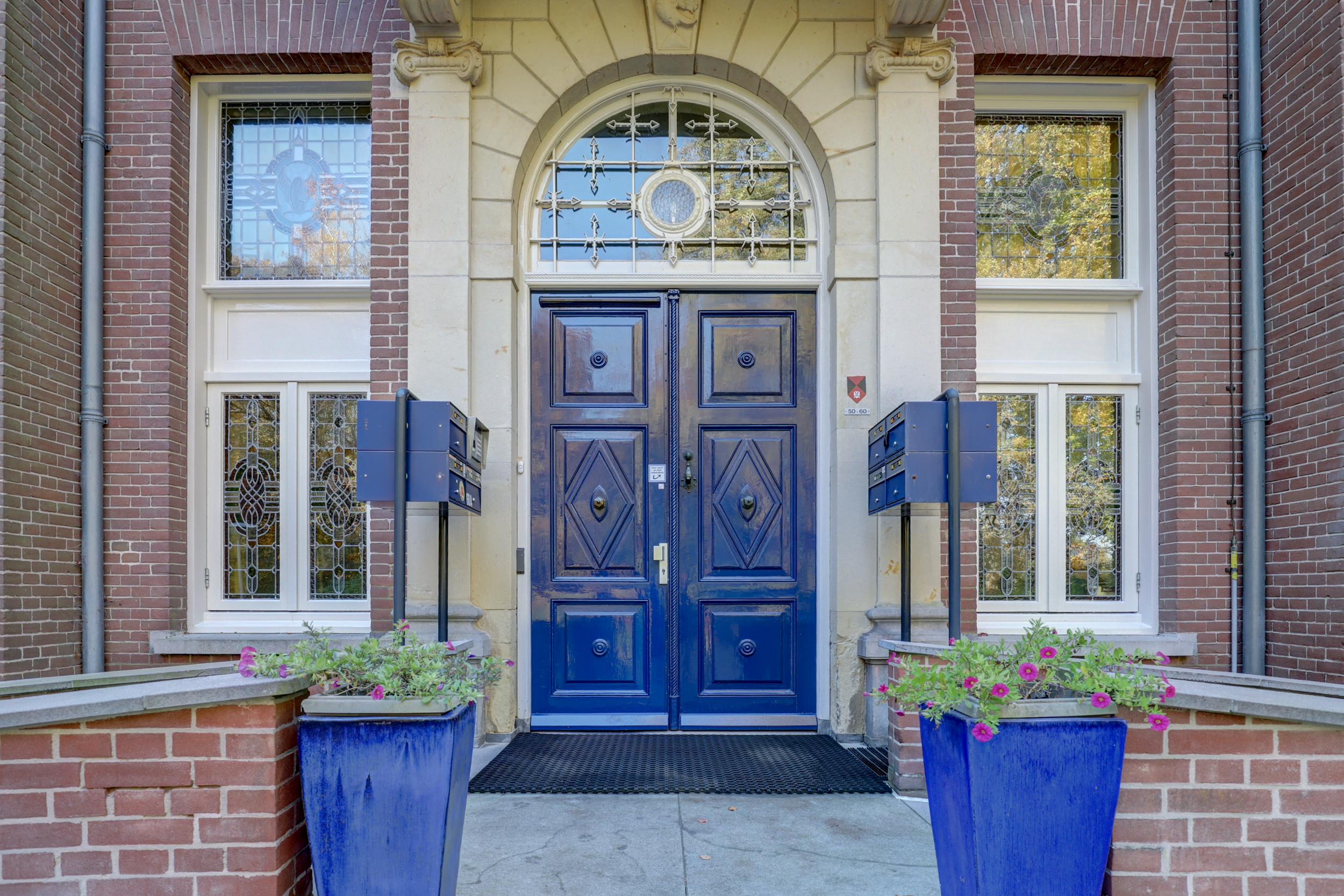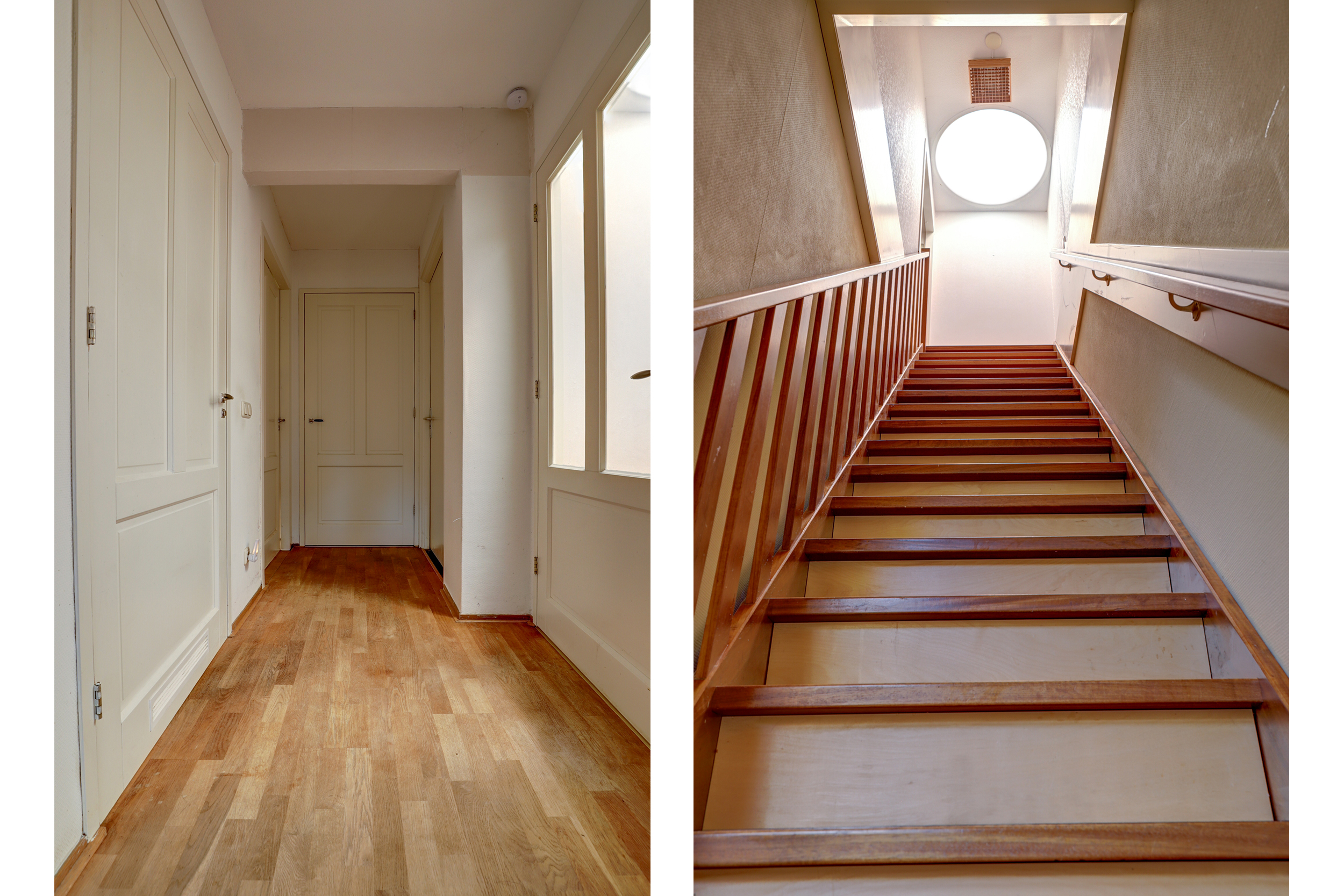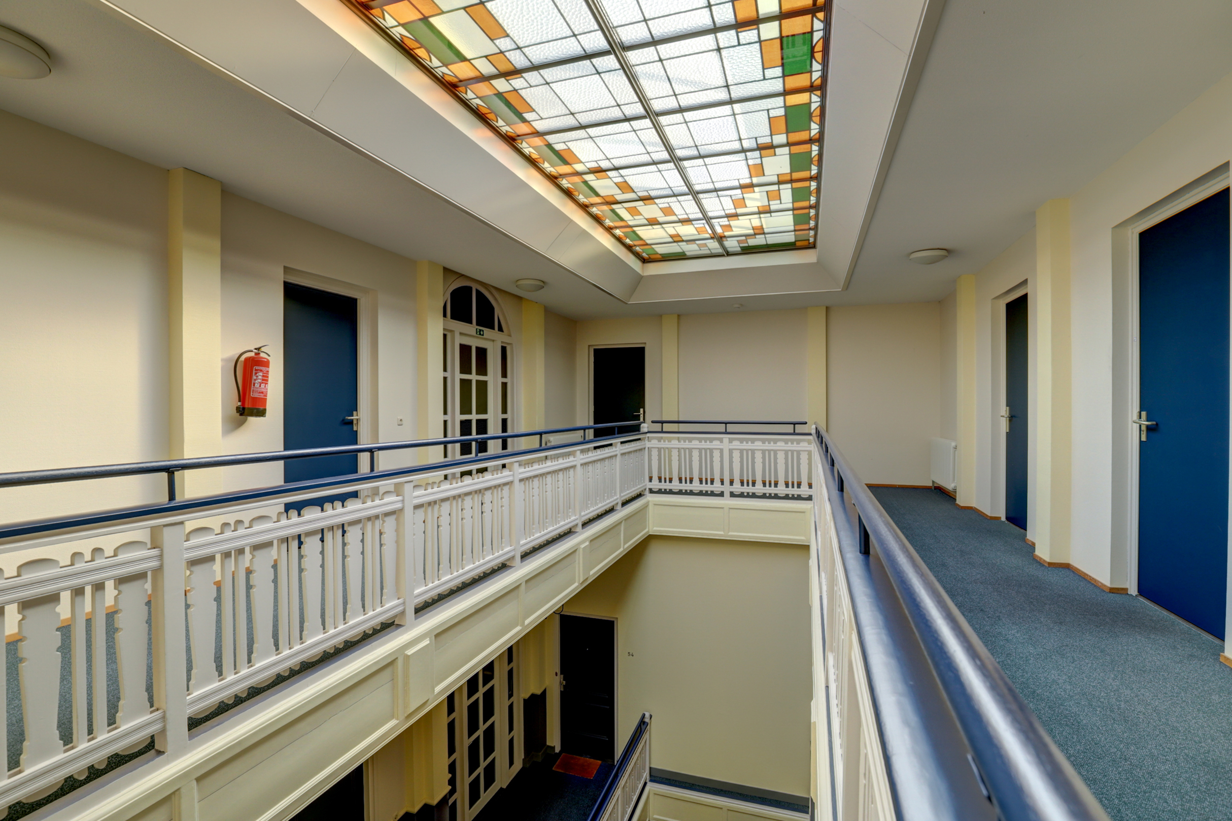 Bij binnenkomst word je geraakt door de prachtige stijlkenmerken van de villa. Er ligt een marmeren vloer, er is een mooi origineel trappenhuis en natuurlijk is er een lift ingebouwd die ons naar de eerste verdieping brengt. Hier bevindt zich de entree van het appartement. De galerij met versierde balustrade en prachtig glas in lood zorgt voor een fantastische sfeer.