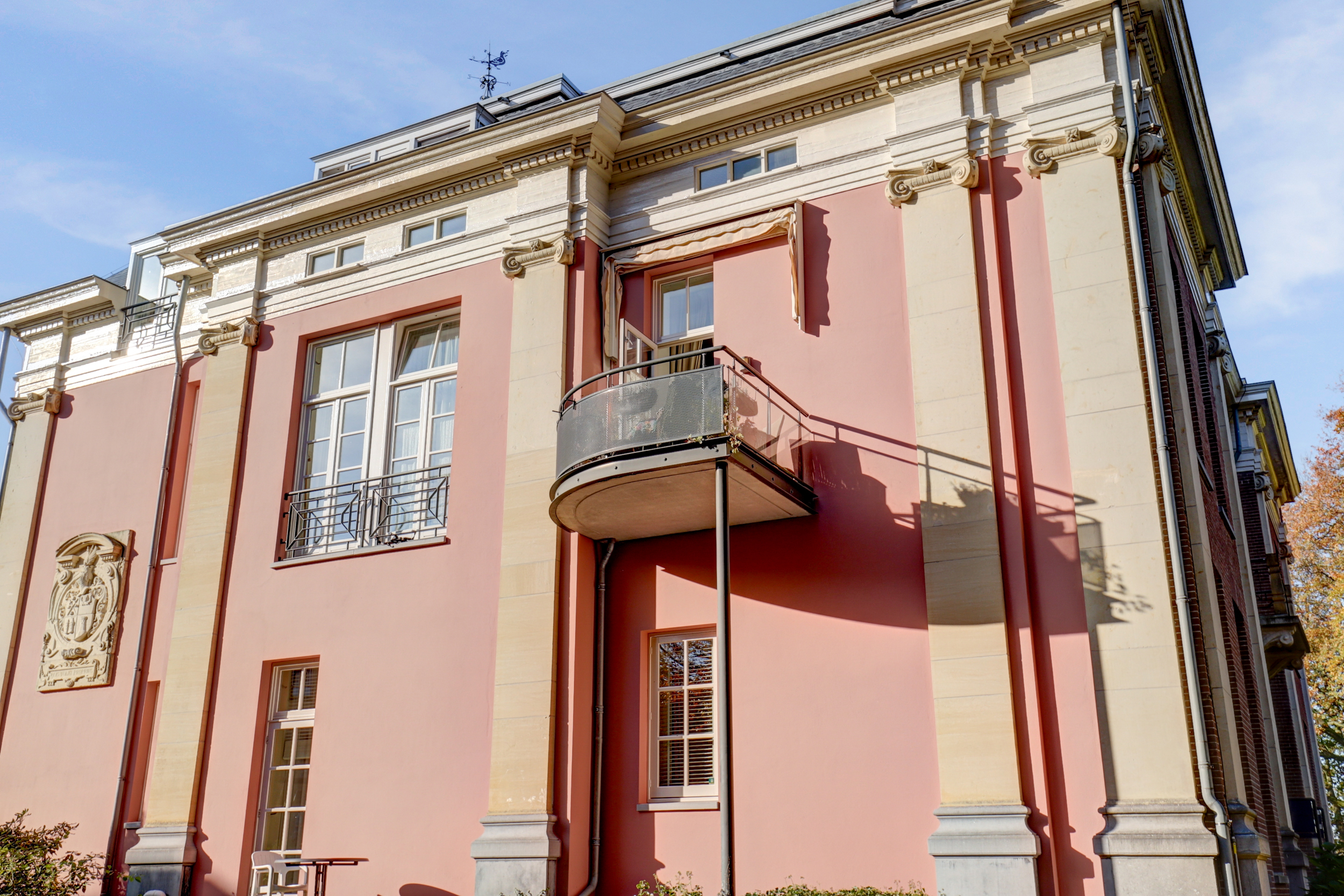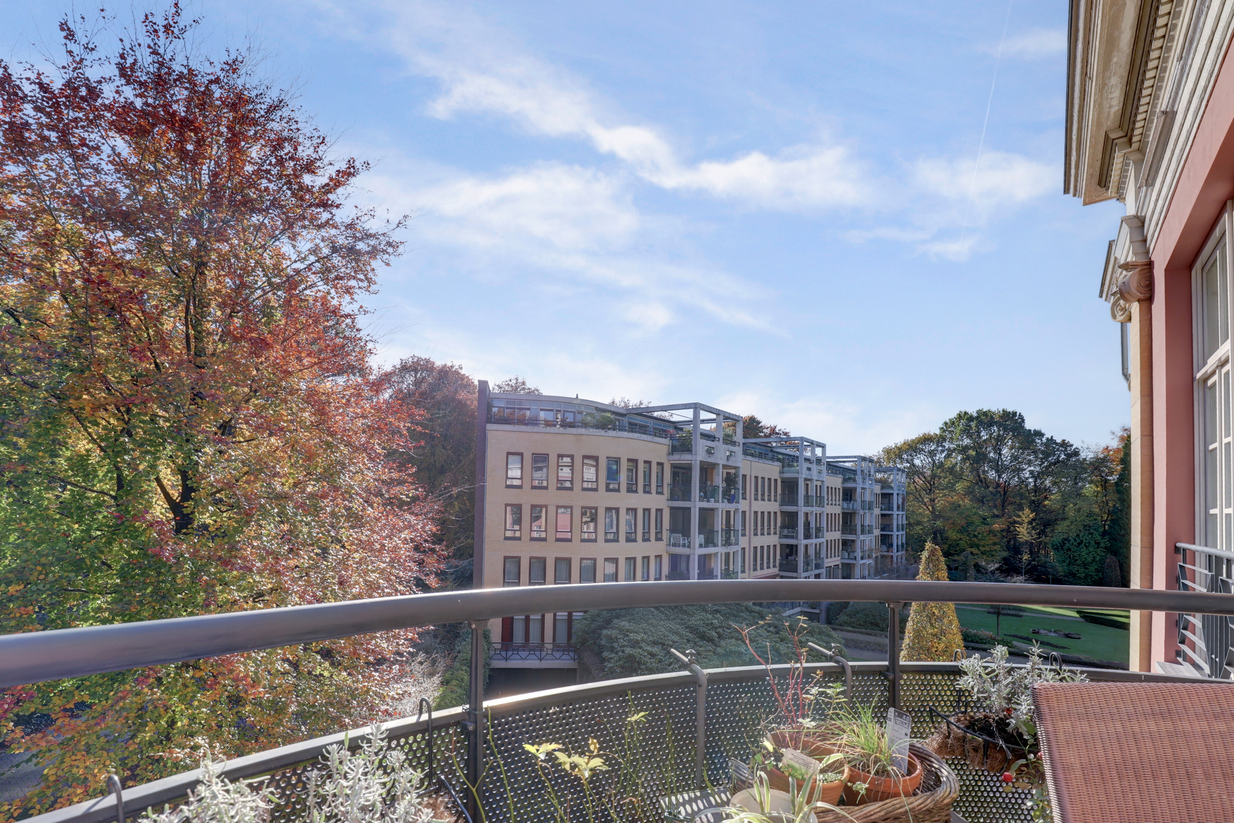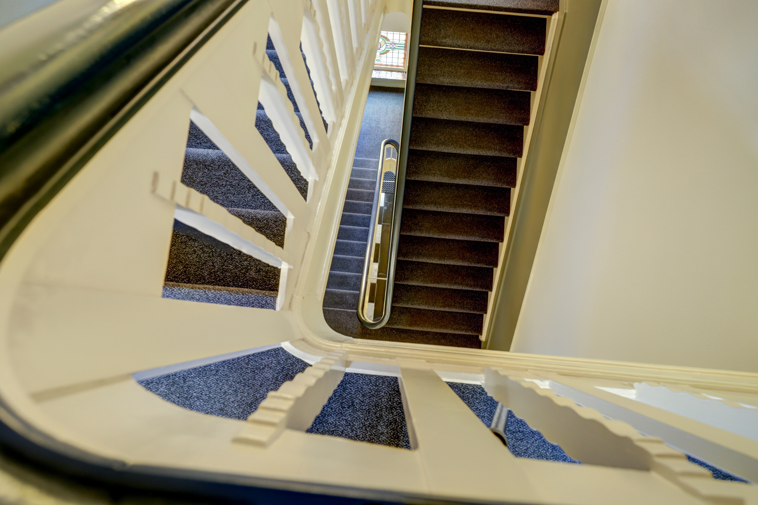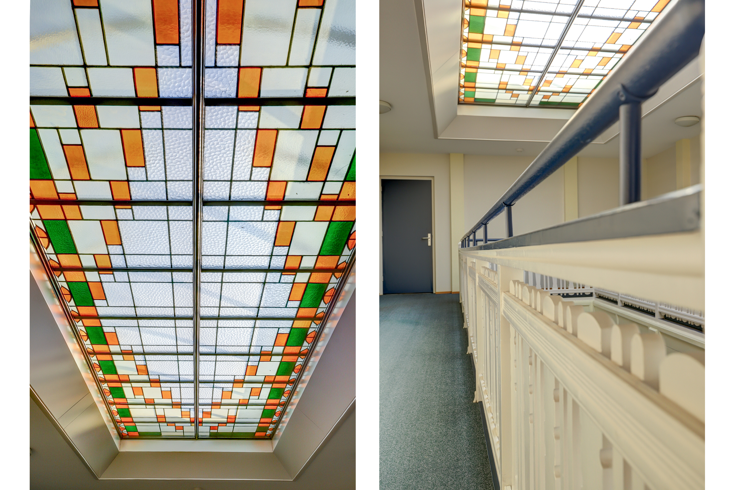 Bij binnenkomst word je geraakt door de prachtige stijlkenmerken van de villa. Er ligt een marmeren vloer, er is een mooi origineel trappenhuis en natuurlijk is er een lift ingebouwd die ons naar de eerste verdieping brengt. Hier bevindt zich de entree van het appartement. De galerij met versierde balustrade en prachtig glas in lood zorgt voor een fantastische sfeer.