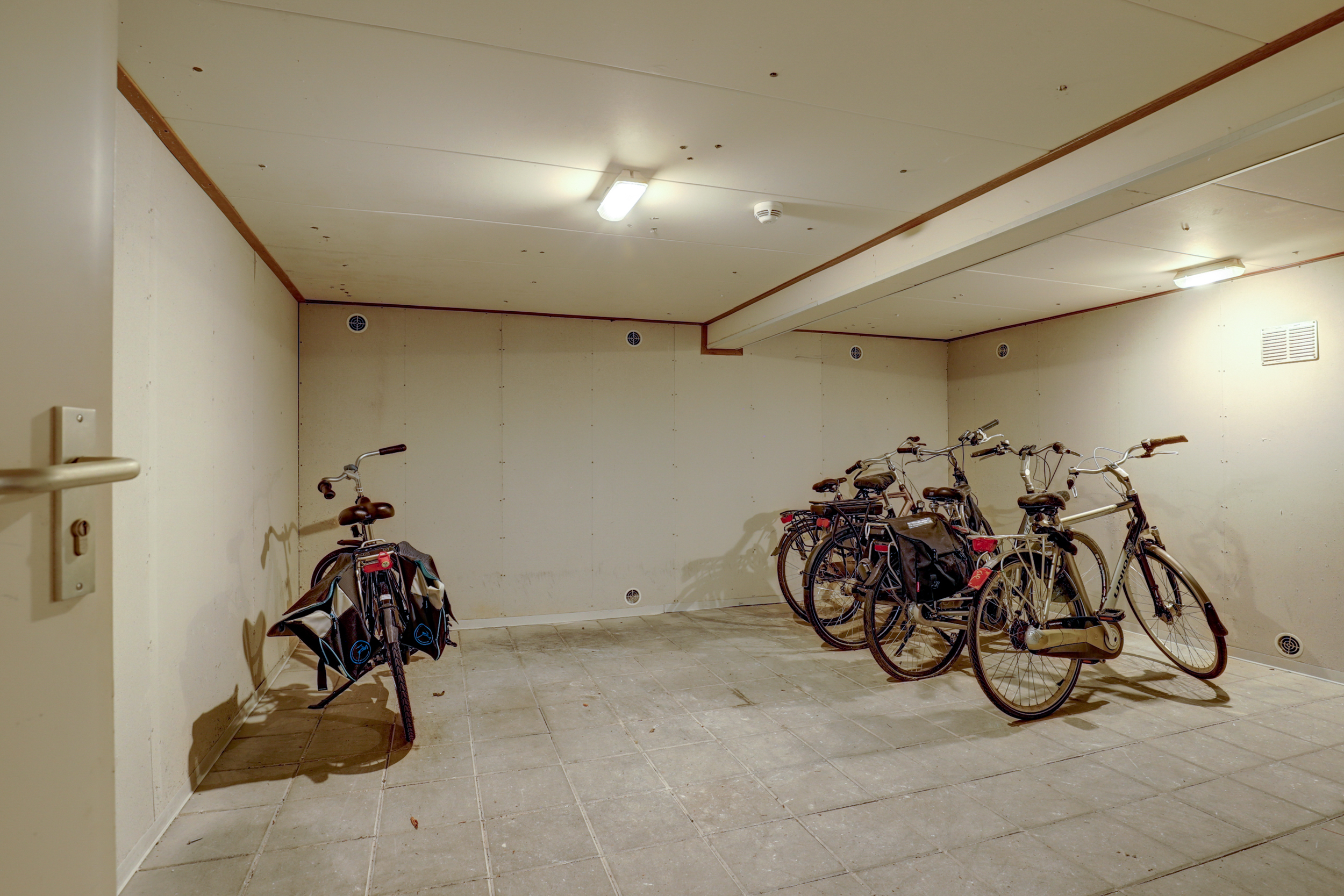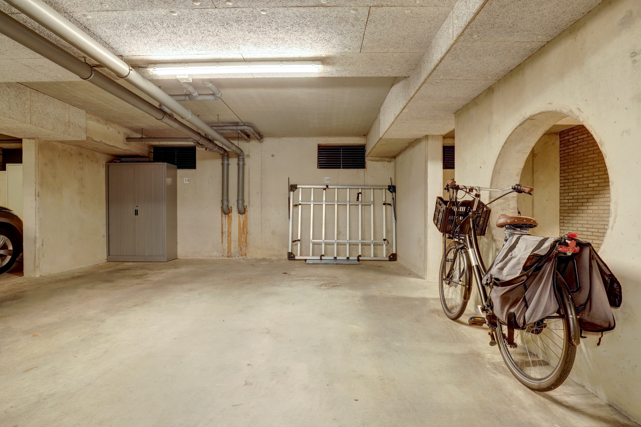 Onder in het gebouw bevindt zich een privé berging en een gezamenlijke fietsenstalling. In de zuidelijke nieuwbouwvleugel kunt u uw auto overdekt stallen in een privé parkeerplaats, met mogelijkheid een elektrisch oplaadpunt aan te sluiten naar de ringleiding. De oprit naar deze garage is verwarmd.