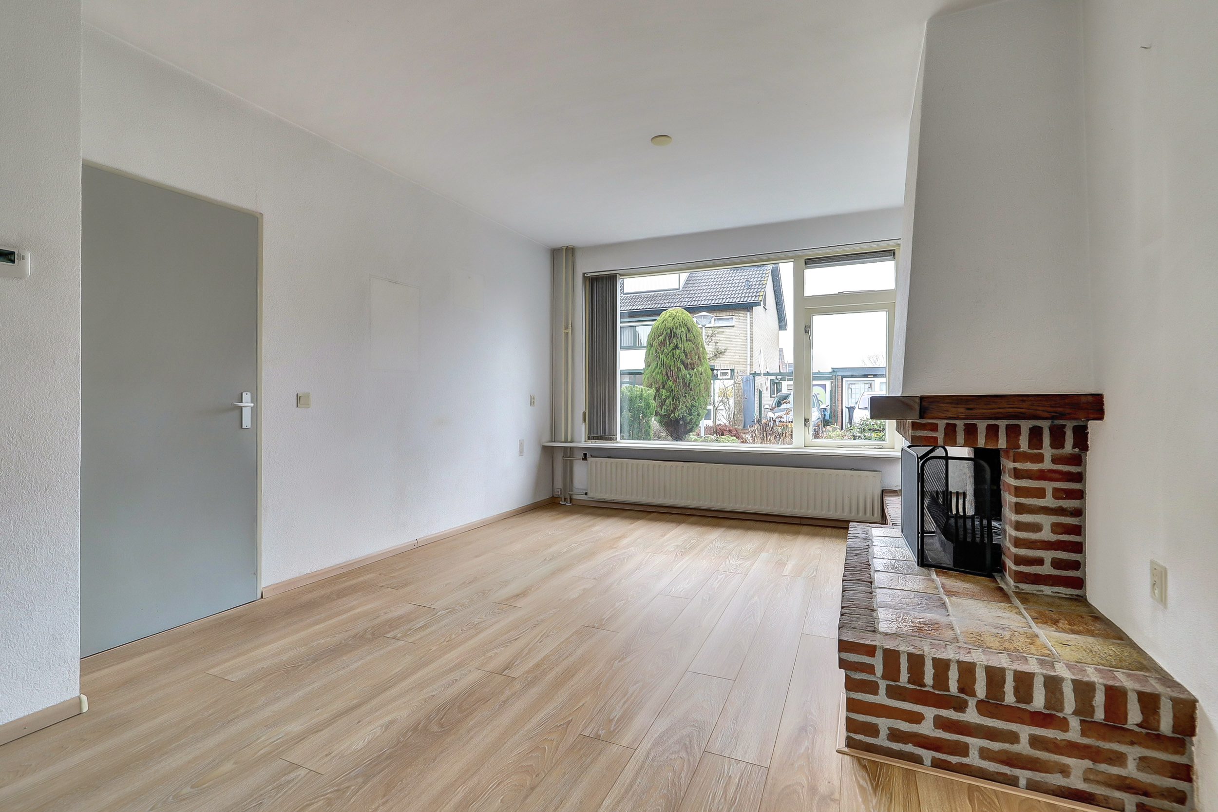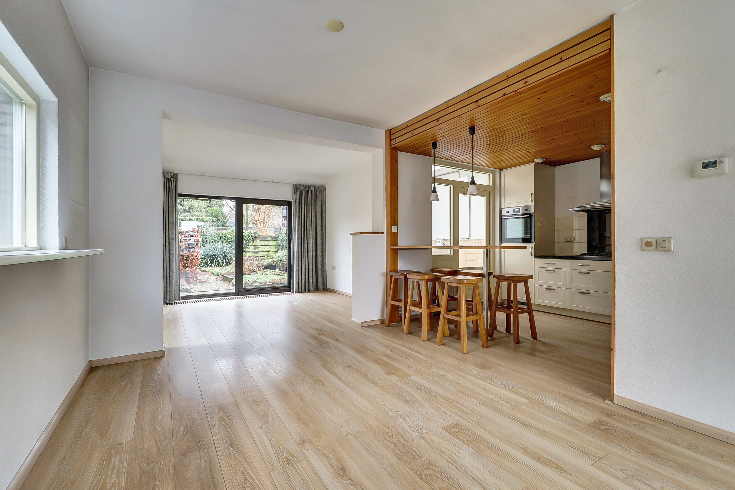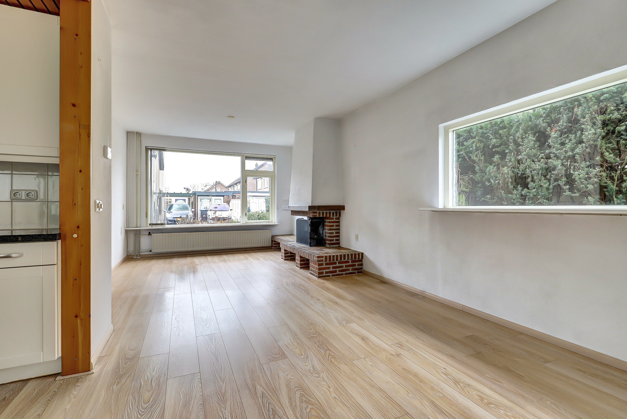 Je komt binnen in een ruime hal met meterkast, toilet met fontein, trapopgang en een handige trapkast voor extra bergruimte. De woonkamer is royaal en licht, met een uitbouw aan de achterzijde die de leefruimte vergroot. Via de schuifpui heb je direct toegang tot de tuin, wat zorgt voor een prettige verbinding tussen binnen en buiten.