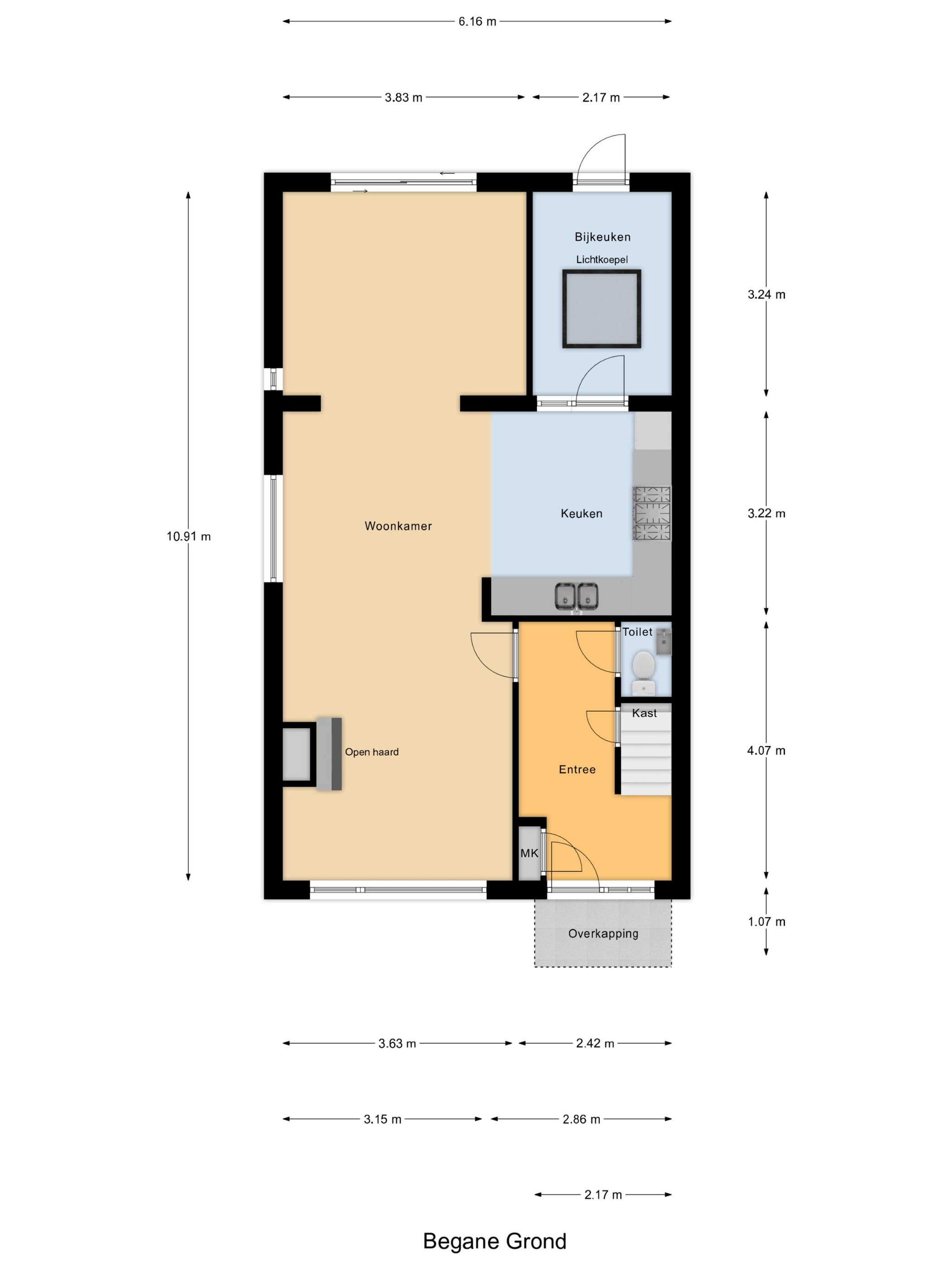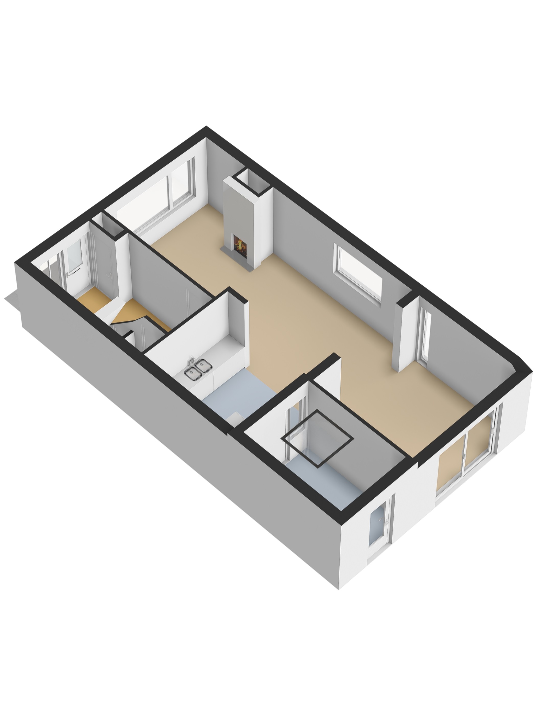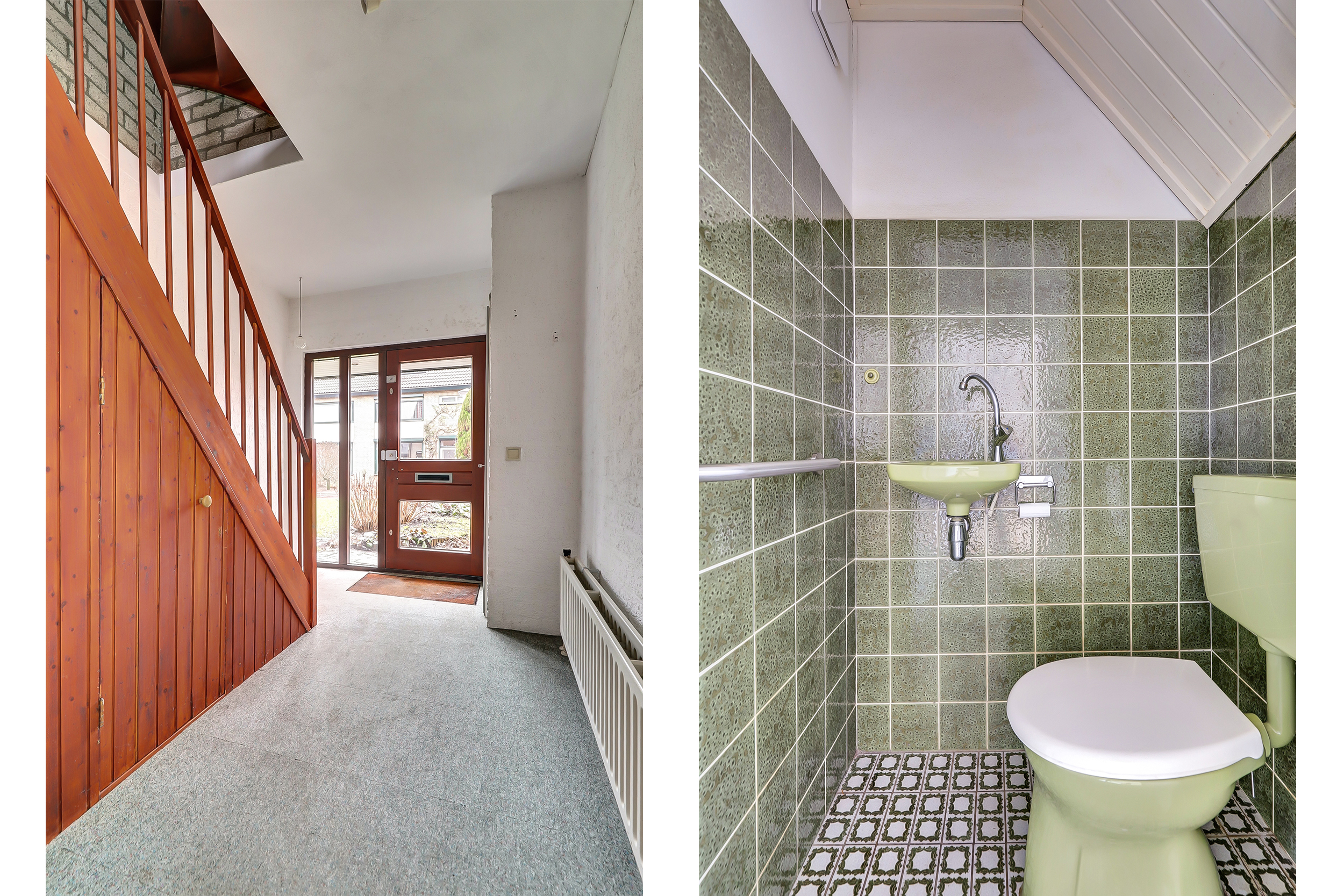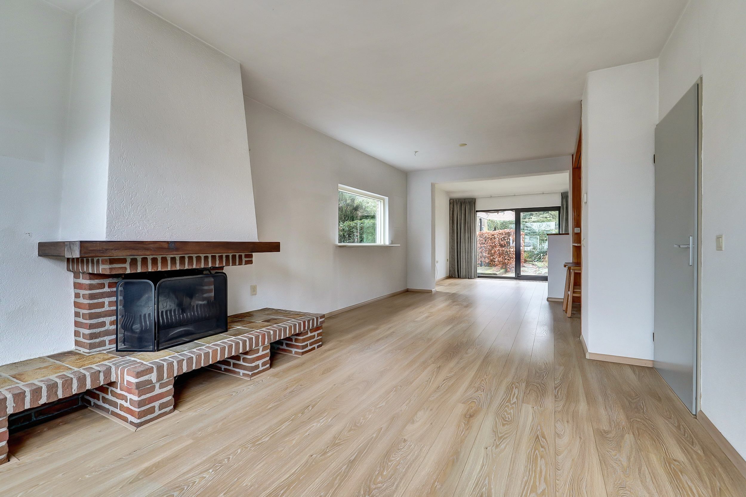 Je komt binnen in een ruime hal met meterkast, toilet met fontein, trapopgang en een handige trapkast voor extra bergruimte. De woonkamer is royaal en licht, met een uitbouw aan de achterzijde die de leefruimte vergroot. Via de schuifpui heb je direct toegang tot de tuin, wat zorgt voor een prettige verbinding tussen binnen en buiten.