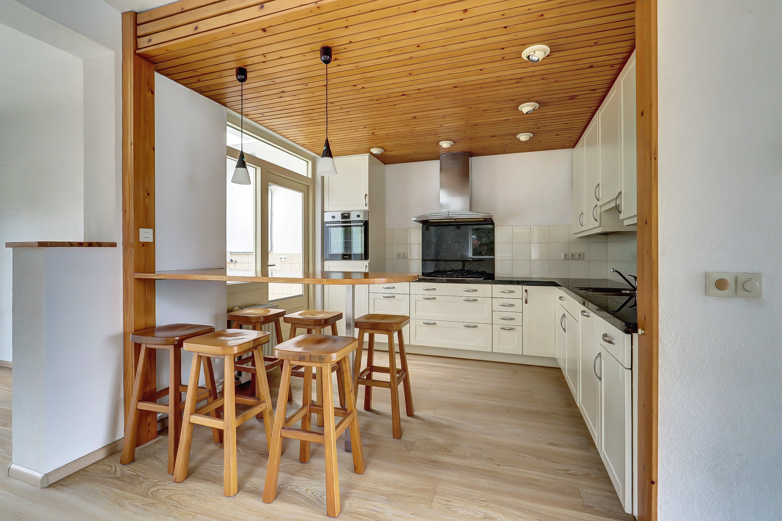 Aangrenzend aan de woonkamer ligt de open keuken, die is uitgerust met een koelkast, 5-pits gasfornuis, oven en vaatwasser. Door de verhoogde eettafel ontstaat er een gezellige plek waar bezoek eenvoudig kan aanschuiven tijdens het koken.