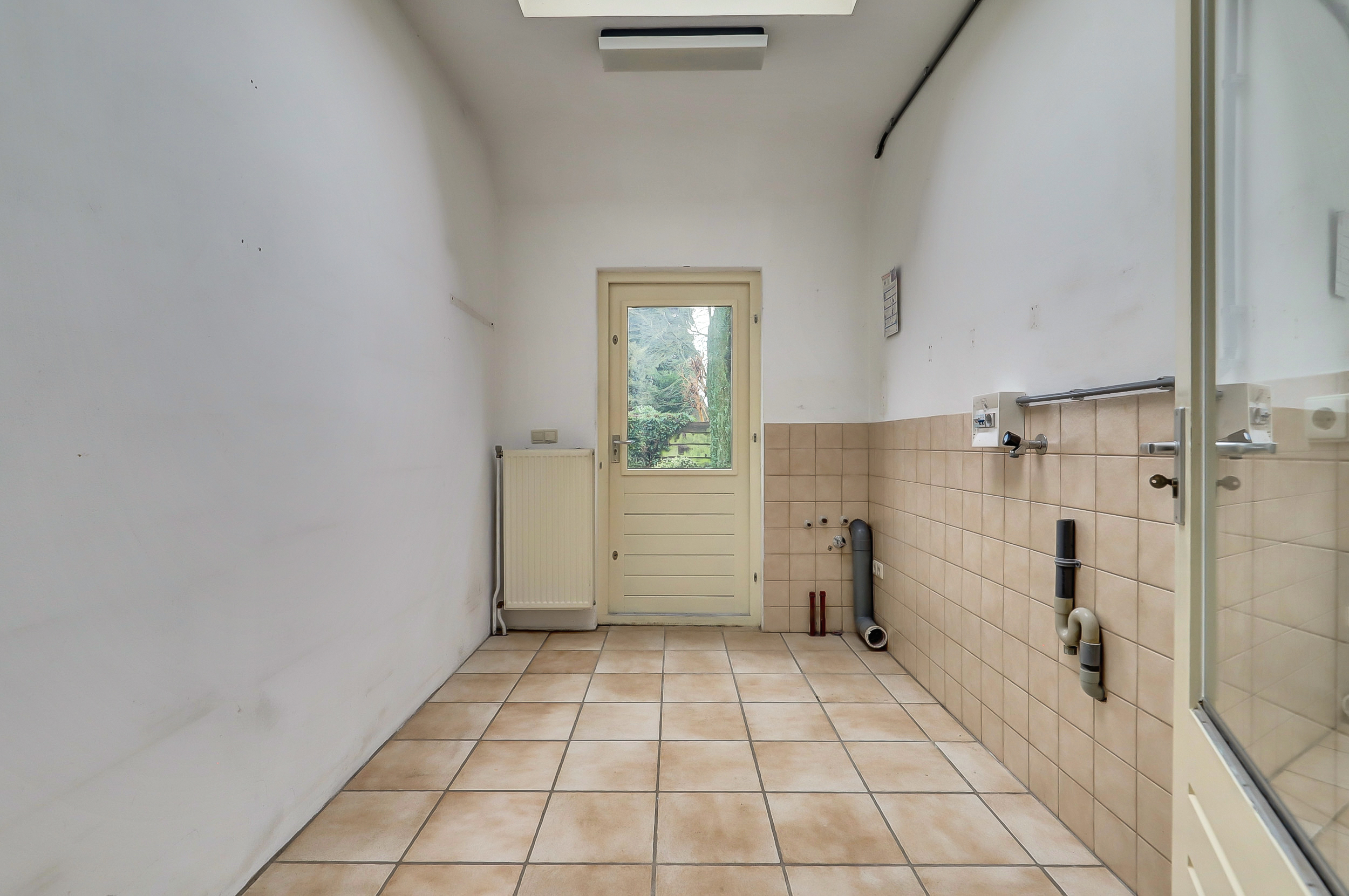 Achter de keuken bevindt zich de bijkeuken met aansluitingen voor de wasmachine, extra bergruimte, een dakraam en de omvormer van de zonnepanelen.