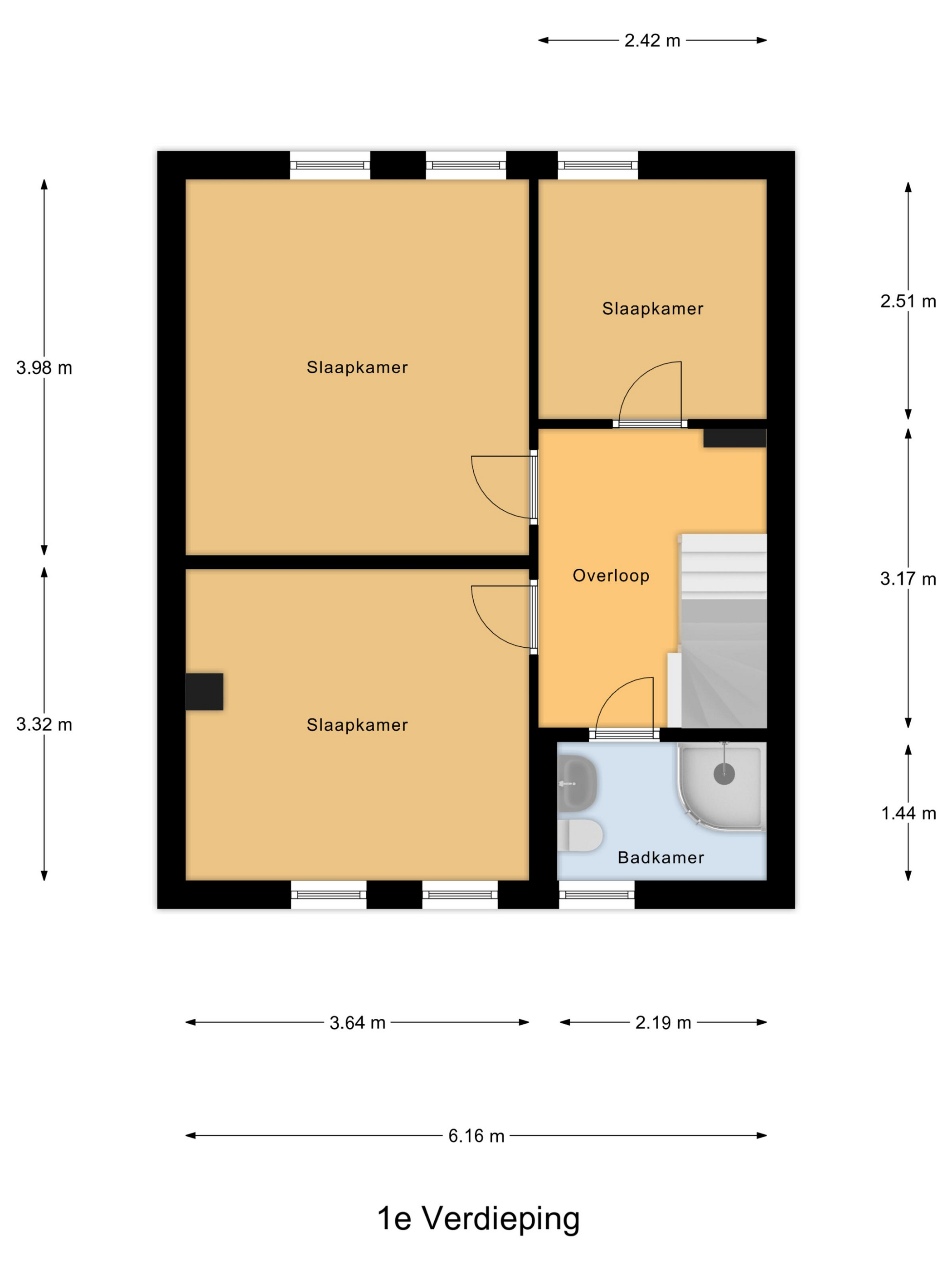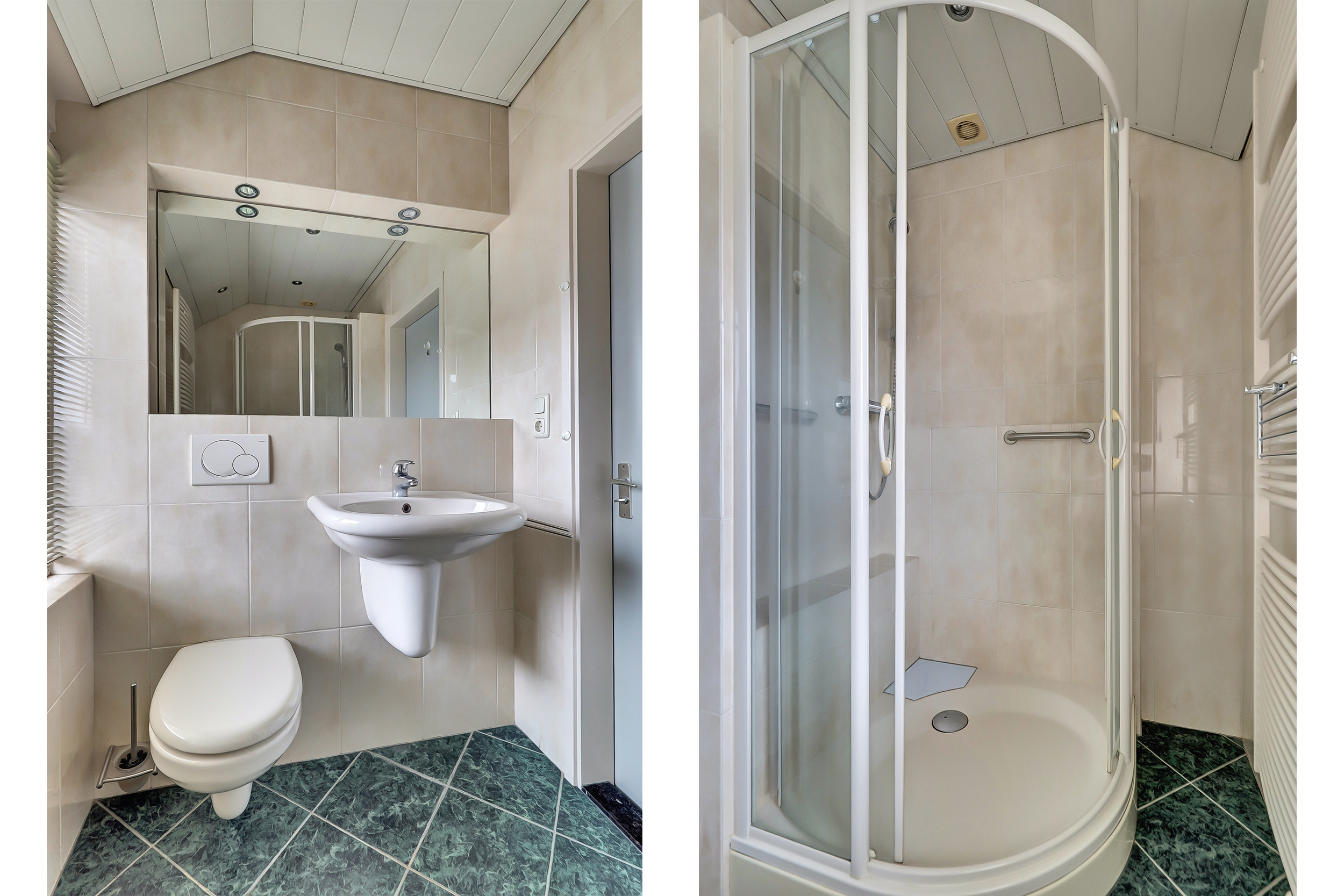 Op de eerste verdieping bevinden zich drie slaapkamers, waarvan één is voorzien van een eigen wastafel. Tevens is hier de badkamer gesitueerd, met douchecabine, wastafel en toilet.