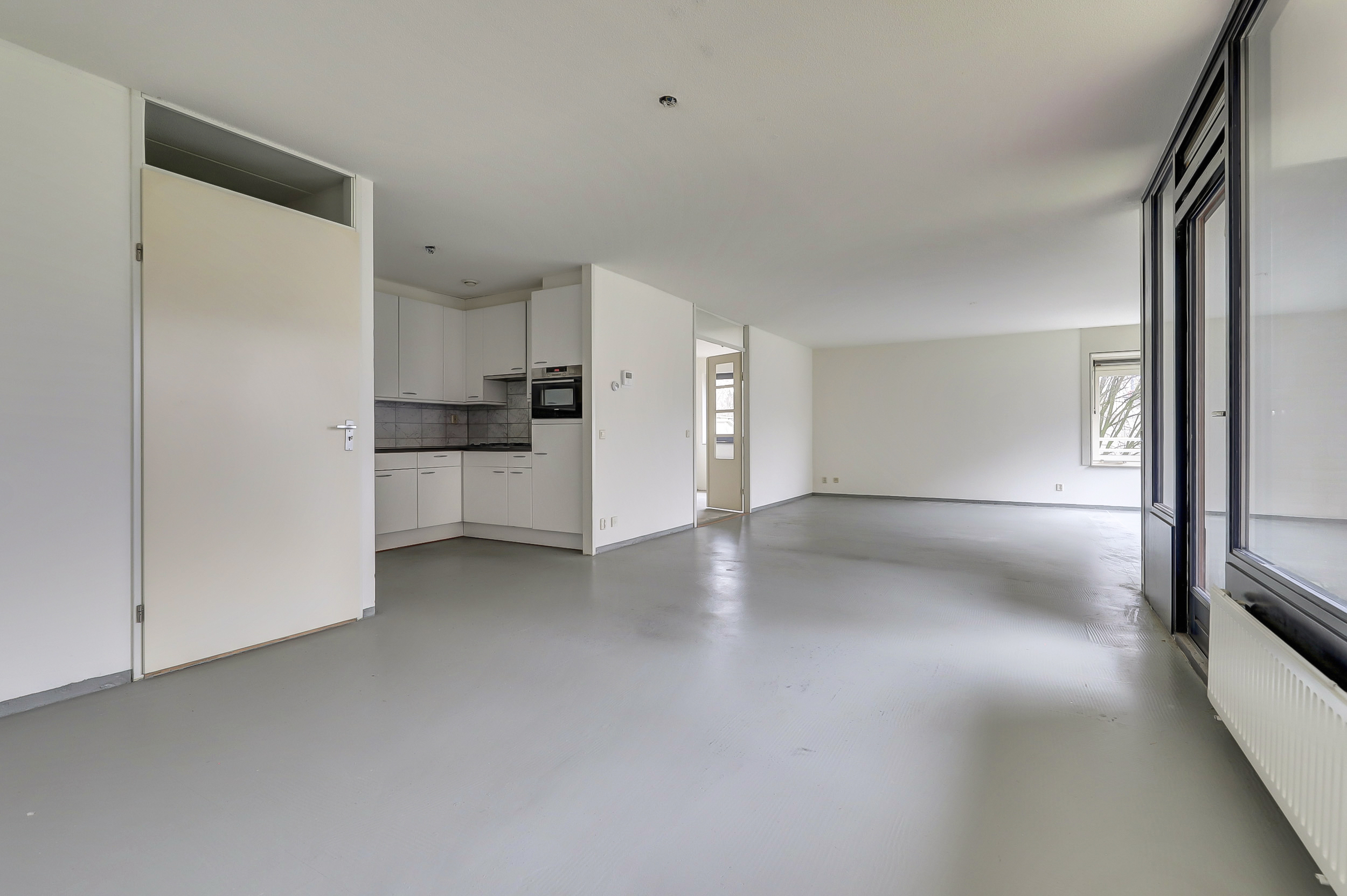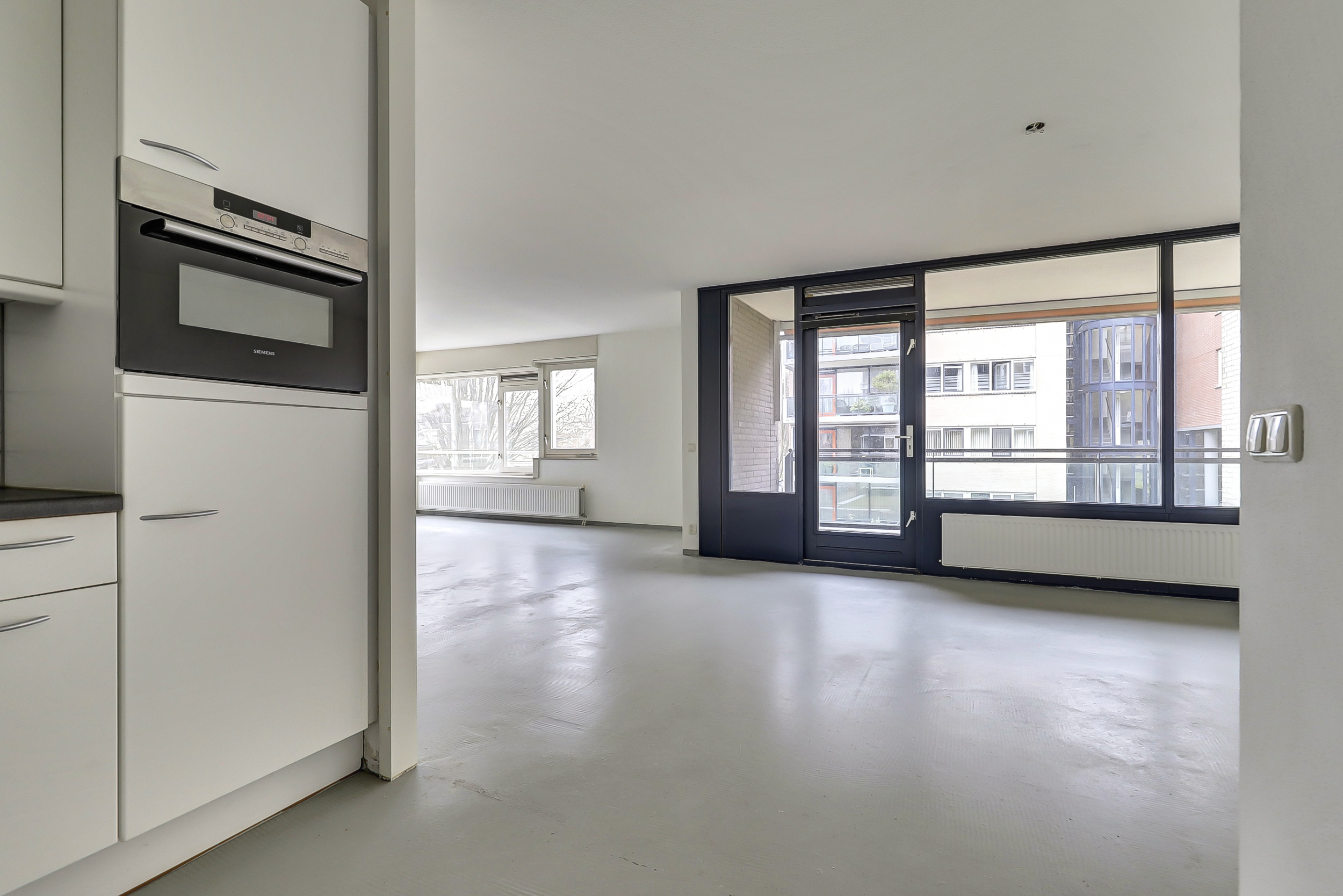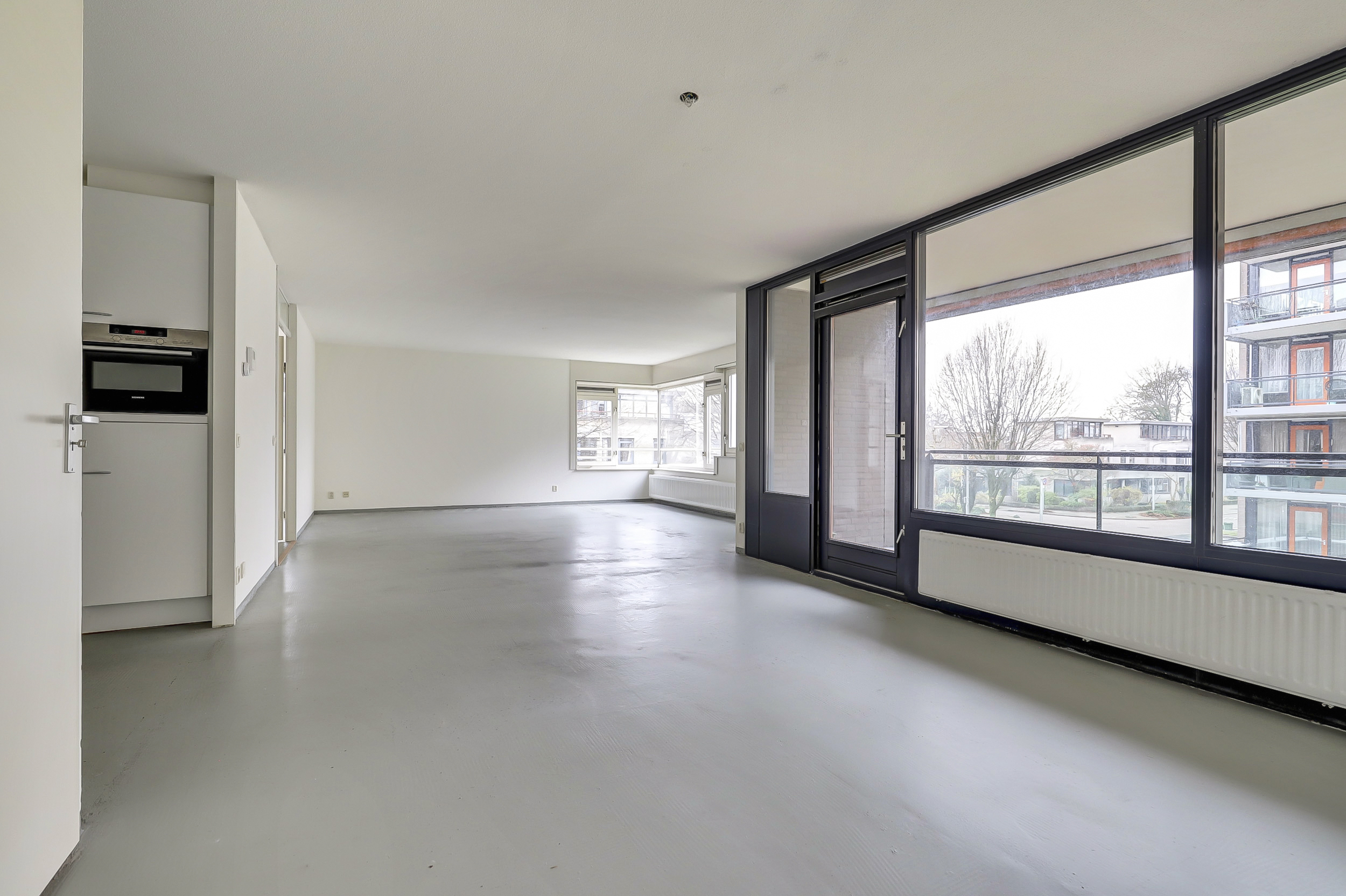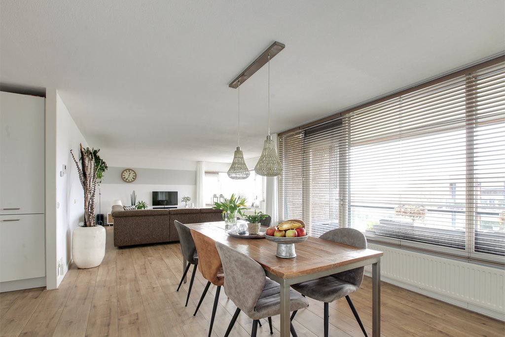 De lichte woonkamer (ca. 47 m2) geeft toegang tot het ruime balkon en tot de halfopen keuken voorzien van diverse inbouwapparatuur, te weten 4-pits gaskookplaat, afzuigkap, vaatwasser, koelkast en combi-magnetron. Er is plaats voor een ruime eettafel in het eetgedeelte en door de grote raampartij is het ook hier weer erg licht; kortom een heerlijke plekje om gezellig te tafelen. Het vertoeven op het balkon is geen straf; je kunt genieten van een mooi uitzicht over het park met de oude bomen.