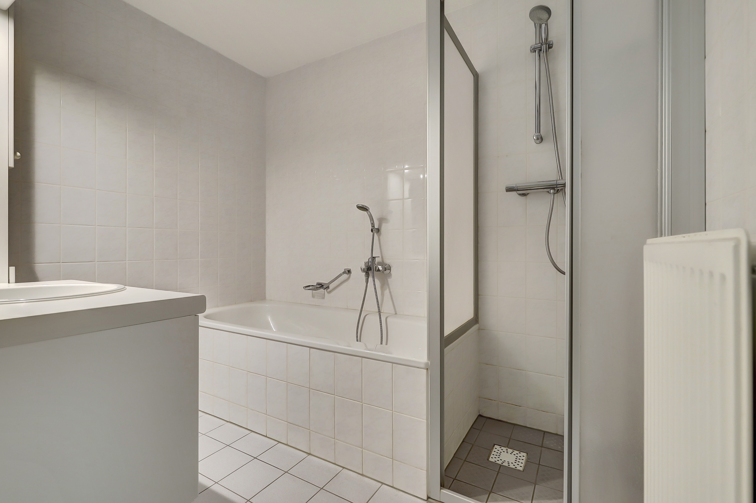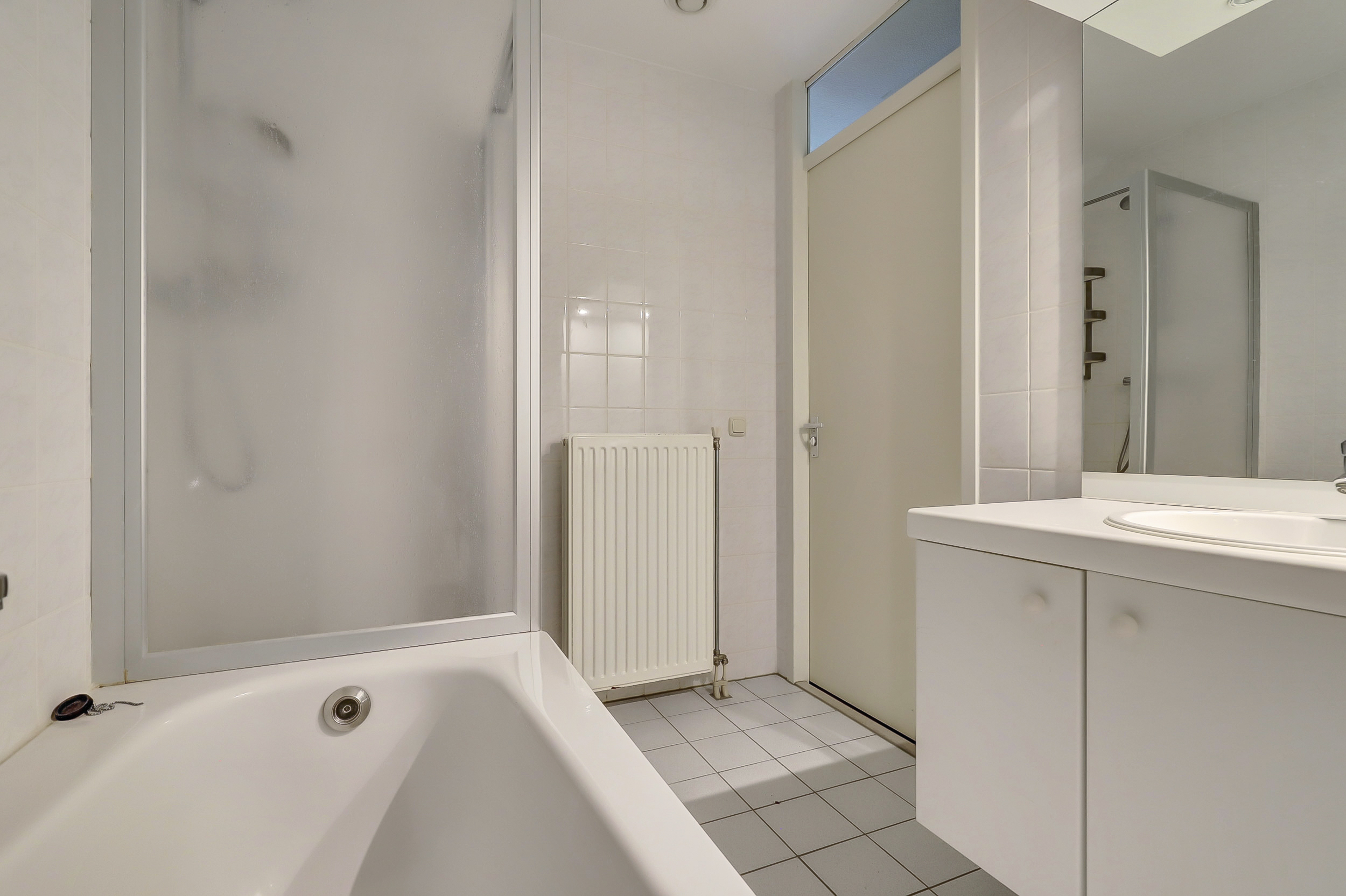 De badkamer is voorzien van een ligbad, douchecabine en wastafel met -meubel, uitgevoerd in een neutrale kleurstelling.