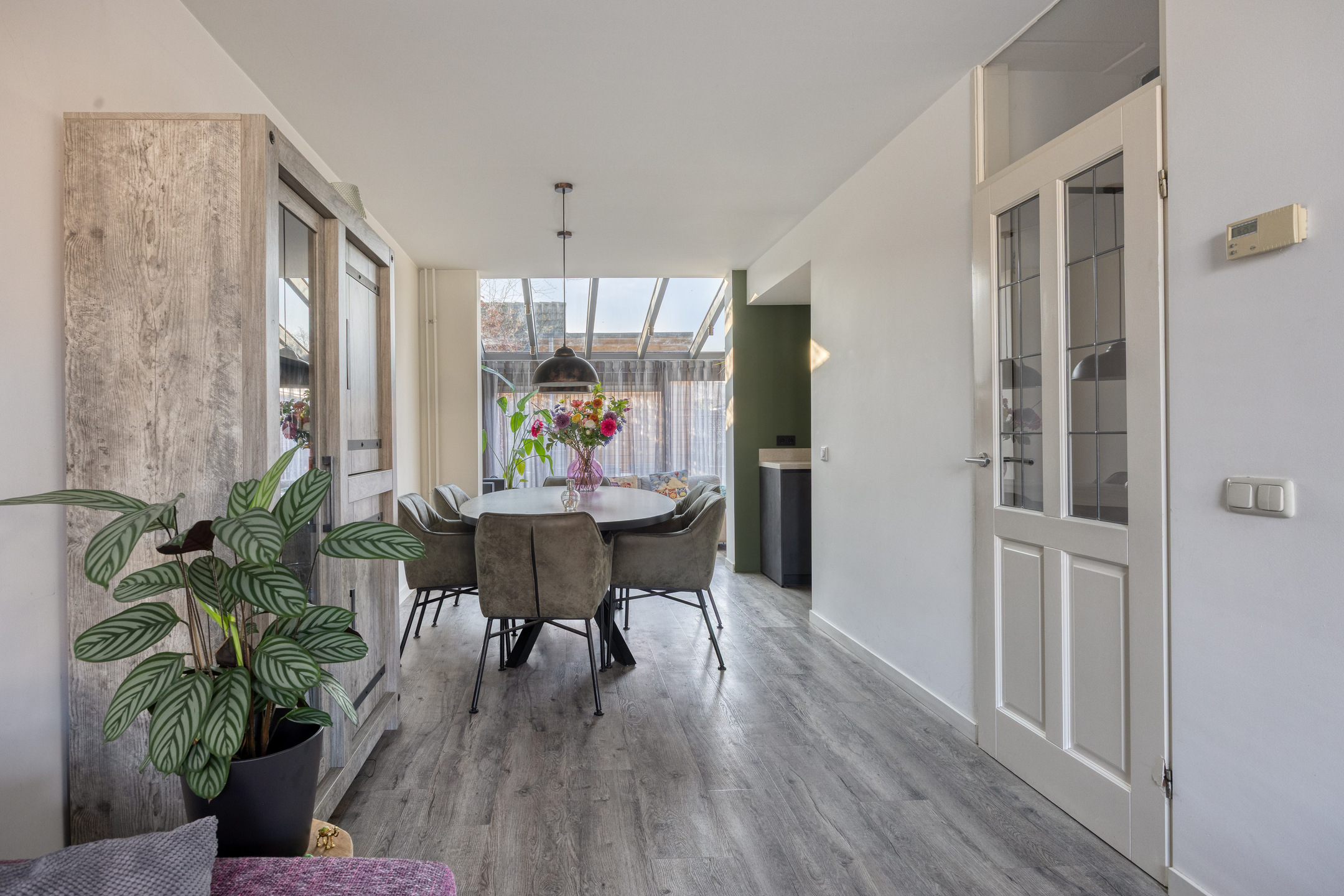 De begane grond voelt licht en ruim dankzij de grote raampartijen in de uibouw en de schuifpui naar de tuin. De L-vormige living biedt alle vrijheid voor een royale zithoek en een grote eettafel waar het dagelijks leven samenkomt. De moderne, compleet vernieuwde keuken staat in open verbinding met de living, waardoor koken en leven moeiteloos in elkaar overlopen.