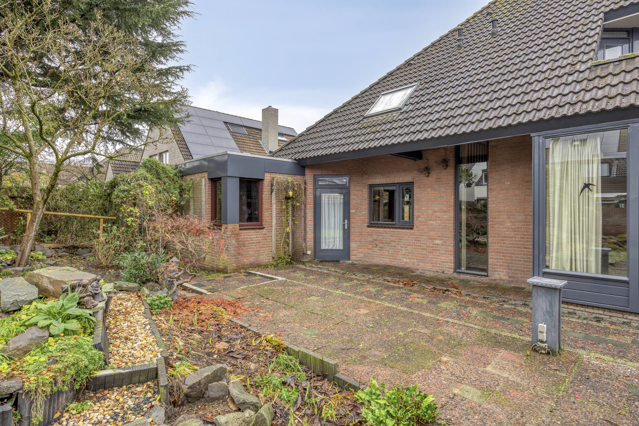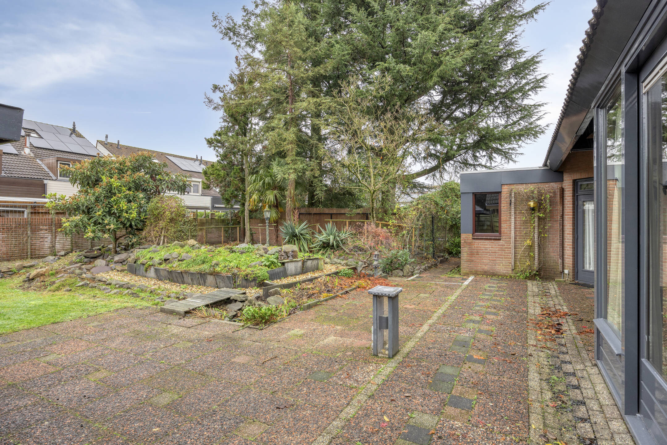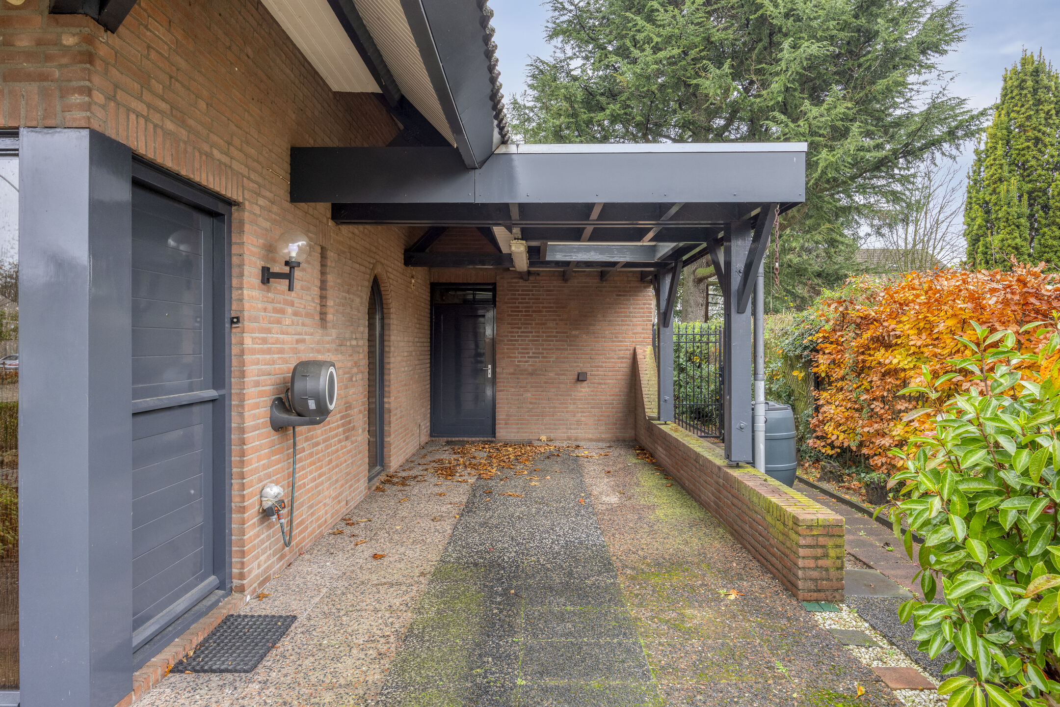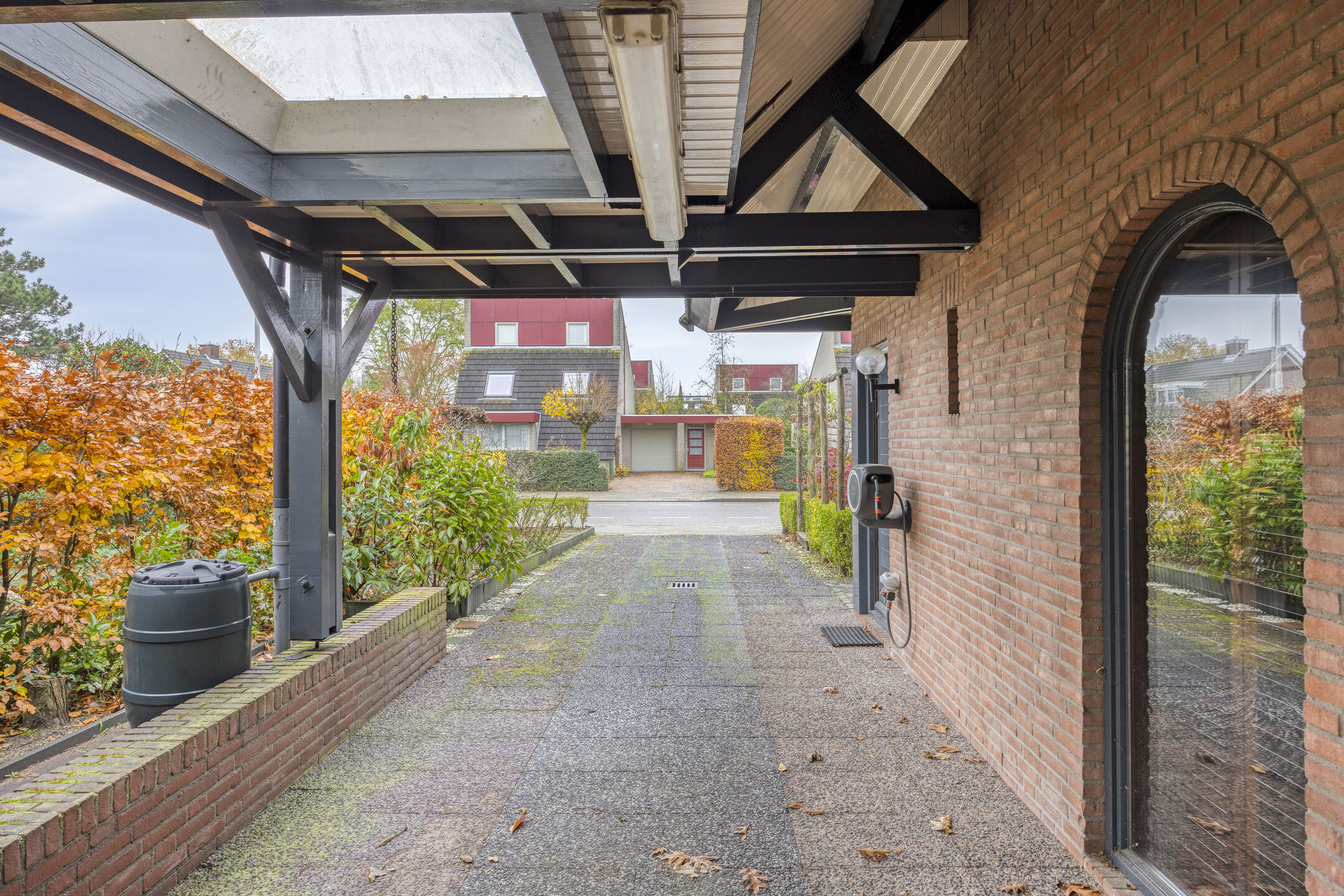 De tuin rondom is fraai aangelegd en biedt diverse plekken om van de zon of schaduw te genieten. Dankzij de ligging van de woning en het volwassen groen geniet je van optimale privacy. De carport met lichtkoepel bevindt zich aan de voorzijde en biedt ruimte om op eigen terrein te parkeren.