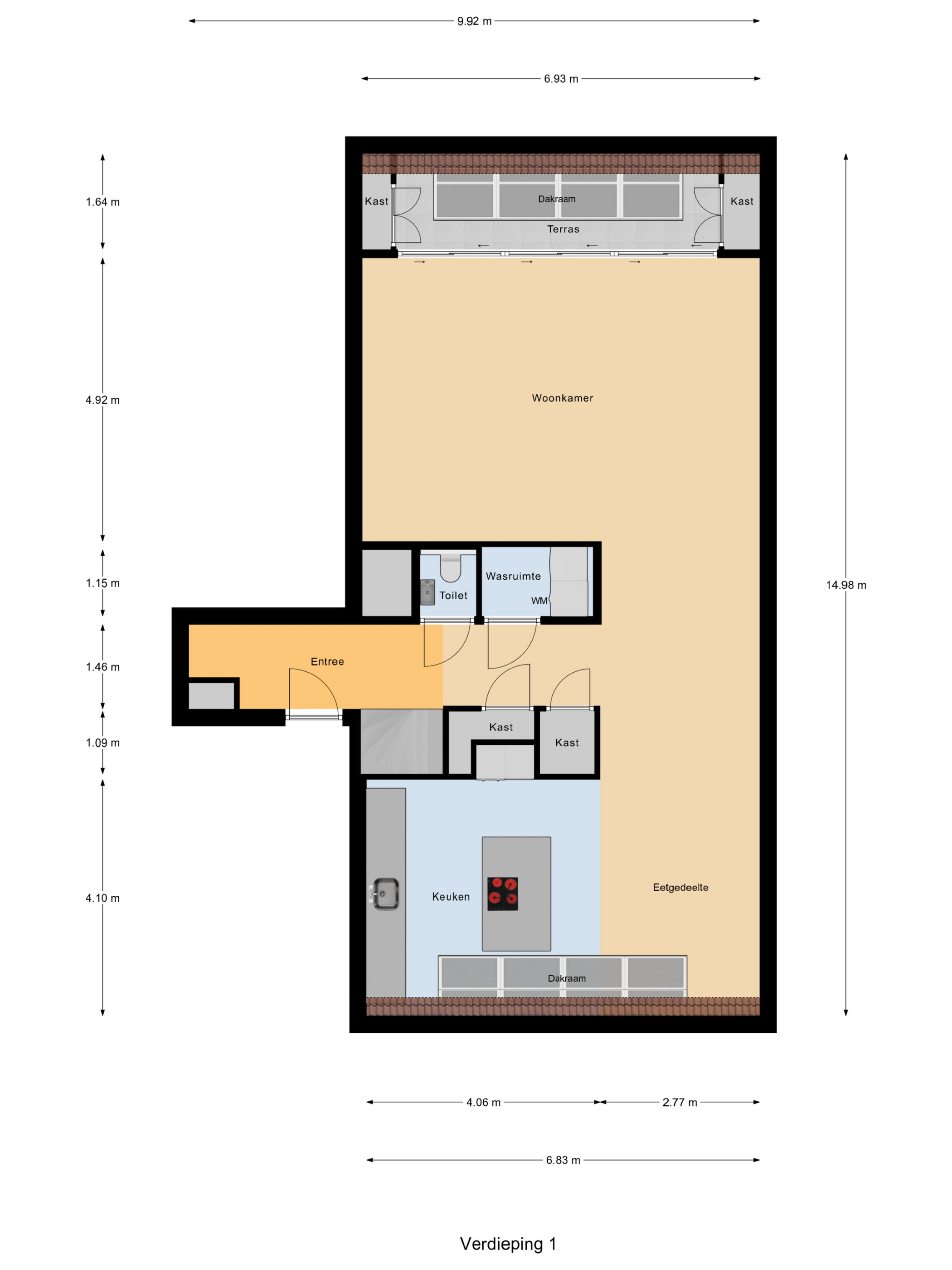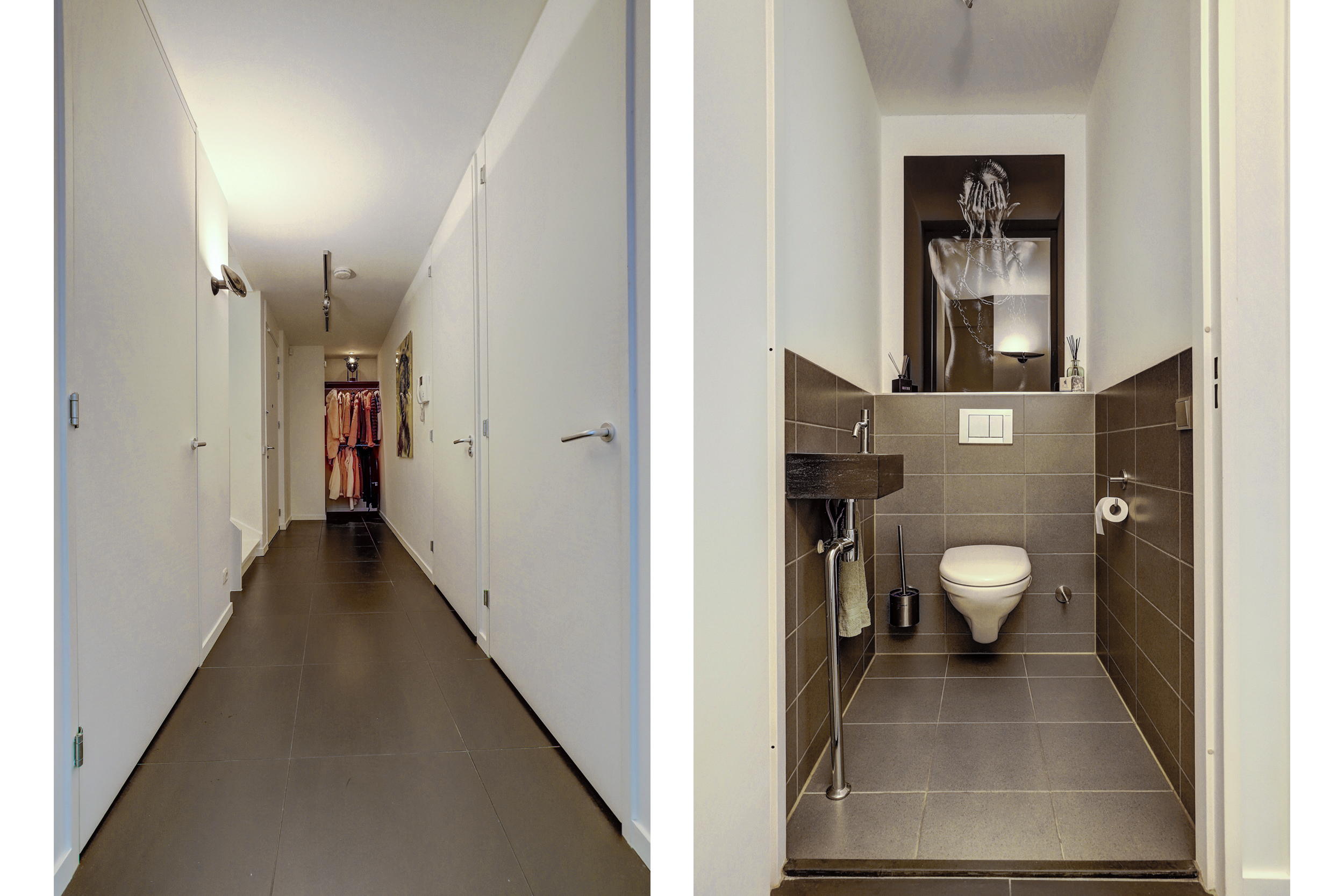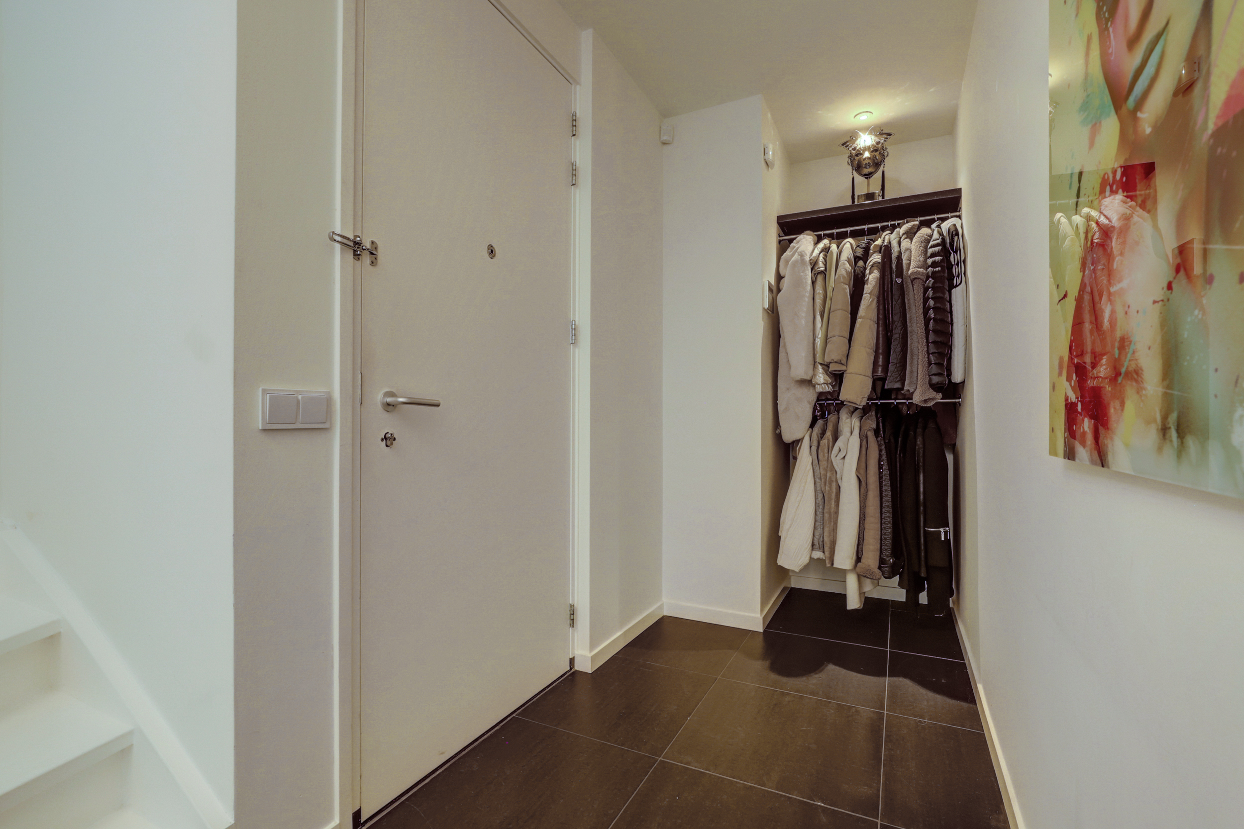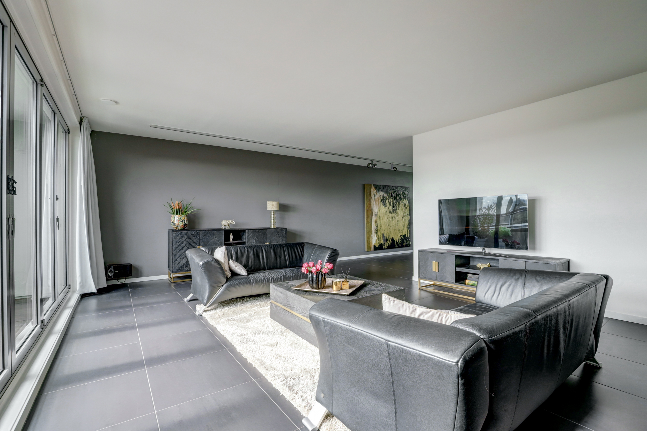 Je betreedt de woning via een ruime hal met garderobe en bergkast. Hier vind je ook de wasruimte, een tweede bergkast en het toilet met fontein. De royale woonkamer is heerlijk licht dankzij grote raampartijen en een schuifpui naar het zonneterras – een ideale plek voor een ontbijt in de zon of een borrel met uitzicht.