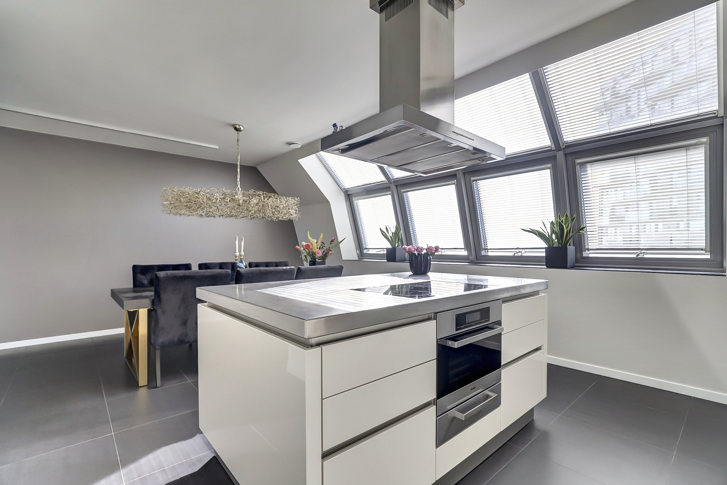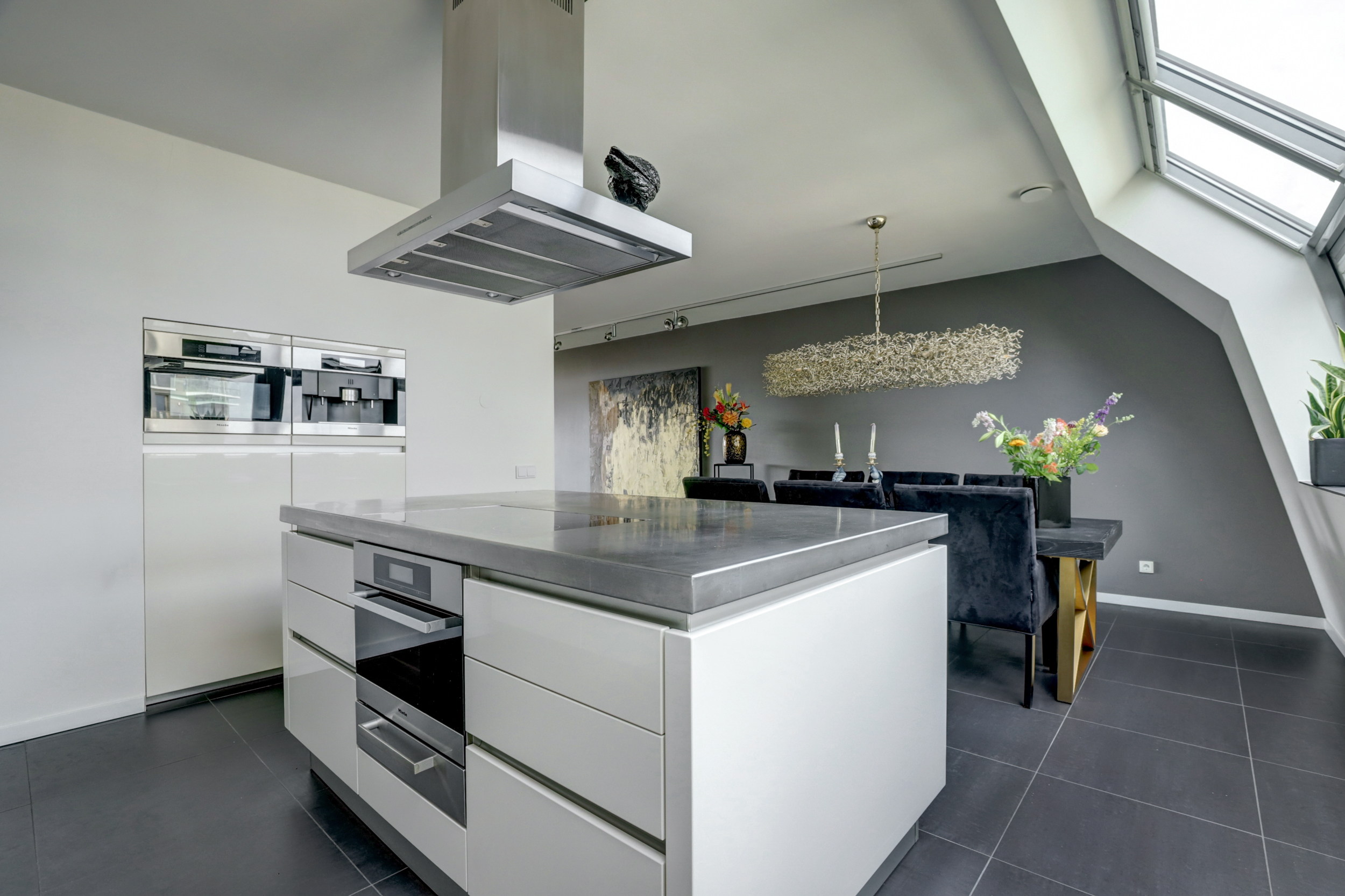 De open woonkeuken is een echte blikvanger: een groot kookeiland, luxe afwerking en compleet uitgerust met hoogwaardige Miele-apparatuur, waaronder een combimagnetron, koffiemachine, stoomoven, warmhoudlade, inductiekookplaat, vaatwasser, dubbele koelkast en spoelbak. Het eetgedeelte heeft meerdere raampartijen, waardoor je ook hier geniet van volop daglicht. Op deze verdieping ligt een fraaie plavuizenvloer met volledige vloerverwarming.