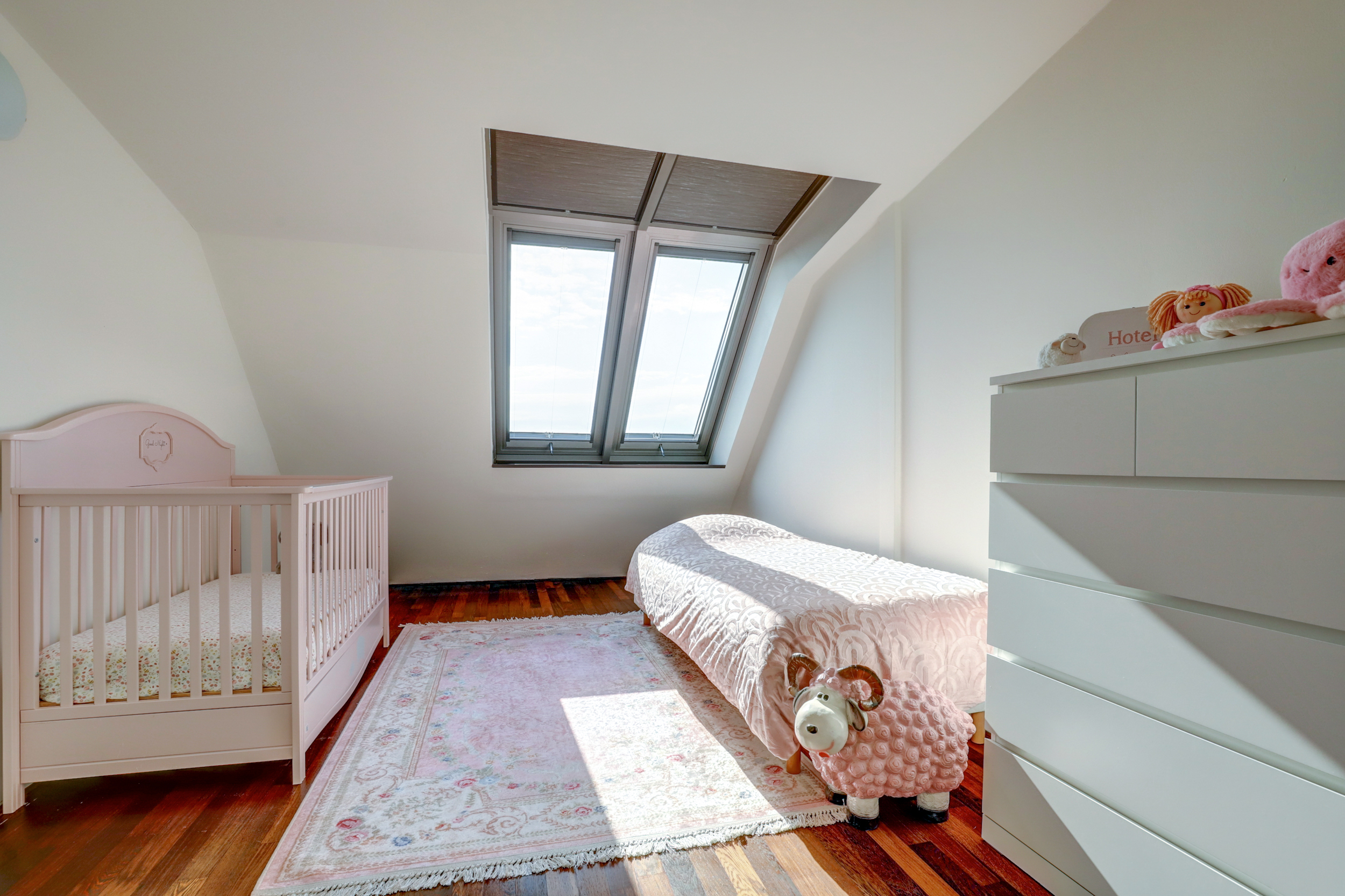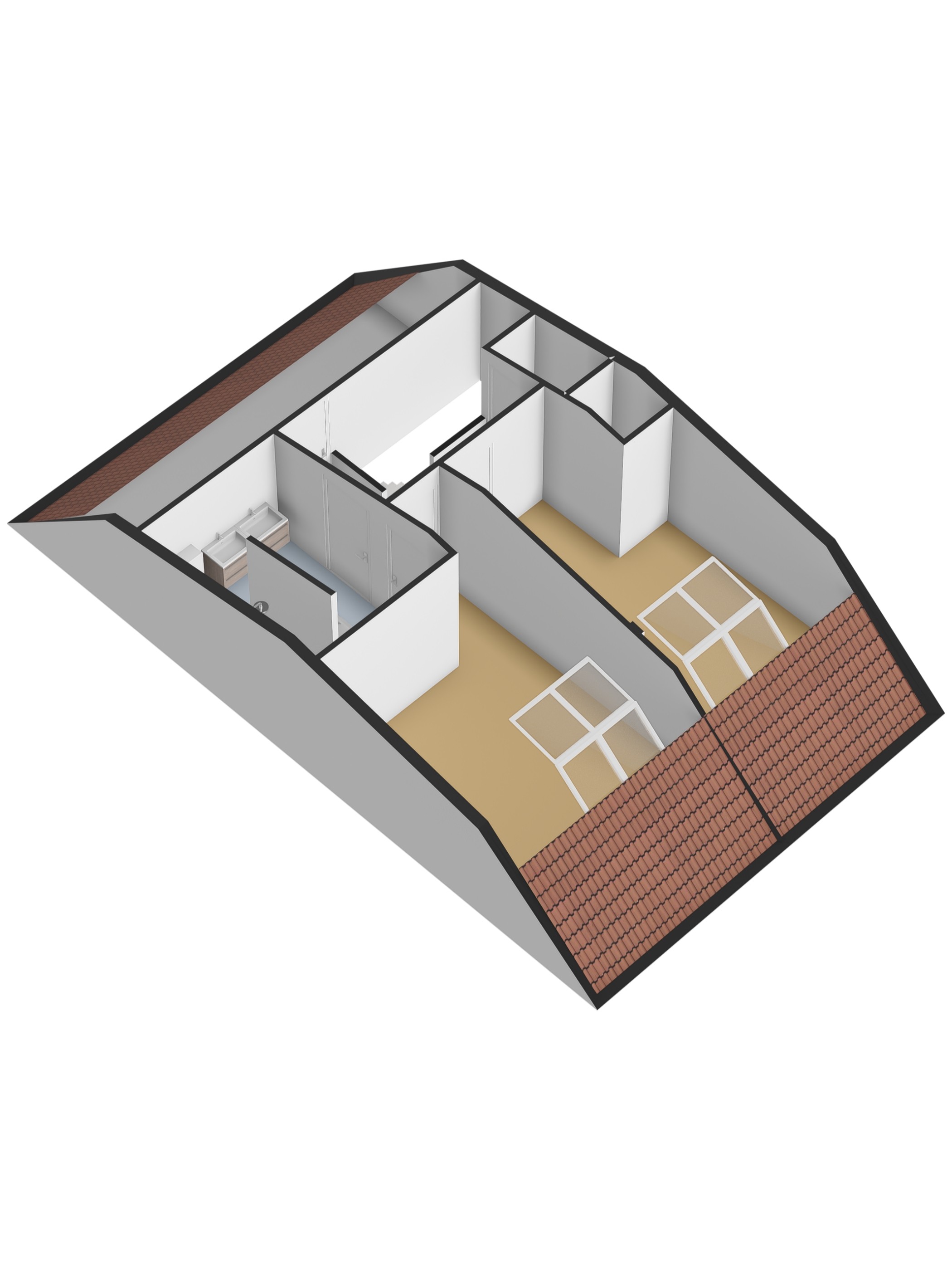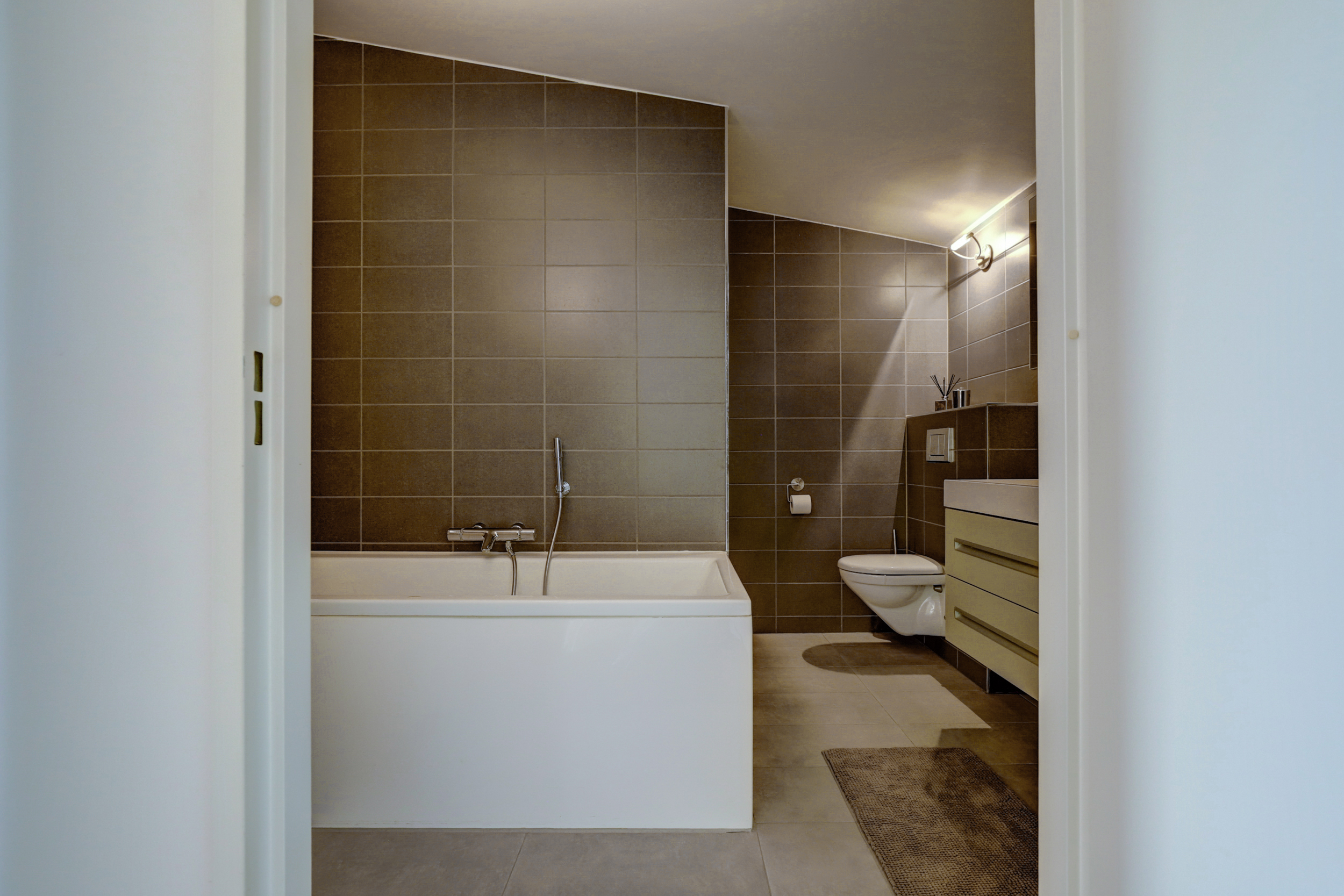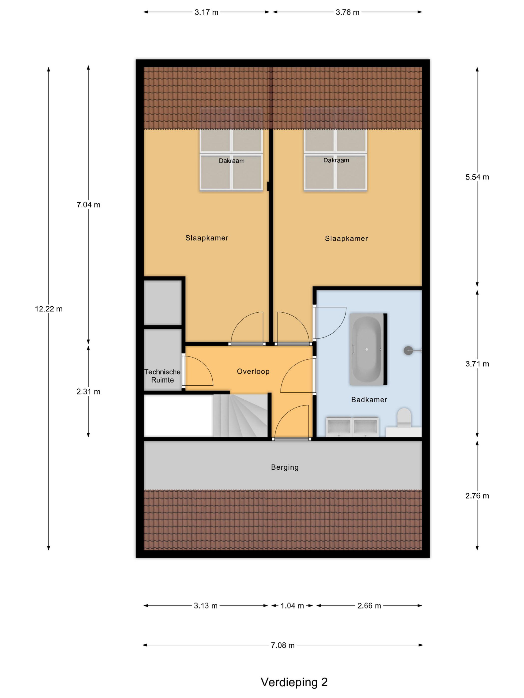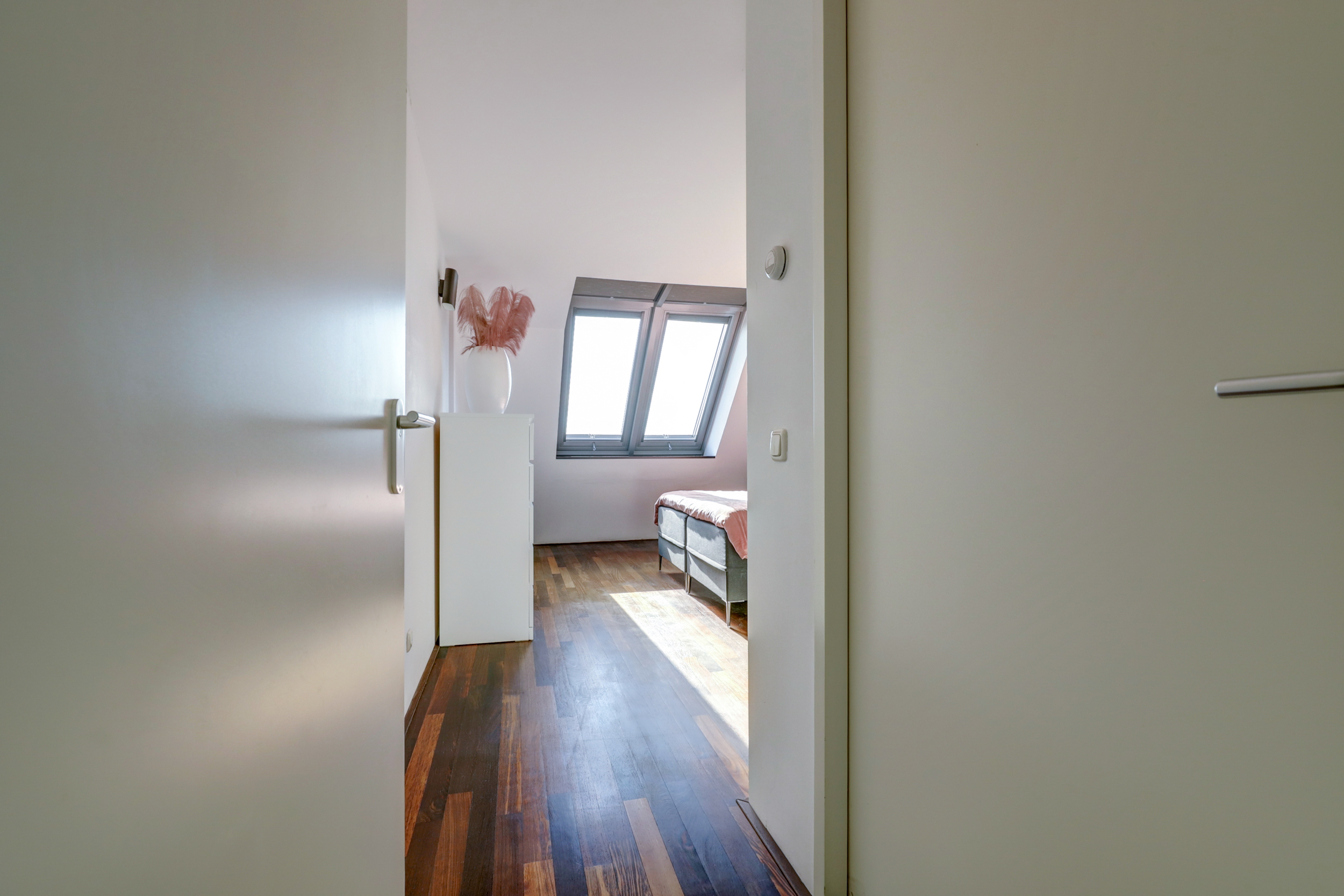 Via de trap bereik je de overloop, die toegang geeft tot twee ruime slaapkamers – beide voorzien van dakramen – en de badkamer. Deze badkamer is royaal opgezet en uitgerust met een ligbad, inloopdouche, tweede toilet, wastafelmeubel met dubbele kranen en vloerverwarming. Daarnaast is er op deze verdieping nog een bergruimte en een technische kast met o.a. de warmte-terugwininstallatie. Op deze verdieping ligt een parketvloer, eveneens met volledige vloerverwarming.
