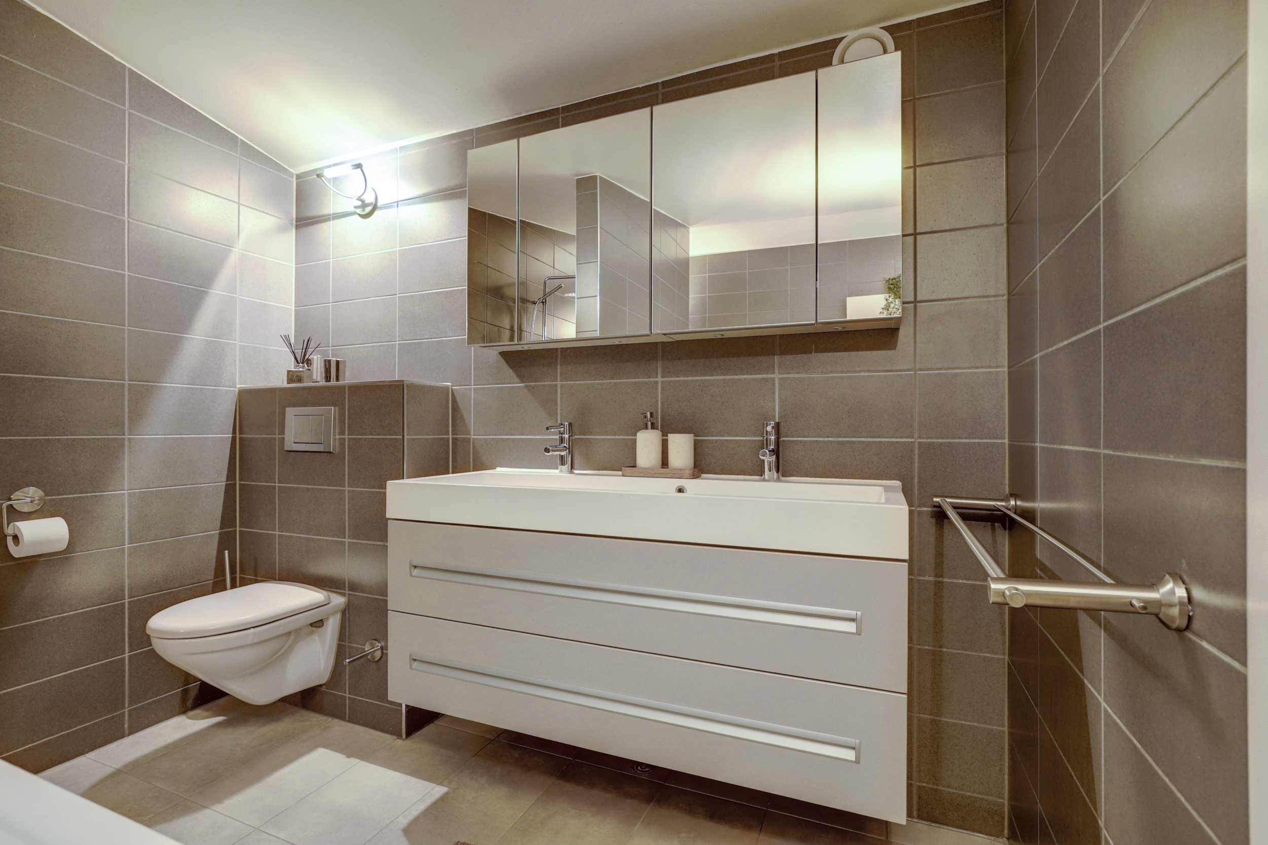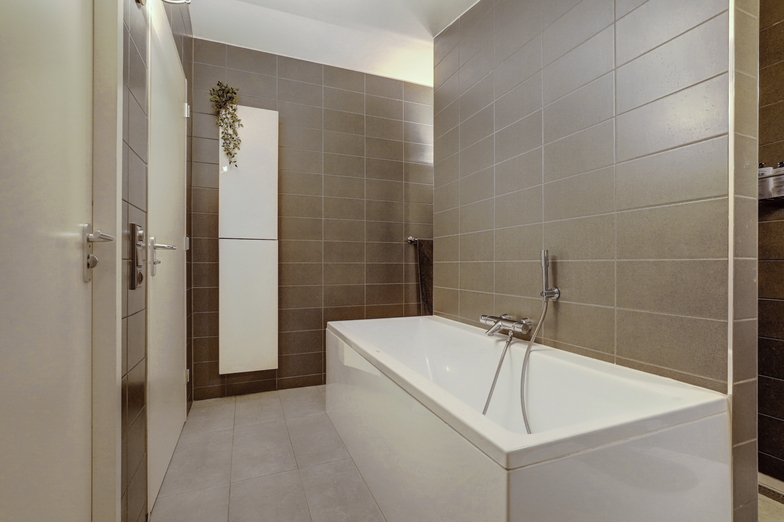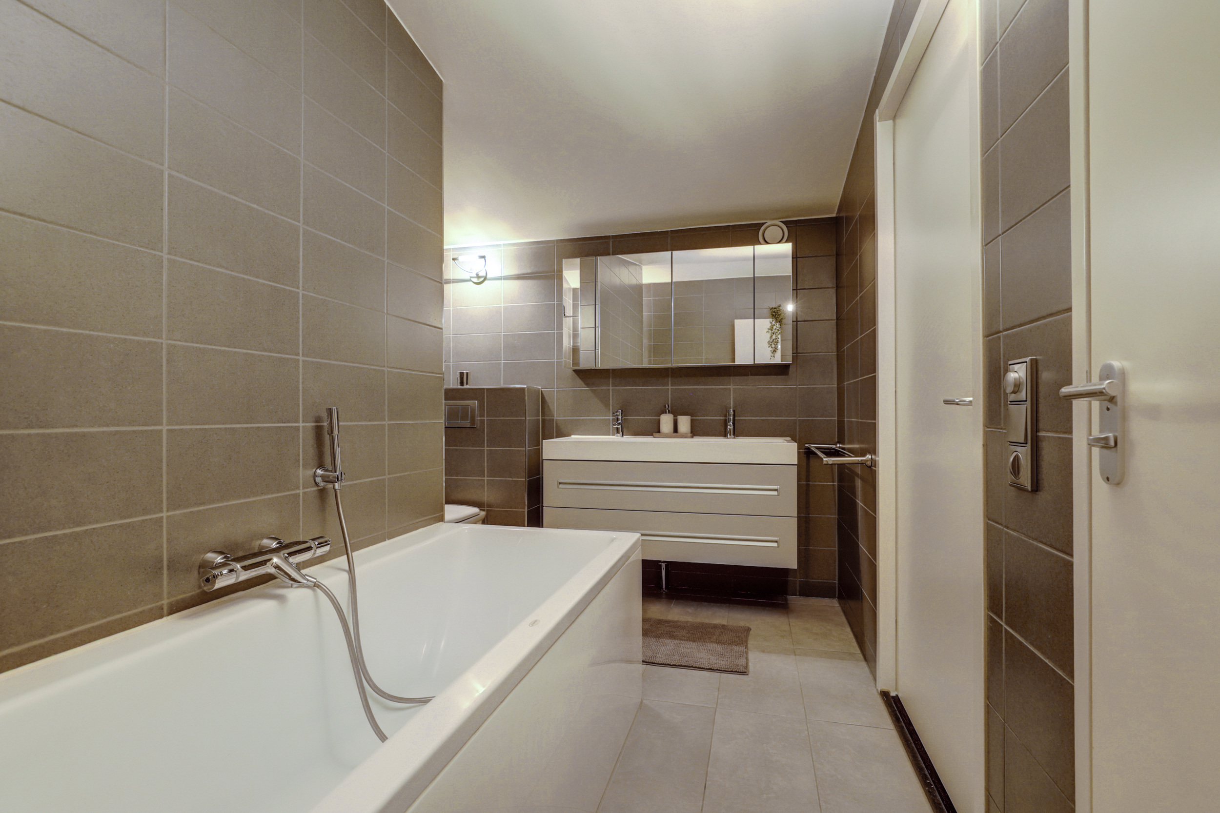 + Royale badkamer met ligbad, inloopdouche, dubbele wastafel en vloerverwarming;
