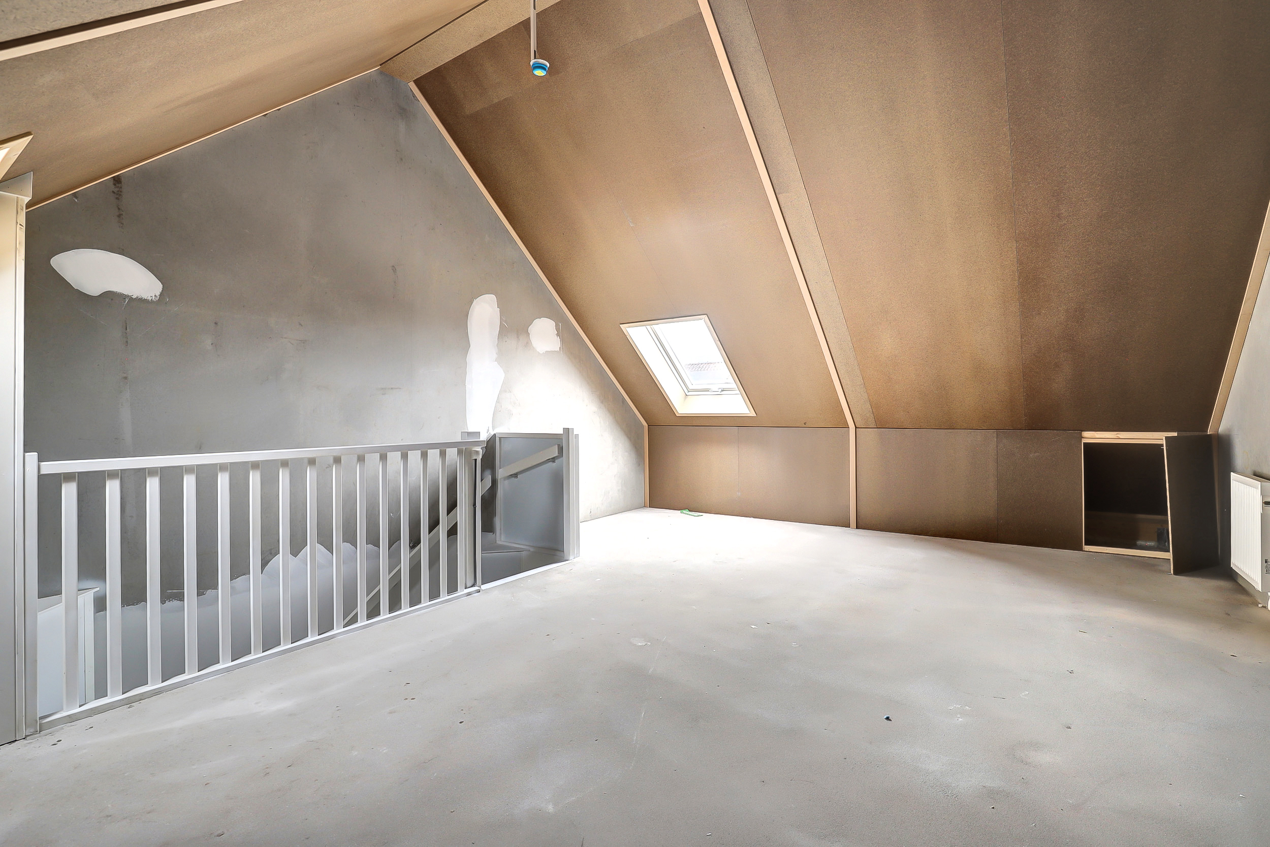 De zolderverdieping is bereikbaar via een vaste trap en biedt verrassend veel extra ruimte. Hier bevinden zich het dakraam, de witgoedaansluitingen, de omvormer van de zonnepanelen en het ventilatiesysteem. Een perfecte plek voor een thuiskantoor, hobbyruimte of opslag.