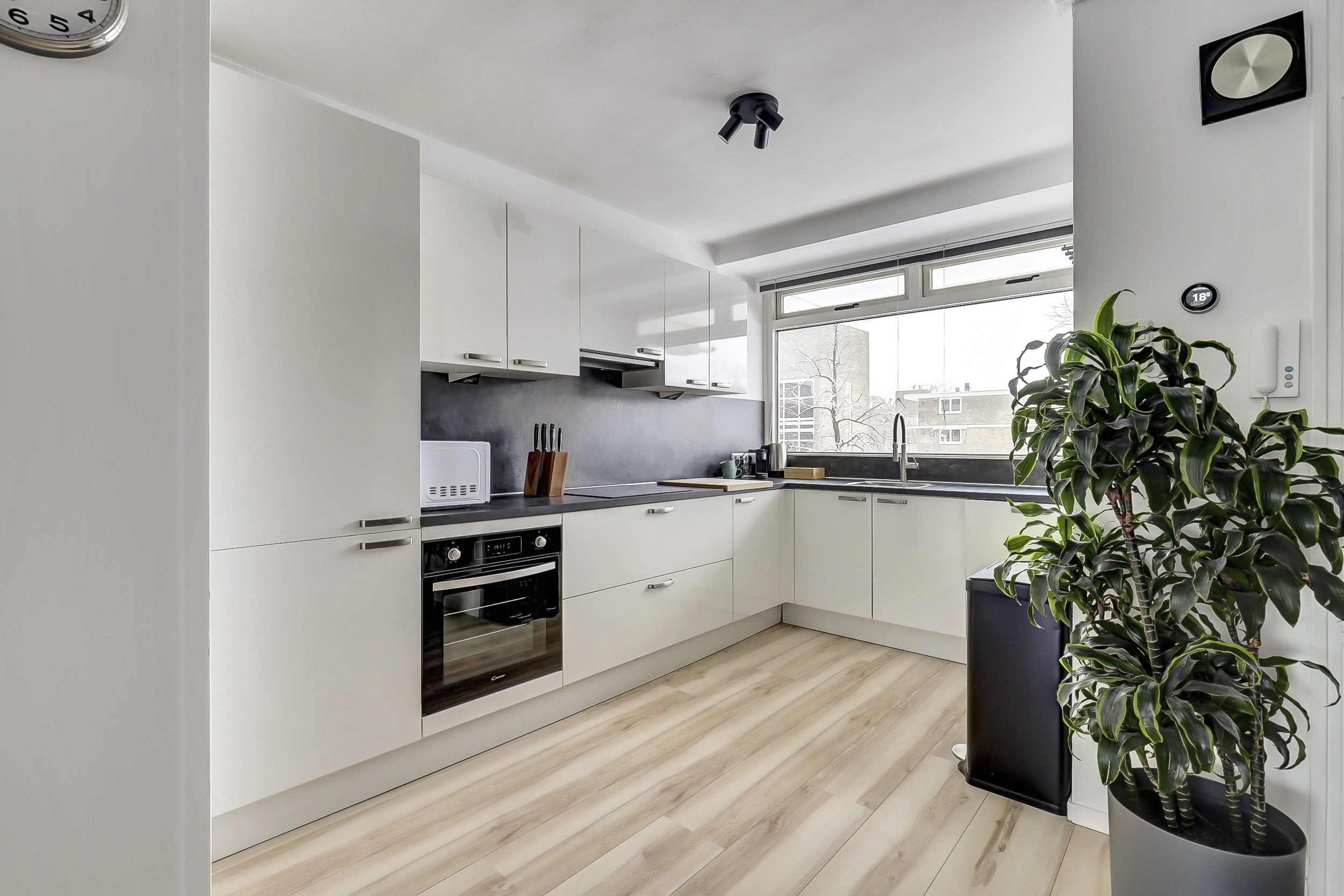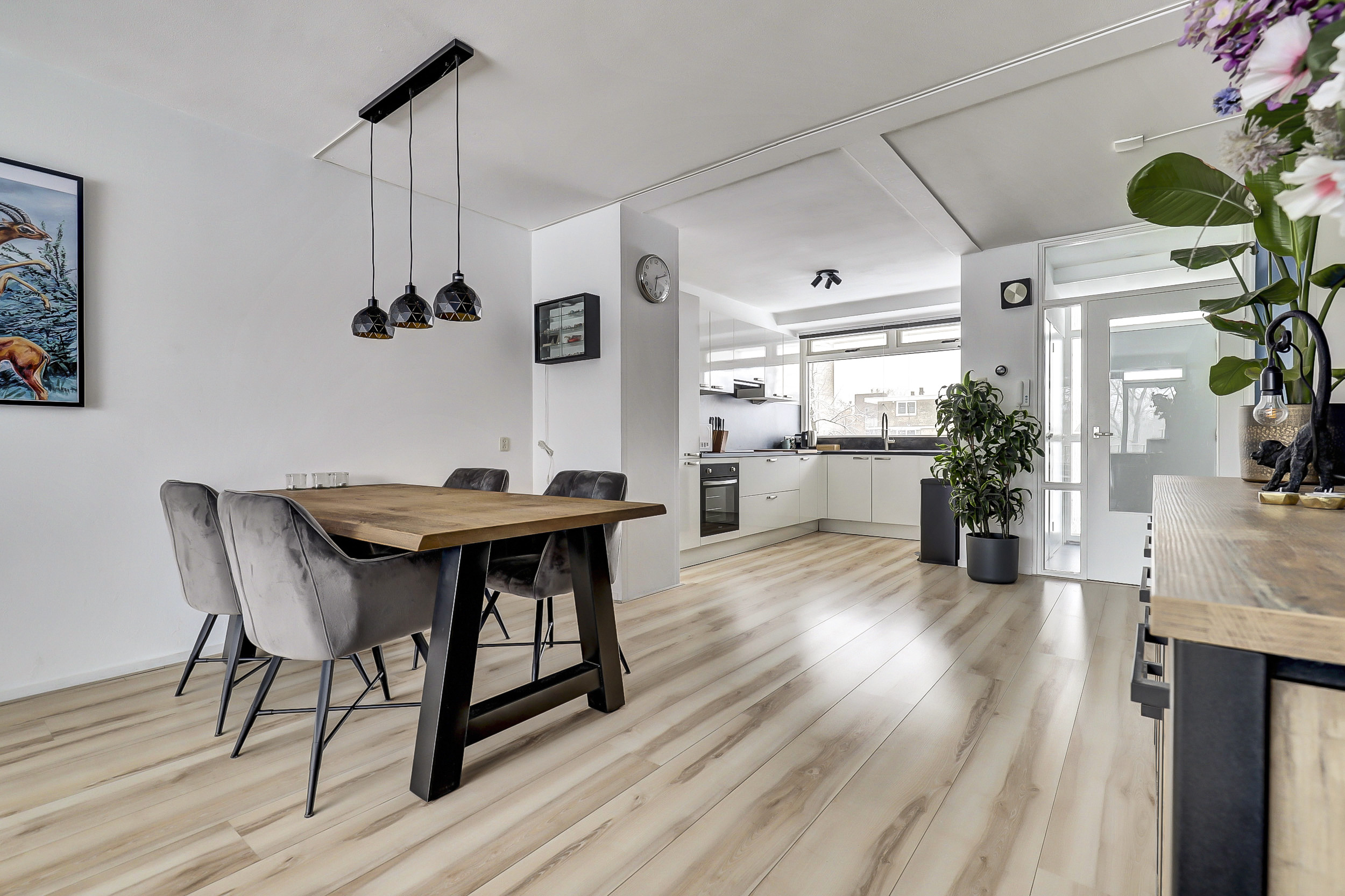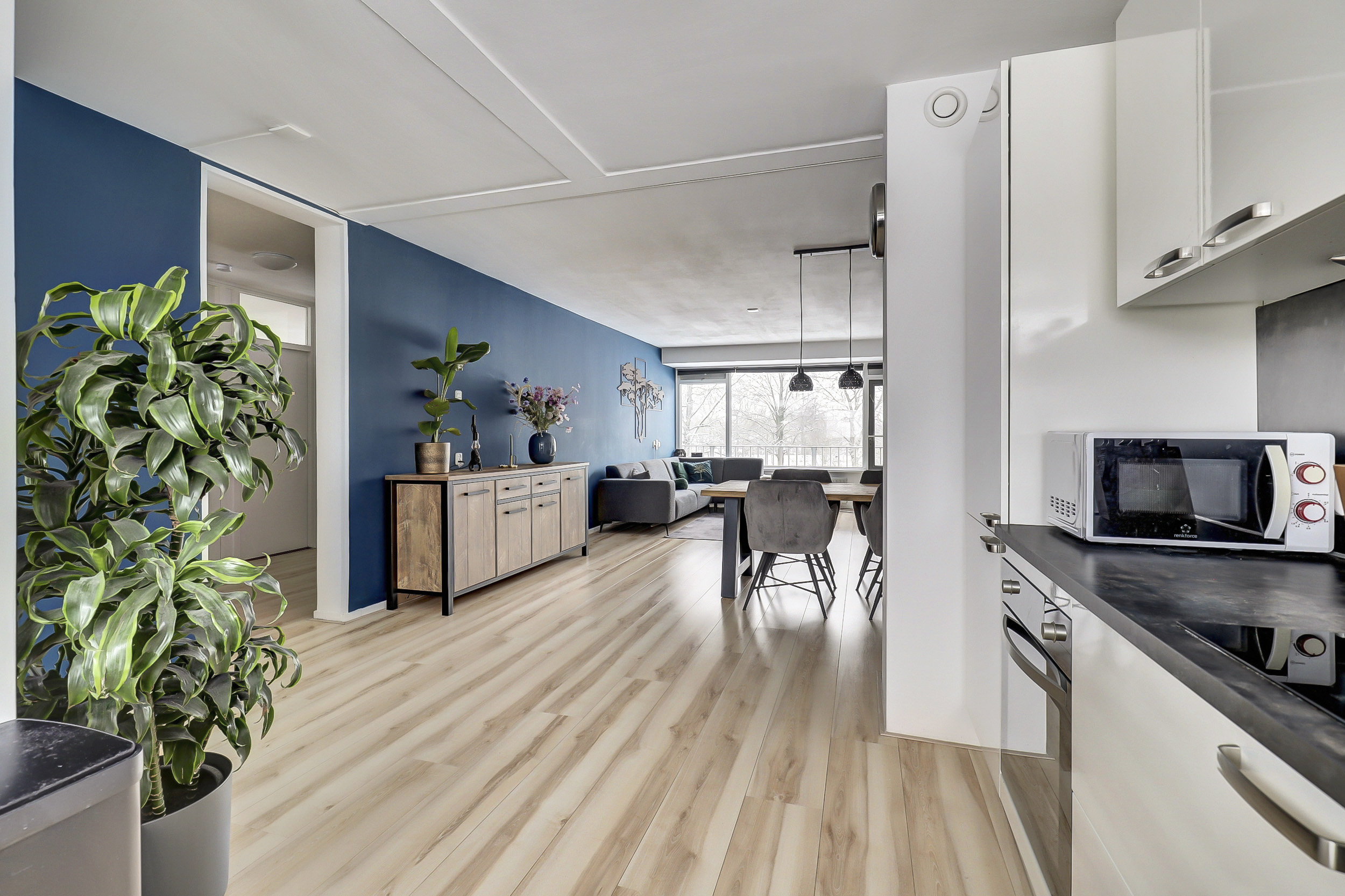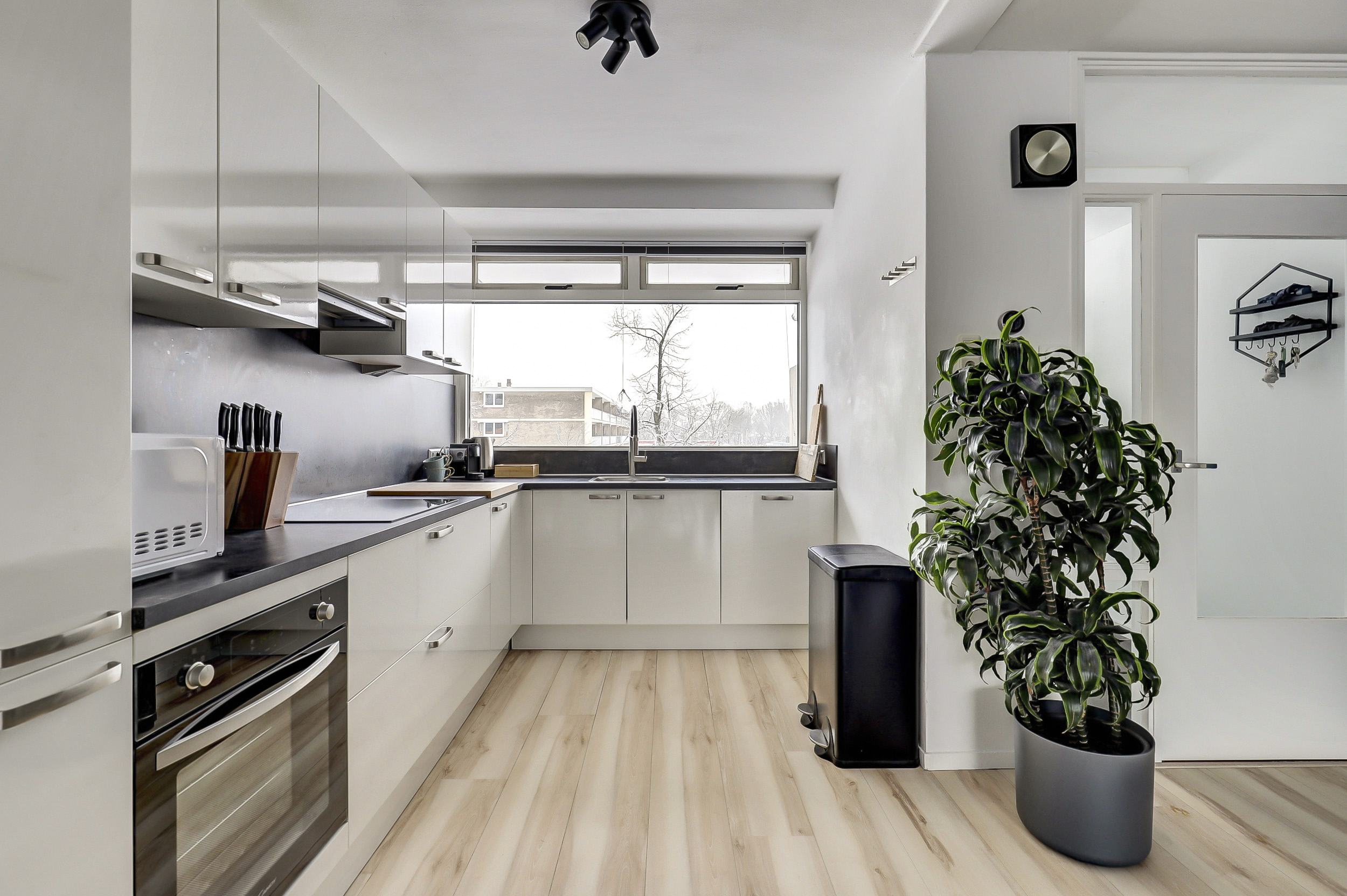 De open keuken sluit direct aan op de woonkamer en is van alle gemakken voorzien. Je vindt hier onder andere een inductiekookplaat, afzuigkap, oven (2025), vaatwasser, koelkast en vriezer. Het grote raam boven het werkblad brengt extra licht de keuken in.