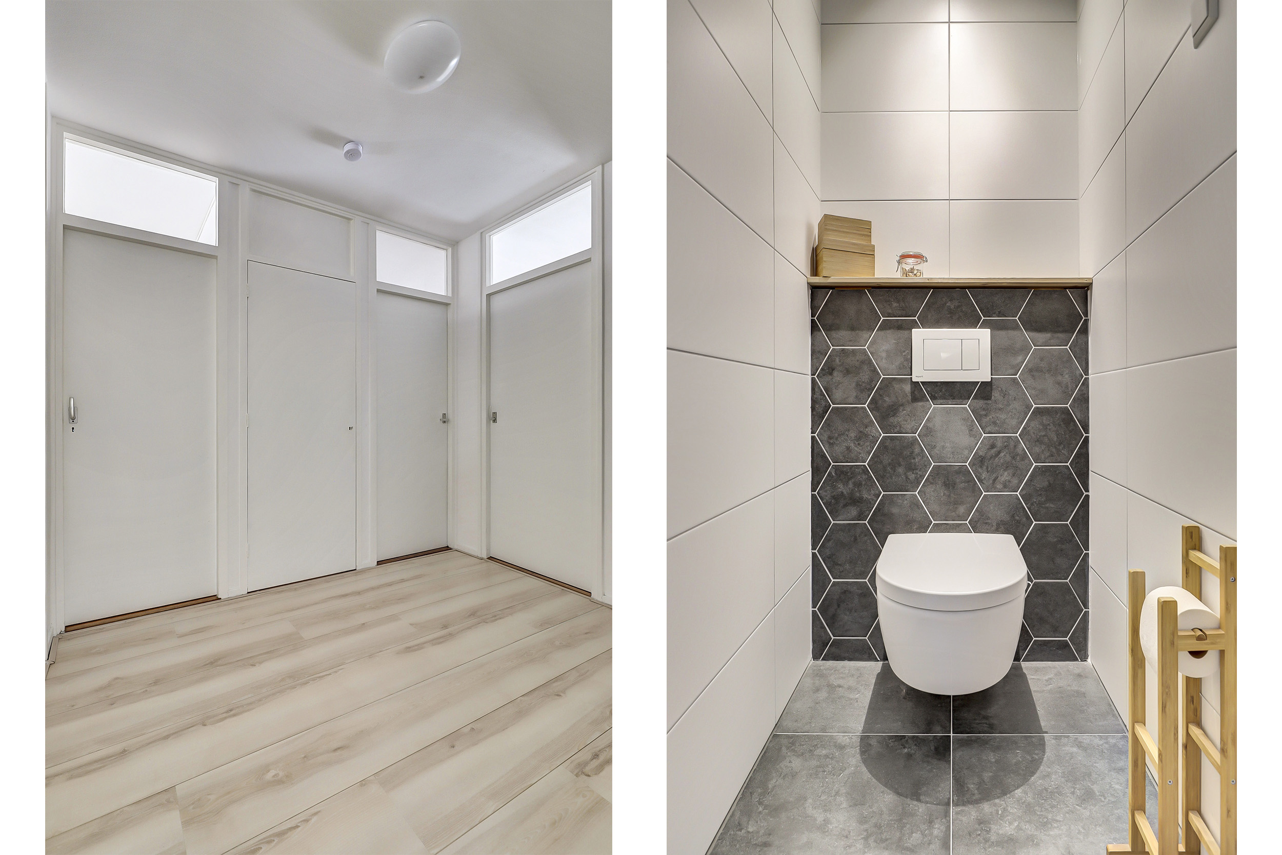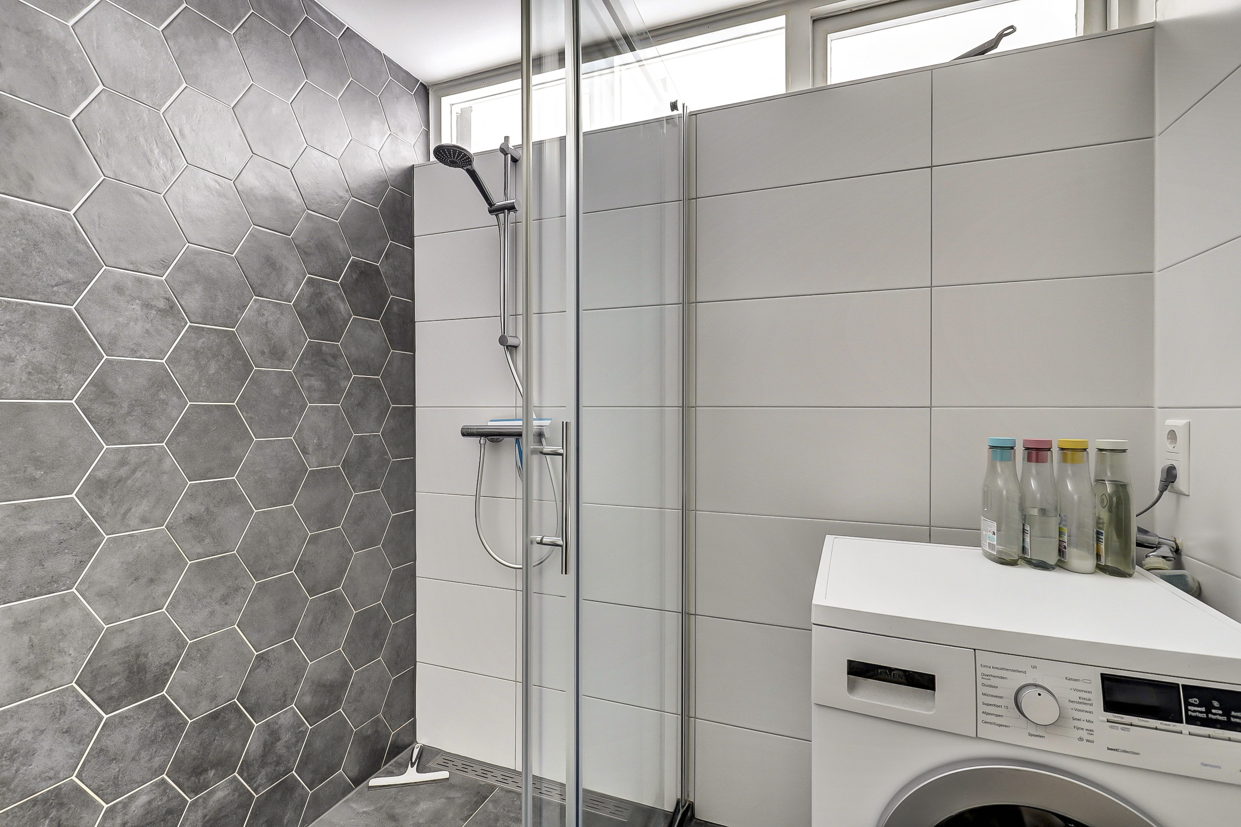 Aan de galerijzijde bevindt zich de modern ingerichte badkamer met een royale doucheruimte, een stijlvol wastafelmeubel met handige wandkast ernaast en de wasmachine-aansluiting. Prettig is dat het (zwevend) toilet separaat geplaatst, ook deze ruimte is modern en strak afgewerkt.